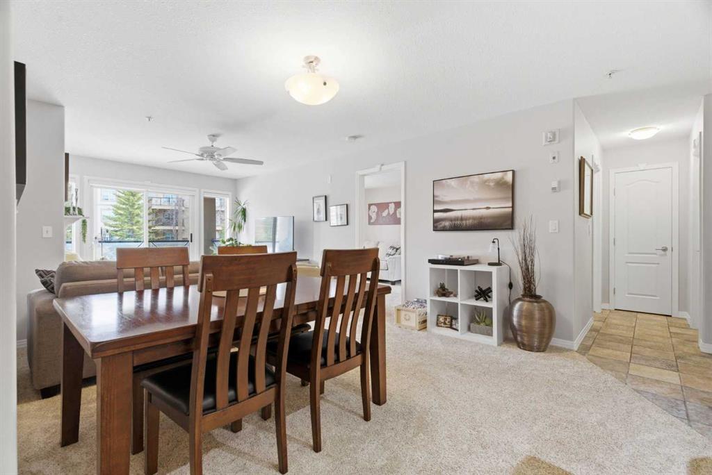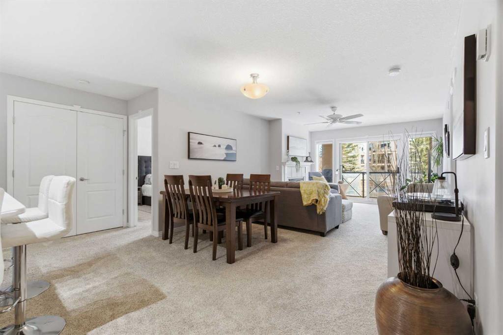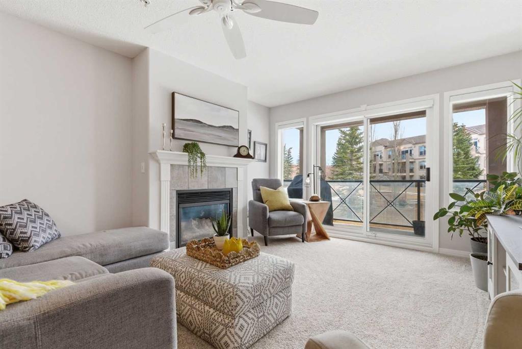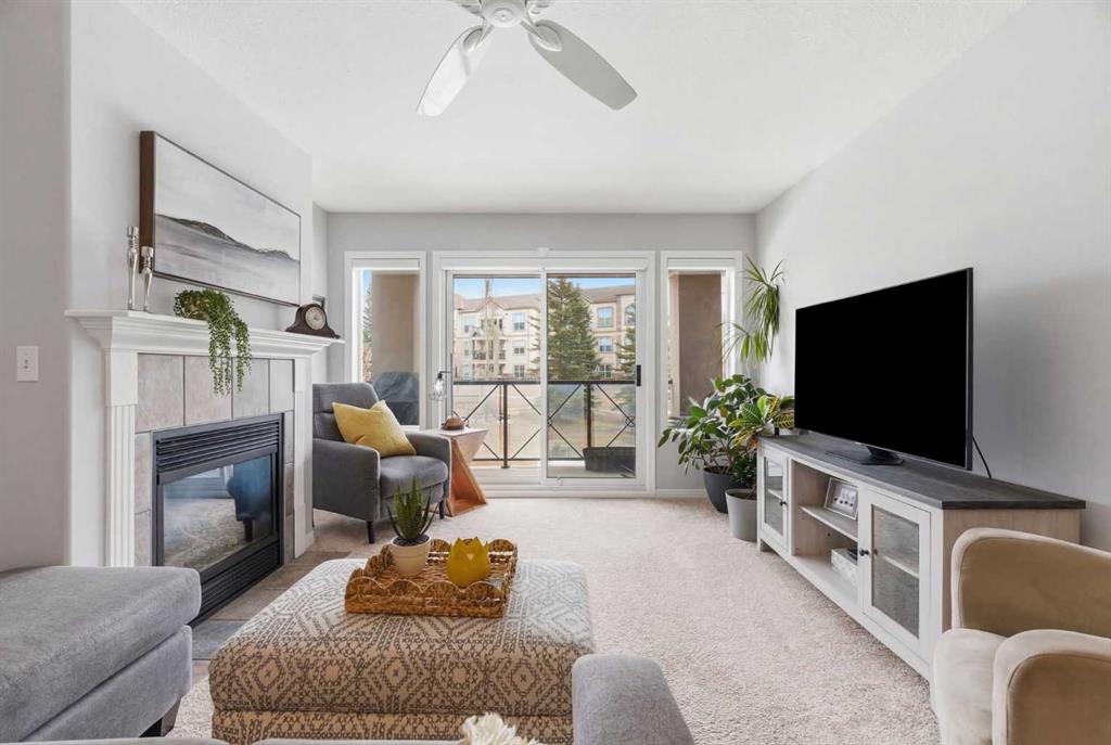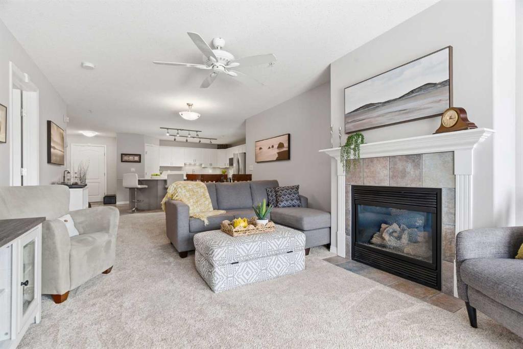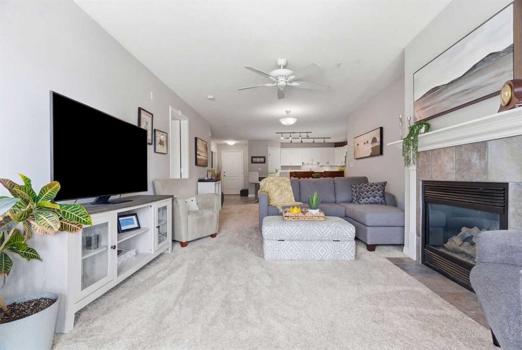 The open-concept living and dining area flows effortlessly to your large private balcony, where you can relax with your morning coffee and enjoy the peaceful fountain views below. A cozy gas fireplace with tile surround makes the living room the perfect place to unwind on cooler evenings.