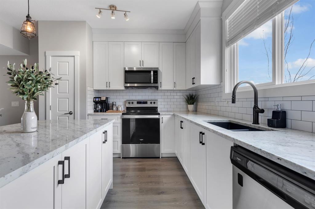Discover elevated living in this beautifully designed townhome located in the heart of Sage Hill NW Calgary. Situated just steps away from a family-friendly playground, this property offers a rare blend of luxury, functionality, and community charm. Featuring a double master bedroom plan with dual ensuites this 2 Bedroom, 2.5 Baths design plan offers over 1,200+ square feet of luxury low maintenance living. This home features builder upgrades throughout featuring sleek granite countertops, custom shaker style designer cabinetry, premium vinyl plank flooring, high ceilings, stainless steel appliance package, full tile to ceiling around all baths/showers, and glass panelled balcony with gas-line for BBQ. This home blends together he perfect mix of modern style with at home comfort. This homes open floor plan offers natural light through large windows on every level, creating bright and welcoming spaces that feel like home from the moment you walk in.Enjoy the convenience of an attached double car (tandem) garage + full length drive way fro 3 car total parking as well as ease of access along Sage Bluff Gate for additional guest parking. Whether you're entertaining or relaxing, the open-concept layout and thoughtfully designed living areas make this home a standout choice. Offering exceptional value in one of Calgarys premier NW communities and providing quick and easy access to nearby shopping, public transit routes, park & playground spaces, and walking and bike trails this is an opportunity not to be missed!