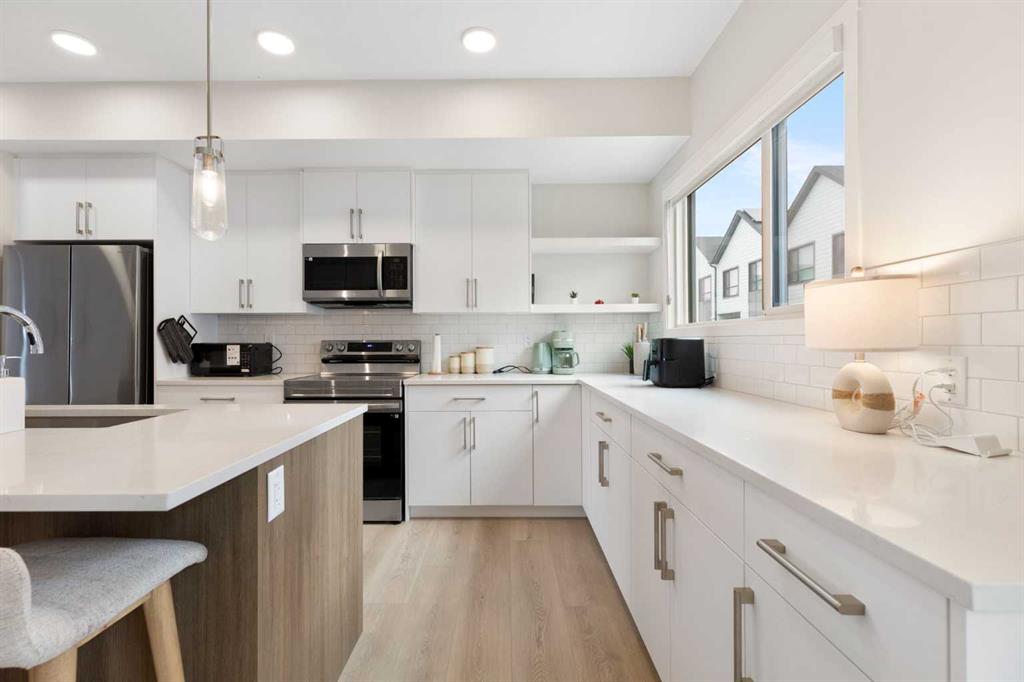 SETON SERENITY, one of Calgary’s most sought-after developments, built by CedarGlen Living—winner of the CustomerInsight Builder of Choice Award for 5 consecutive years. Welcome to this spacious 1,711 sq.ft. RMS (1,805 sq.ft. builder size) 3-bedroom, 2.5-bath townhome featuring an open-concept layout, 9' ceilings, and LVP flooring throughout the main living level. Perfectly positioned directly facing the pond, this home offers beautiful open views right at your doorstep, creating a peaceful and premium living environment. The south-facing exposure fills the home with abundant natural light throughout the day, making it bright, warm, and energy-efficient—helping reduce utility costs year-round. The kitchen is thoughtfully designed with full-height cabinetry, quartz countertops, subway tile backsplash, undermount sink, and stainless steel appliances. The oversized island flows seamlessly into the spacious living and dining areas—ideal for everyday living and entertaining. The primary bedroom features a generous walk-in closet, quartz countertops, dual sinks, and a stand-up shower. Additional bedrooms are perfect for family, guests, or a home office. The upper level also includes convenient laundry (washer & dryer included) and a 4-piece bathroom with quartz counters and a tub/shower combo. A double side-by-side garage keeps your vehicles secure and protected in all seasons. Enjoy exceptional amenities just steps away, including the world’s largest YMCA, Seton HOA, South Health Campus, shopping, restaurants, and cafes. Pet-friendly complex. Move-in ready with immediate possession available. Virtual tour available.