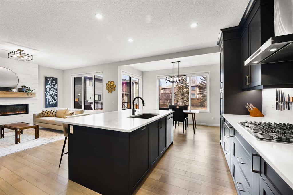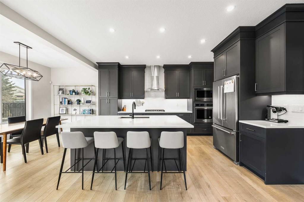 Step inside and be greeted by 9-foot ceilings and stylish vinyl plank flooring throughout the main level. The bright East-facing Living room with electric fireplace creates a warm, inviting atmosphere flooded with natural light. The modern gourmet Kitchen boasts quartz countertops, full-height cabinetry with soft-close features, stainless steel appliances including built-in gas cooktop, wall oven, and microwave, a breakfast bar from the centre island, and a walk-through pantry for ample storage. The adjacent Dining room provides the perfect space for family meals and entertaining. A Mudroom with built-in bench and coat hooks adds everyday convenience, and a powder room completes the main level. Custom exterior gemstone lighting adds sophisticated curb appeal and can be controlled via smartphone.