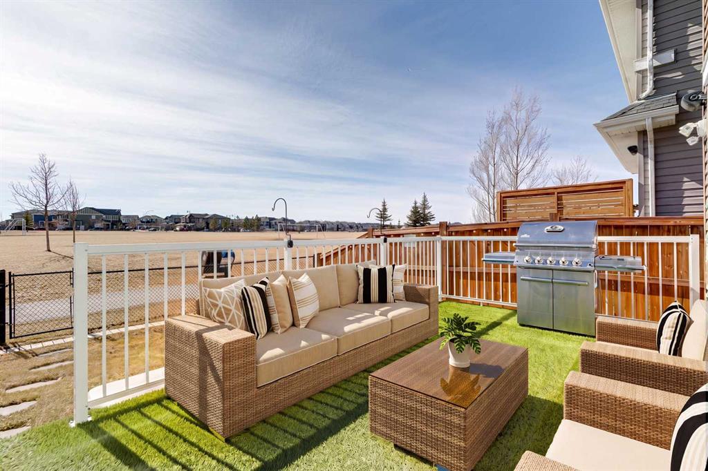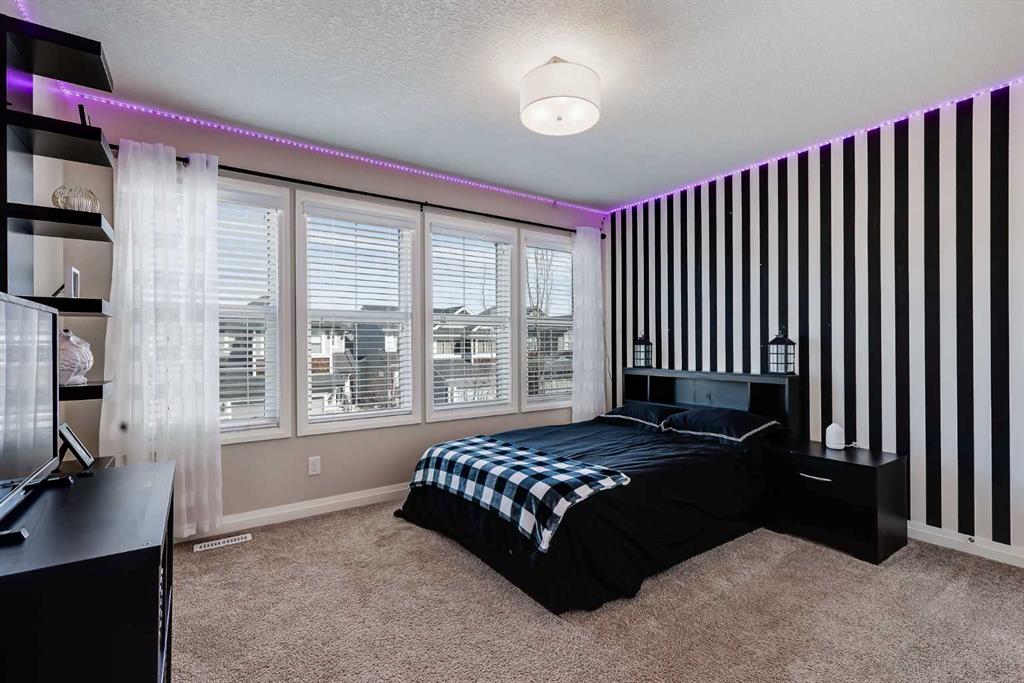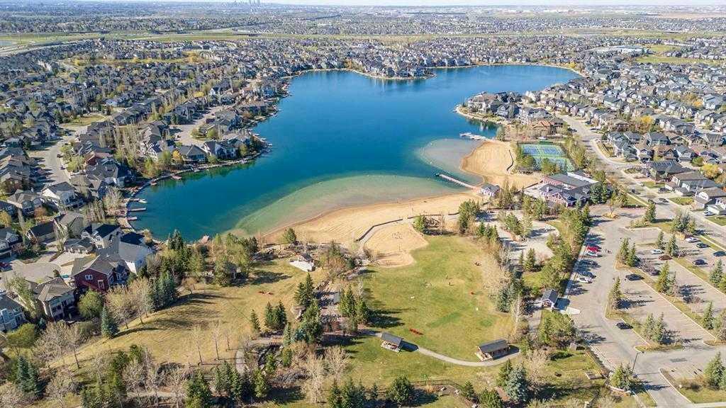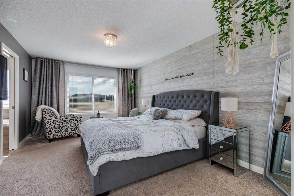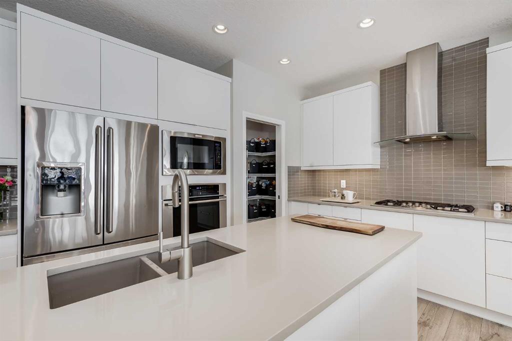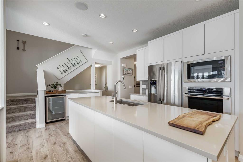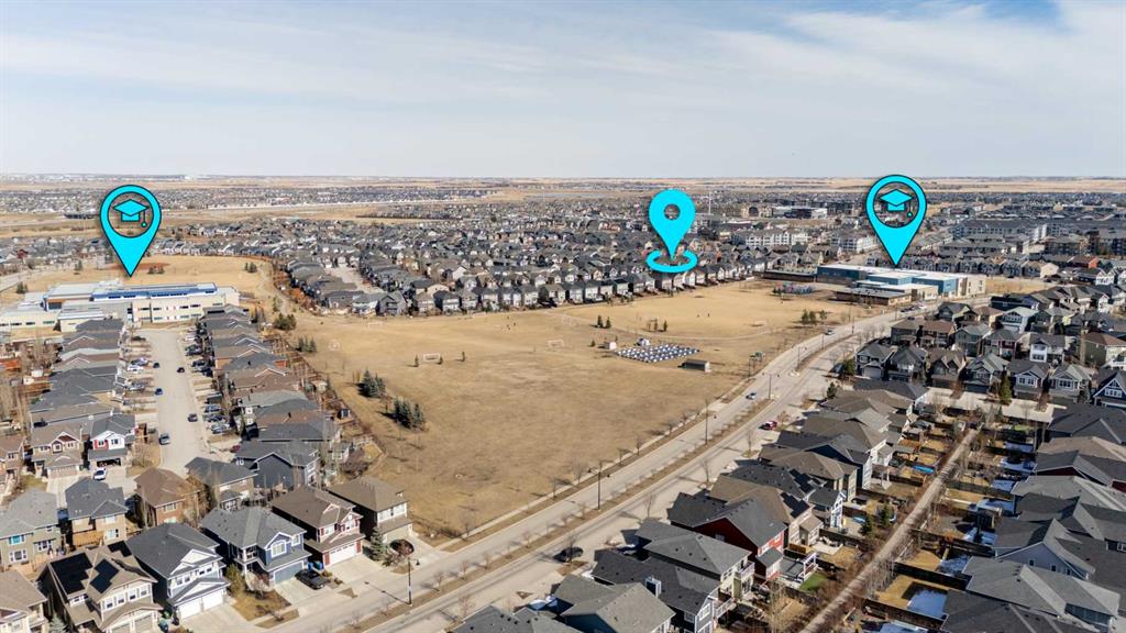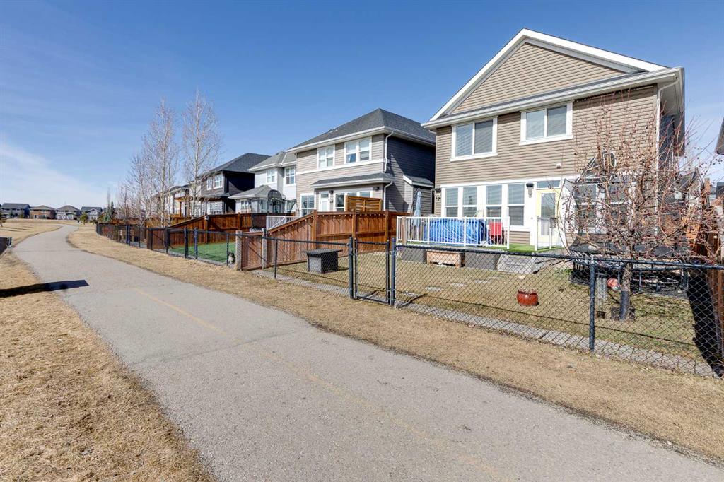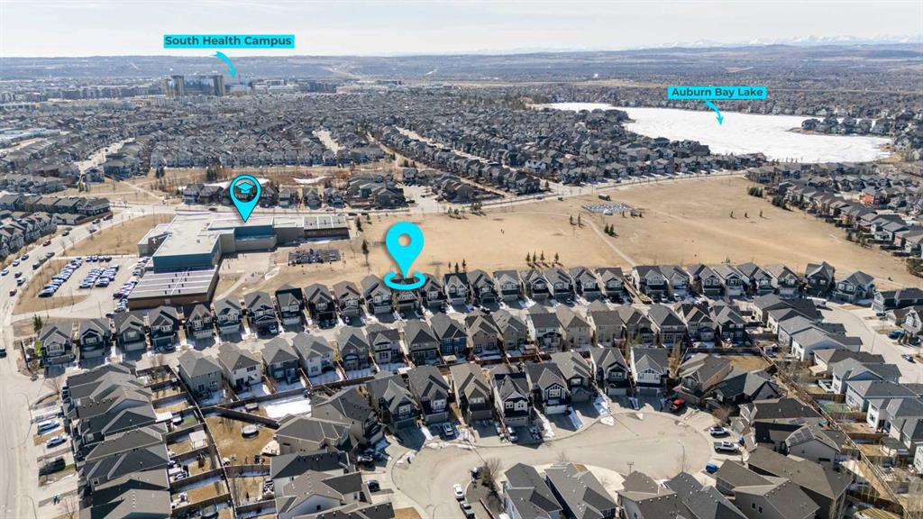 Located in the sought-after lake community of Auburn Bay, this Jayman-built two-storey home offers over 3,600 square feet of developed living space, with five bedrooms and 3.5 bathrooms. Backing directly onto greenspace and showcasing mountain views from the primary bedroom, the property combines thoughtful design with over $80,000 in upgrades and standout curb appeal. The main floor welcomes you with a spacious entryway and 9-foot ceilings, while large windows bring in an abundance of natural light. Durable wide plank hardwood flooring runs throughout, complementing the open-concept layout that connects the kitchen, dining, and living areas. The kitchen is designed with a focus on both style and function, featuring quartz countertops, stainless steel appliances including a gas cooktop (wired for electric cooktop as well) and built-in wall oven, sleek white cabinetry, and a refined backsplash. Two oversized islands offer generous space for preparation and casual seating, while abundant cabinetry and a walk-in pantry provide excellent storage. A built-in beverage area with a bar fridge adds an extra layer of convenience. The dining area comfortably accommodates gatherings and offers access to the back deck, while the living room is anchored by an electric fireplace with a stone surround. A two-piece powder room completes this level. Upstairs, a central bonus room separates the primary retreat from the additional bedrooms. The primary suite overlooks greenspace with views of the Rocky Mountains and includes a luxurious five-piece ensuite with a soaker tub, standalone shower, dual vanities with individual sinks, a makeup station, and two walk-in closets. Two additional bedrooms are generously sized and share a five-piece bathroom with dual sinks and a separate area for the tub, shower, and toilet. A walk-in linen closet and a dedicated laundry room add to the practicality of this level. The fully finished basement expands the living space with a recreation and media area, two more bedrooms, each with their own walk-in closet, and a four-piece bathroom. There is also plenty of storage throughout. Outside, the south-facing backyard enjoys the sun all day long and features a deck and a grass area suited for a fire pit, play space, or entertaining. There is direct access to walking and biking pathways and the surrounding greenspace. Living in Auburn Bay means exclusive access to the lake and community amenities including a beach, tennis courts, and year-round activities. The home backs onto a field connecting Prince of Peace and Lakeshore Schools, is a short walk to Auburn Bay School, and minutes from JCS High School, Seton YMCA & library, South Health Campus, shopping, dining, major roadways, parks, golf courses, and an off-leash dog park. Check out the floor plans and 3D Tour!