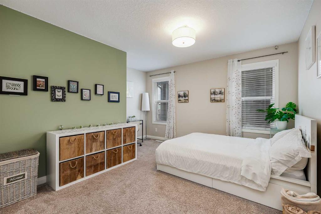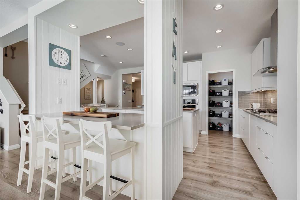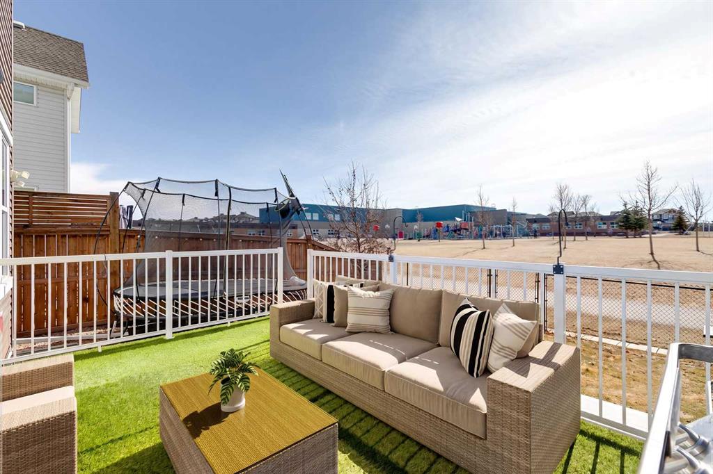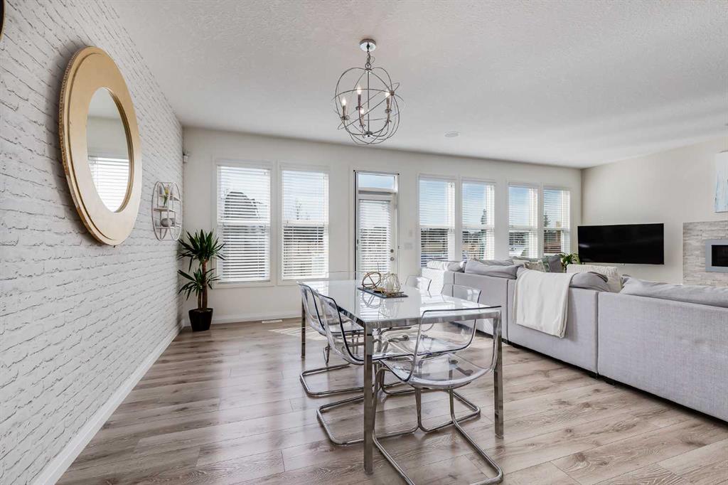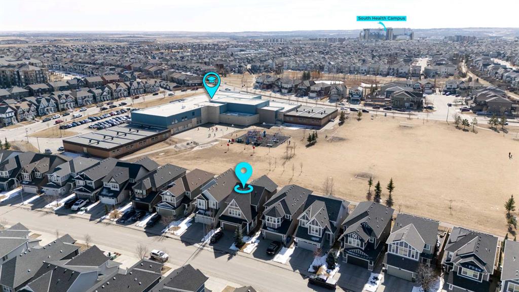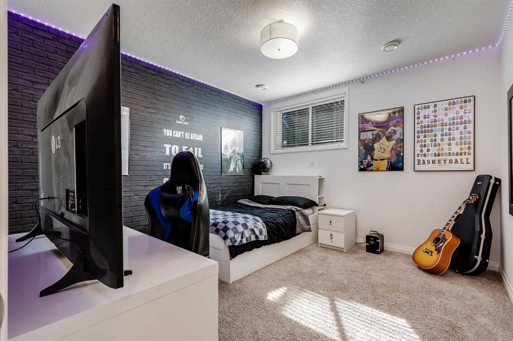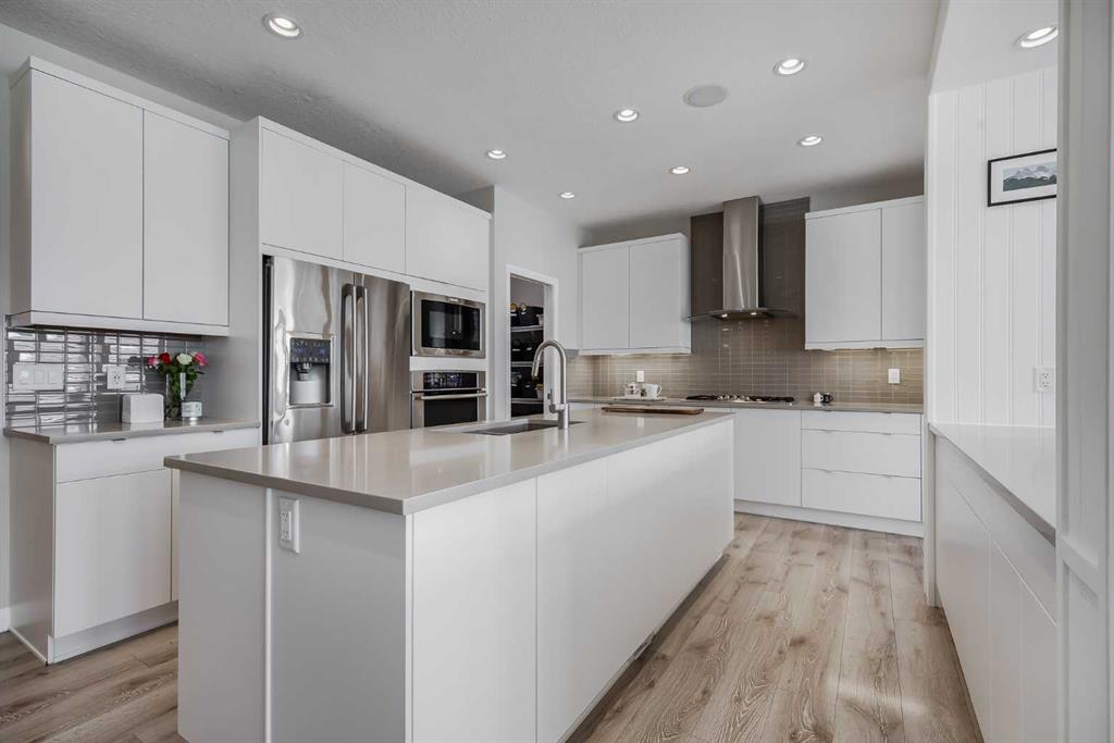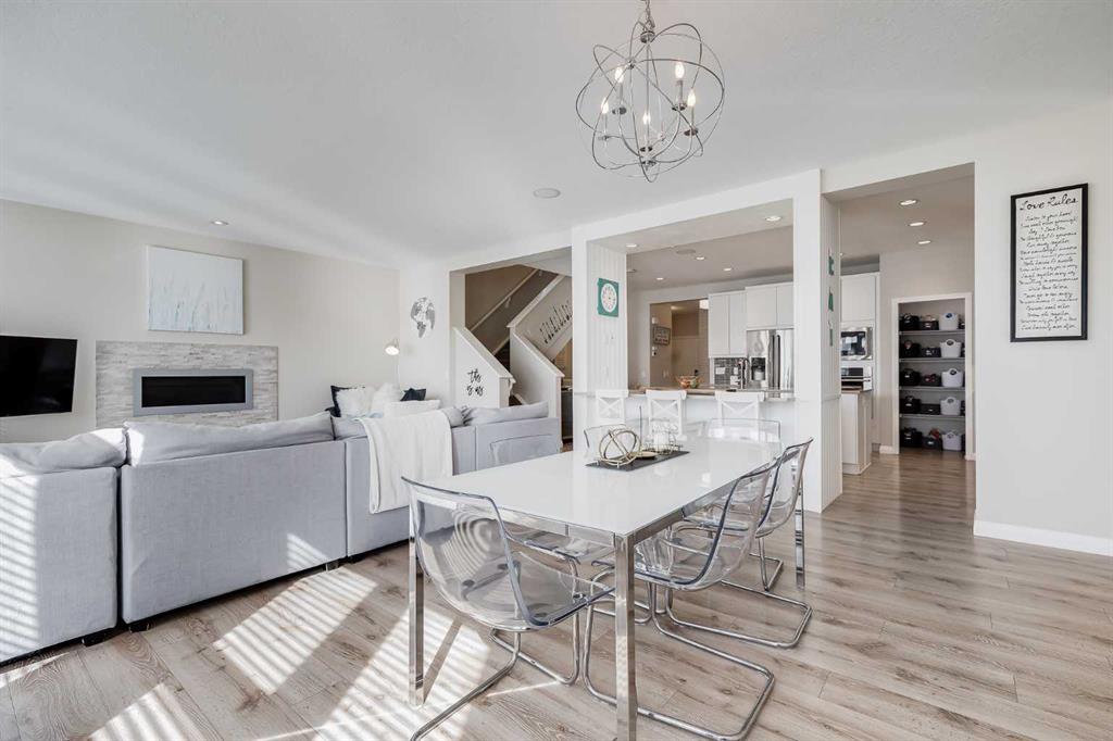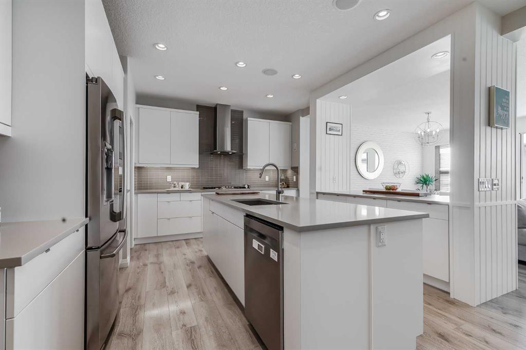 Located in the sought-after lake community of Auburn Bay, this Jayman-built two-storey home offers over 3,600 square feet of developed living space, with five bedrooms and 3.5 bathrooms. Backing directly onto greenspace and showcasing mountain views from the primary bedroom, the property combines thoughtful design with over $80,000 in upgrades and standout curb appeal. The main floor welcomes you with a spacious entryway and 9-foot ceilings, while large windows bring in an abundance of natural light. Durable wide plank hardwood flooring runs throughout, complementing the open-concept layout that connects the kitchen, dining, and living areas. The kitchen is designed with a focus on both style and function, featuring quartz countertops, stainless steel appliances including a gas cooktop (wired for electric cooktop as well) and built-in wall oven, sleek white cabinetry, and a refined backsplash. Two oversized islands offer generous space for preparation and casual seating, while abundant cabinetry and a walk-in pantry provide excellent storage. A built-in beverage area with a bar fridge adds an extra layer of convenience. The dining area comfortably accommodates gatherings and offers access to the back deck, while the living room is anchored by an electric fireplace with a stone surround. A two-piece powder room completes this level. Upstairs, a central bonus room separates the primary retreat from the additional bedrooms. The primary suite overlooks greenspace with views of the Rocky Mountains and includes a luxurious five-piece ensuite with a soaker tub, standalone shower, dual vanities with individual sinks, a makeup station, and two walk-in closets. Two additional bedrooms are generously sized and share a five-piece bathroom with dual sinks and a separate area for the tub, shower, and toilet. A walk-in linen closet and a dedicated laundry room add to the practicality of this level. The fully finished basement expands the living space with a recreation and media area, two more bedrooms, each with their own walk-in closet, and a four-piece bathroom. There is also plenty of storage throughout. Outside, the south-facing backyard enjoys the sun all day long and features a deck and a grass area suited for a fire pit, play space, or entertaining. There is direct access to walking and biking pathways and the surrounding greenspace. Living in Auburn Bay means exclusive access to the lake and community amenities including a beach, tennis courts, and year-round activities. The home backs onto a field connecting Prince of Peace and Lakeshore Schools, is a short walk to Auburn Bay School, and minutes from JCS High School, Seton YMCA & library, South Health Campus, shopping, dining, major roadways, parks, golf courses, and an off-leash dog park. Check out the floor plans and 3D Tour!
