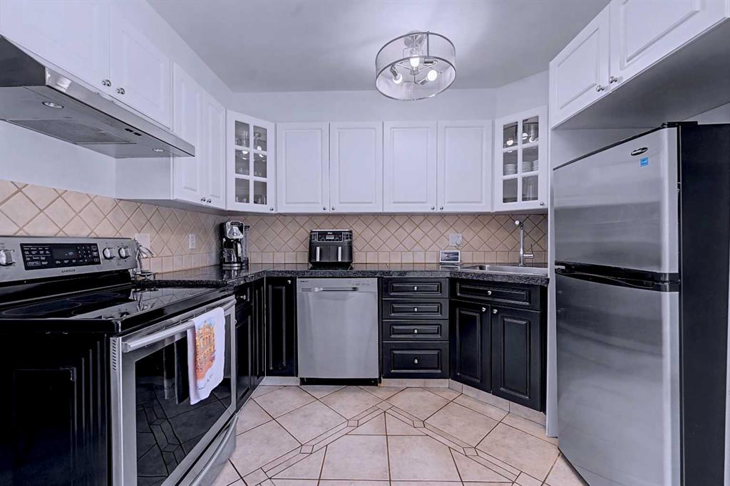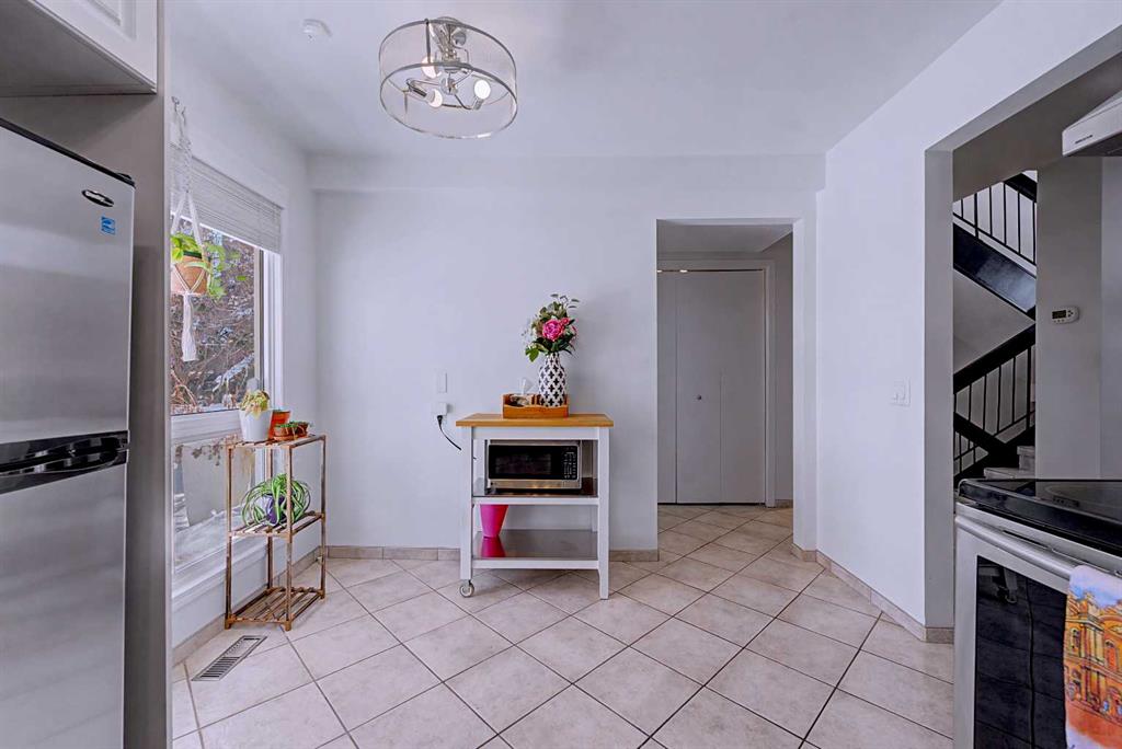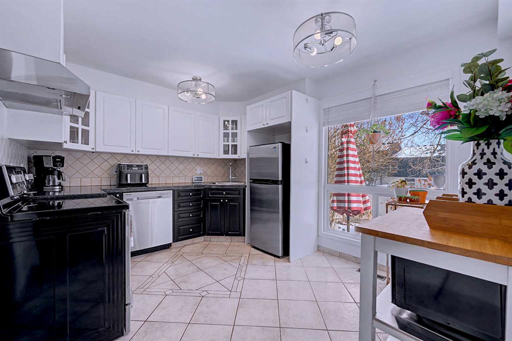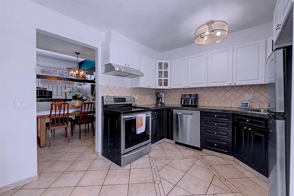 The dining area flows seamlessly into a stylish kitchen where function meets design. Featuring stainless steel appliances, a neutral colour palette, and two-tone shaker cabinetry, this space is both clean and contemporary. Updated lighting and generous storage make it highly practical.