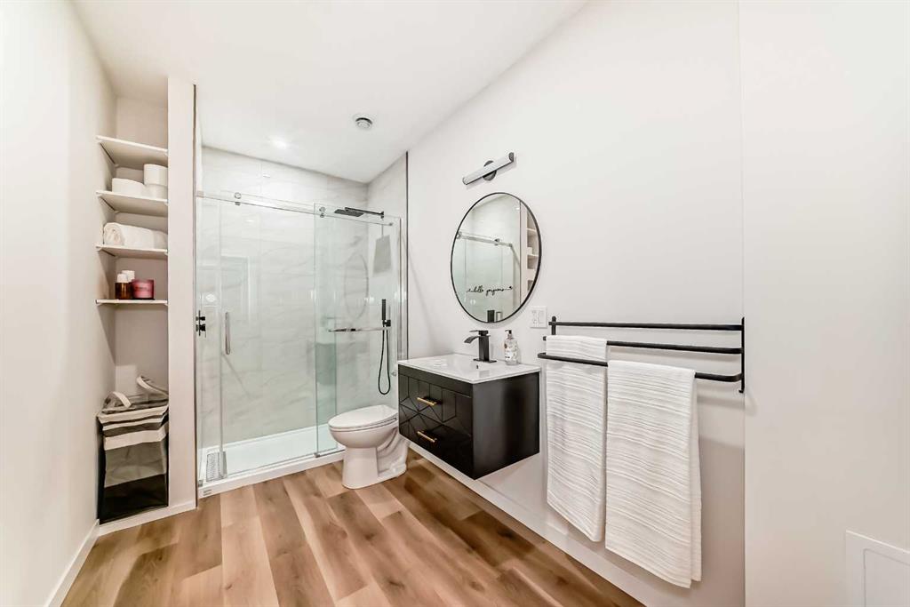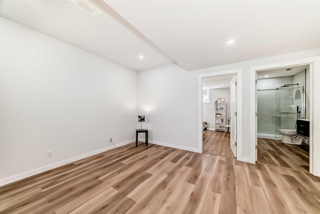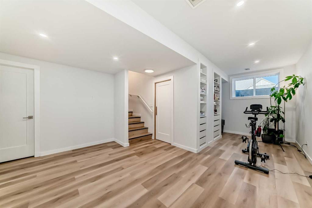 The fully finished basement is equally impressive — 9-foot ceilings, oversized windows, and vinyl plank flooring create a bright, open atmosphere. This level adds a bedroom, a newly finished full bathroom, a recreation room, and ample storage.