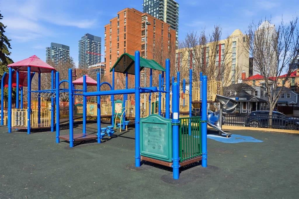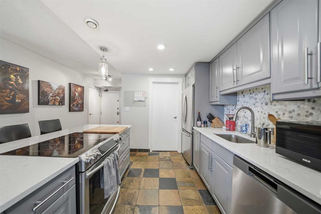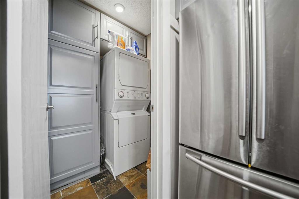 Rare opportunity! Welcome to this exceptional 2-bedroom, 2-bathroom condo with a remarkable wraparound balcony, situated in the heart of Calgary’s Beltline district. This beautiful 5th floor corner unit offers 1,234 sq ft of curated living space designed for both relaxation and entertaining. The updated kitchen features quartz countertops, custom backsplash, a kitchen island and stainless steel appliances, opening seamlessly into an expansive living area. A central wood-burning fireplace serves as a perfect focal point for the family and dining rooms. Recent improvements include brand new windows and balcony doors for enhanced natural light and energy efficiency. The south-facing primary bedroom features city views, a 3-piece ensuite, and direct access to the sunny wraparound balcony. Additional space includes a generously sized second bedroom and a full 4-piece main bathroom. Fountaine Bleau Estates is a quiet, well-managed concrete building with two elevators and secure underground parking, and one titled spot included for this unit. From pop-up festivals at Haultain Park to award-winning establishments on 1st Street, there is so much to discover in the neighbourhood. Located just steps away from Calgary’s premier coffee houses, restaurants, and shops, this location offers a vibrant urban lifestyle with endless possibilities. This is an opportunity of a lifetime, book your private showing today!