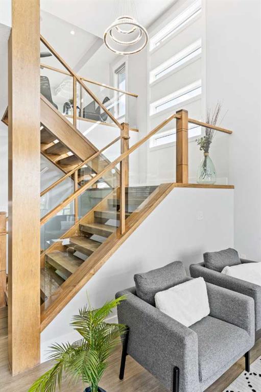 The main and upper floors offer four bedrooms and three-and-a-half bathrooms, ideal for families seeking both space and functionality. The home impresses immediately with an open-to-below living room and an open-to-above bonus room, creating a striking sense of volume, light, and connection between levels. A cedar and oak upgrade package, paired with black and chrome hardware throughout, adds warmth and contemporary contrast, while an enhanced lighting package ensures the home feels bright and inviting at every turn.