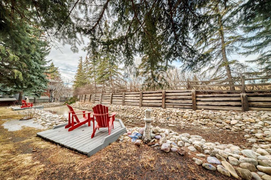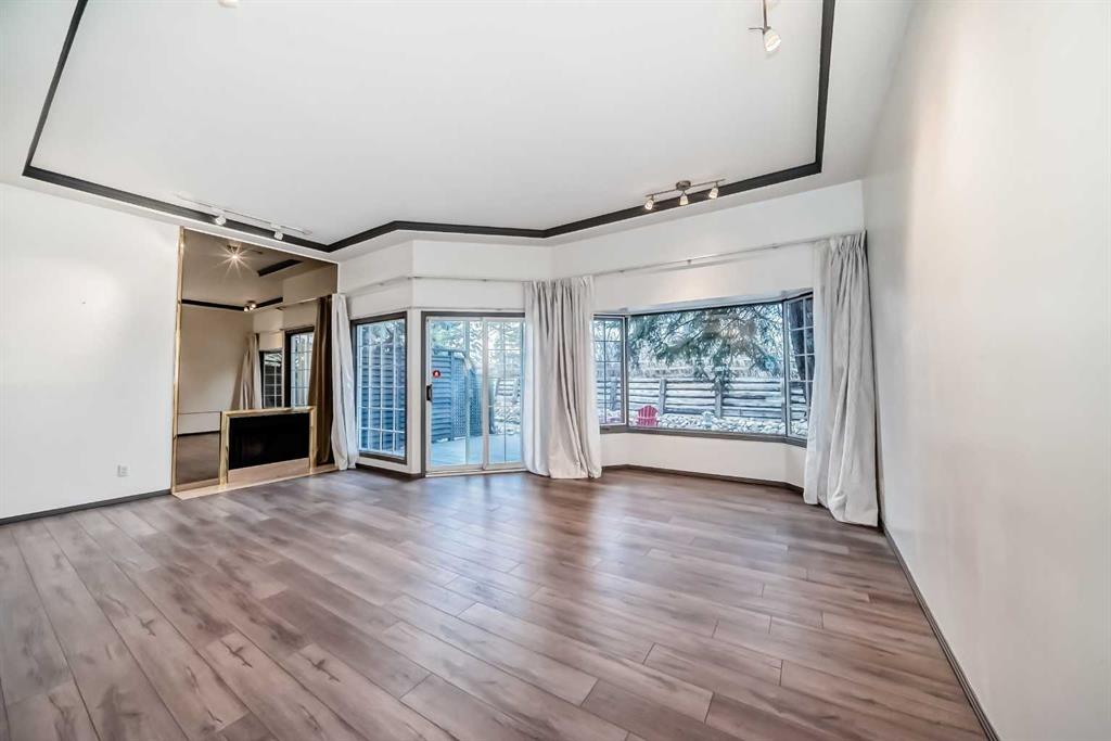 Nestled in the highly sought-after community of Varsity, this well maintained townhome is surrounded with mature trees and back onto a rare pond with tranquil green space views. Boasting a dramatic 10-foot ceiling in the living room, expansive windows, and stylish laminate flooring, the home is bright, airy, and inviting throughout. The spacious living room features a cozy wood-burning fireplace and provides direct access to the backyard with decks and red Adirondack chairs overlooking the pond. A formal dining area with a built-in wet bar enhances the home’s entertaining appeal.