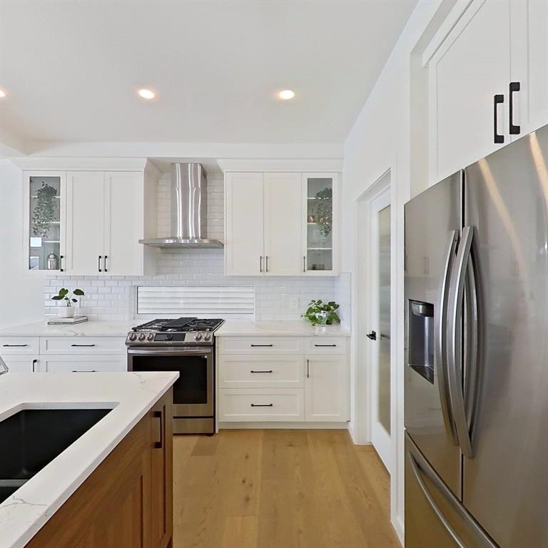 The kitchen is thoughtfully designed, featuring a SILGRANITE undermount sink, GAS stove, built-in microwave, chimney hood fan, 2 TONE cabinetry and elegant GLASS upper cabinets. You’ll love the abundance of storage, including pot and pan drawers and a large recycling pullout integrated into the island.
