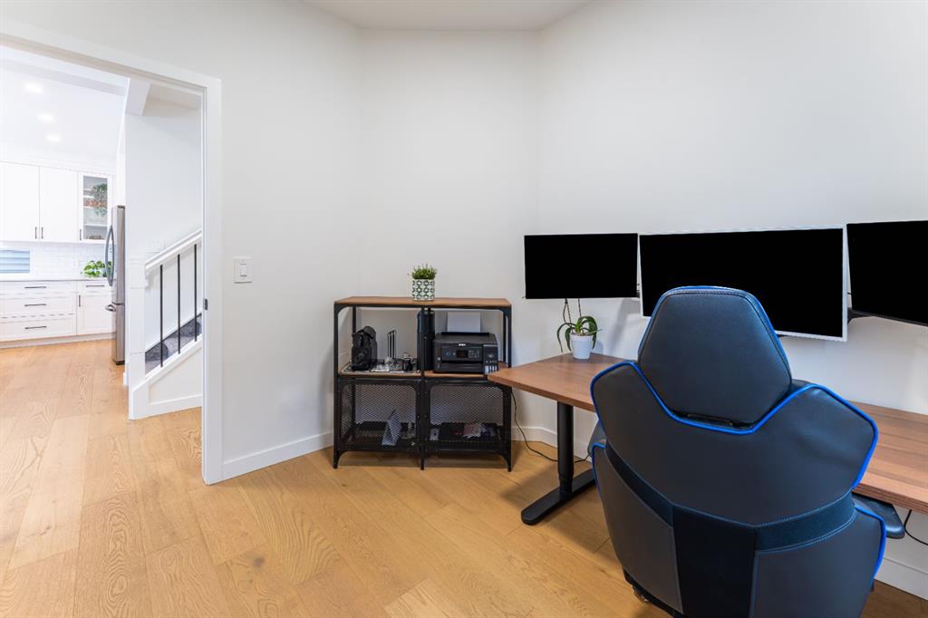 Inside, the home is finished with upgraded window coverings, including remote-controlled blinds in the dining and living rooms. TRENDY HARDWOOD flooring extends throughout the main floor (with tile in the mudroom) and into the den, replacing standard carpet for a more elevated feel. Check out the floor to ceiling TILED Fireplace as well as the black METAL SPINDLE railings on your way upstairs.