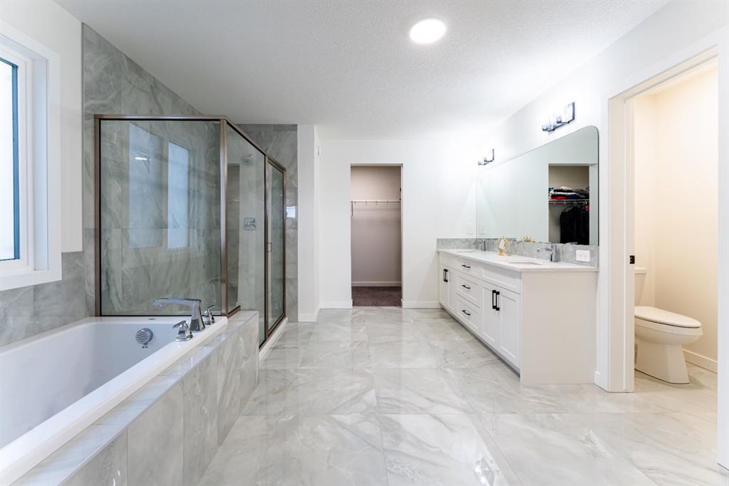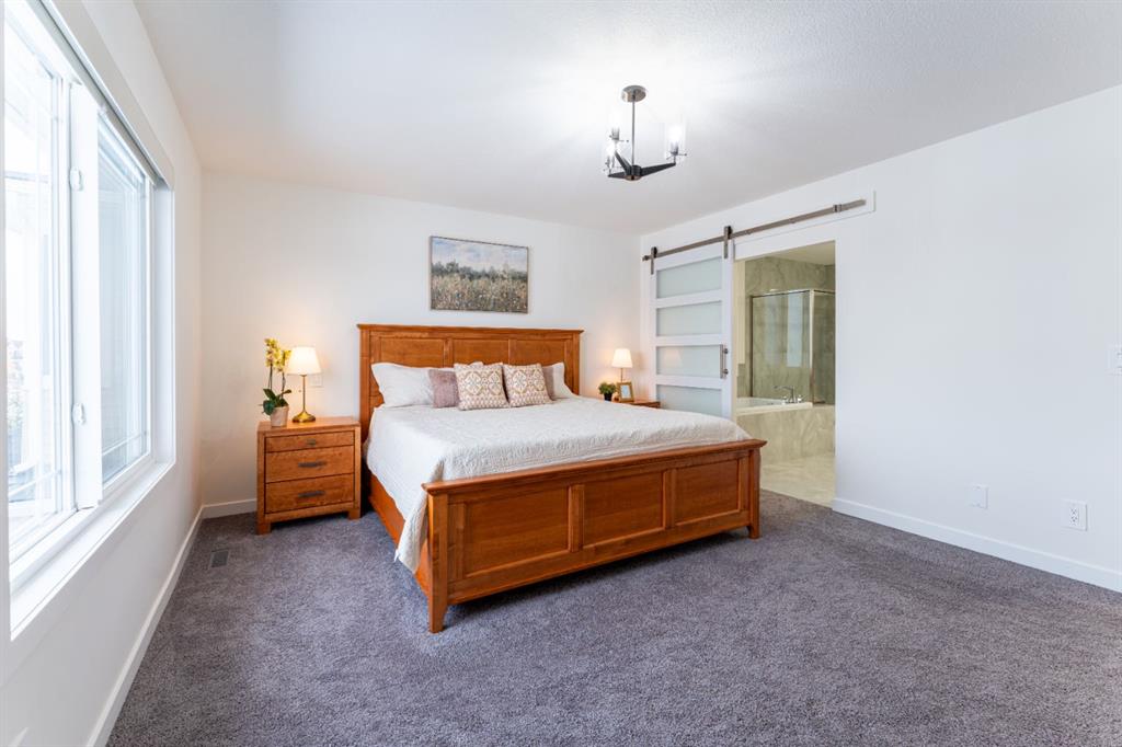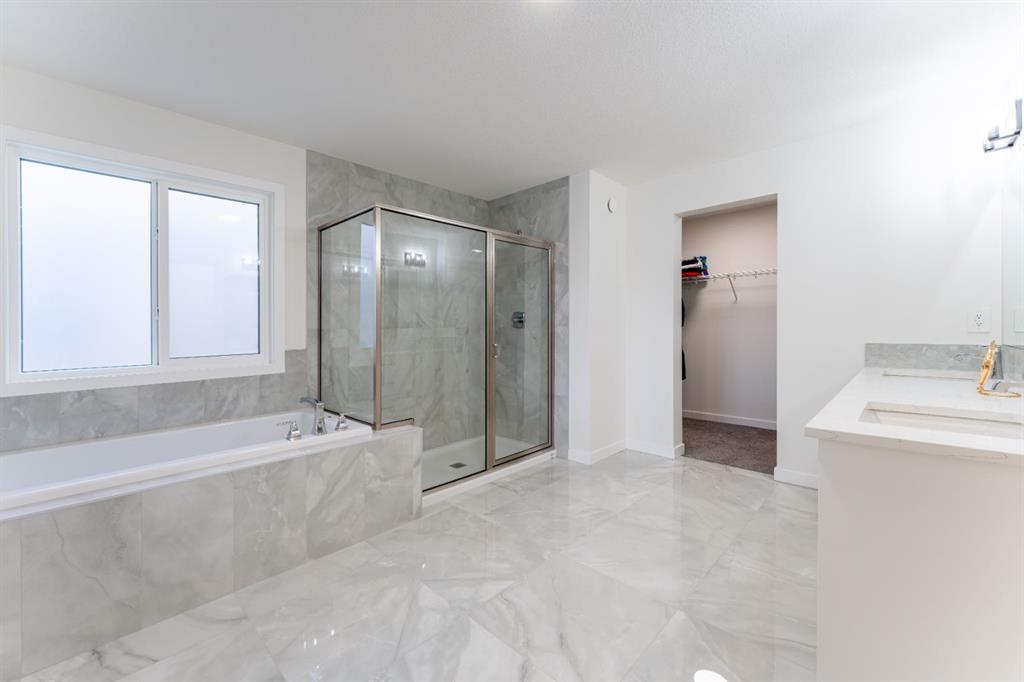 The primary suite is like none other, we dare you to find a LARGER bathroom. Complete with a stylish BARN DOOR, a large tiled shower with a built-in bench, a relaxing soaker tub, and upgraded 12 x 24 tile throughout. A bank of three drawers adds both convenience and extra storage as well as a large walk-in closet.