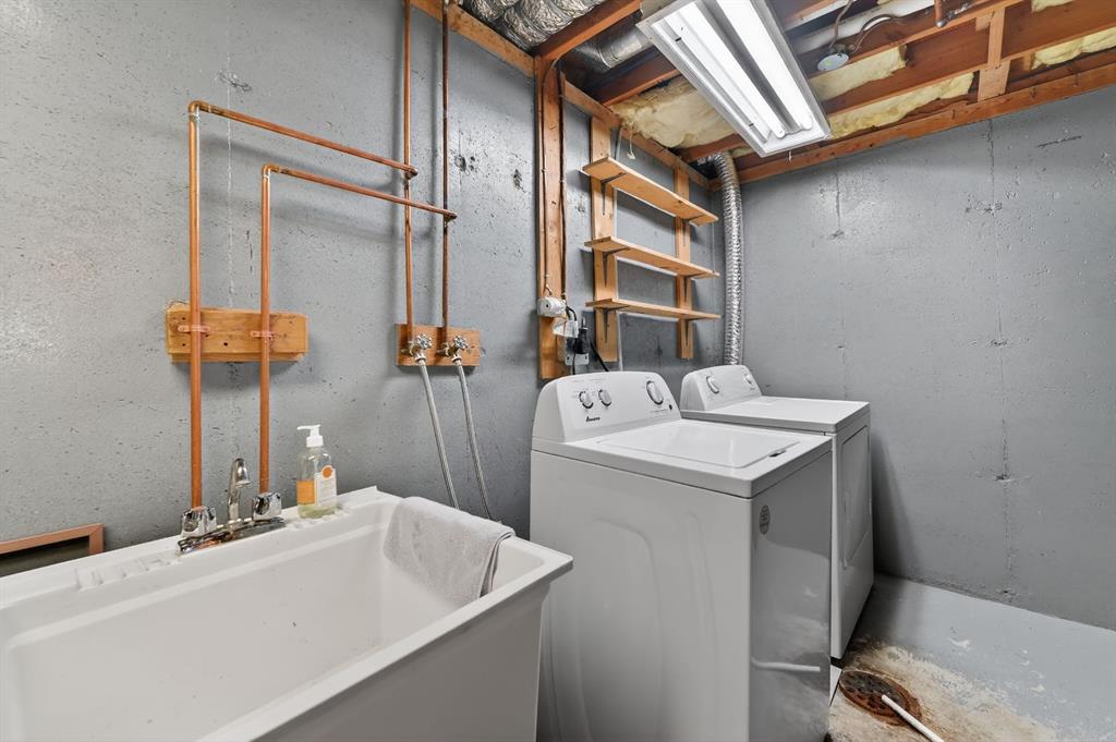 The finished walkout basement provides additional living space and includes a laundry area with newer washer and dryer (2023) and a laundry sink in the utility room.