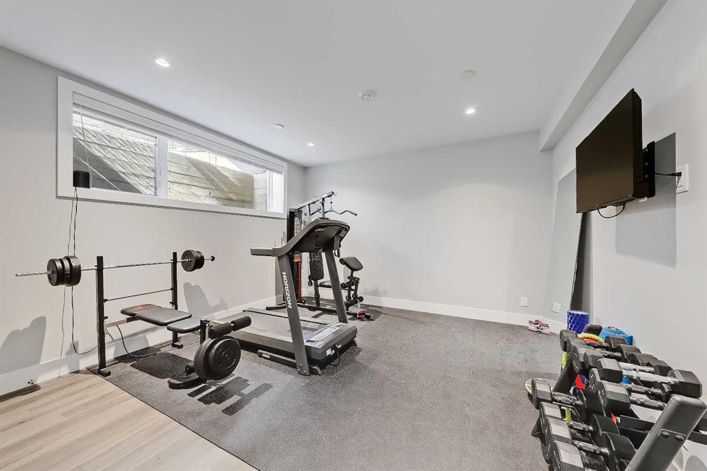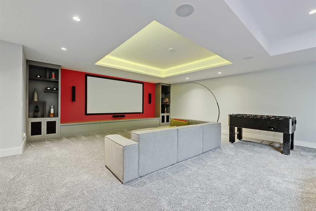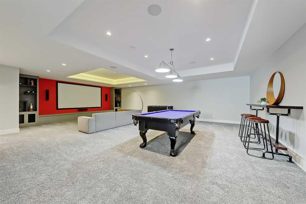 The basement is the ultimate spot for both relaxing and entertaining. The media room is set up for movie nights or big game days with a 120” projector screen and built-in speakers for an immersive experience. There's also a gym/6th bed, a games area with room for a pool table, and a wet bar. The entire space is wired for sound ensuring great sound both inside and on the patio.