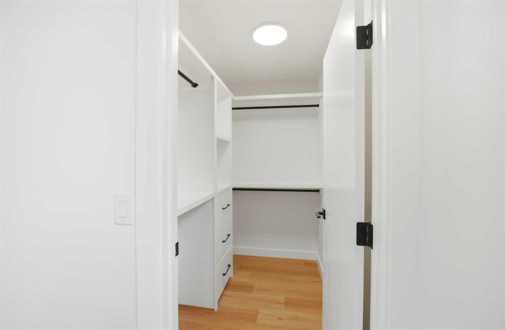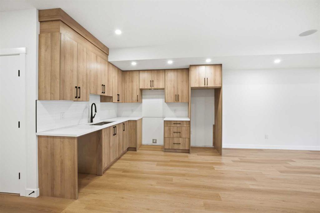 The lower WALKOUT SUITE is bright, independently accessed, and finished to a consistently high standard. The living area features a BUILT-IN FLOATING MEDIA CENTRE, while the full kitchen mirrors the quality of the main floor with warm oak flat-panel cabinetry and quartz countertops. A spacious bedroom with walk-in closet, full bathroom, and stacked laundry complete the suite — fully self-contained and ready for immediate use.