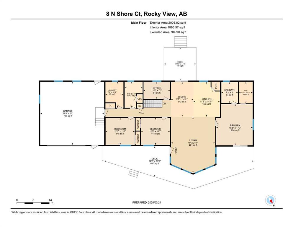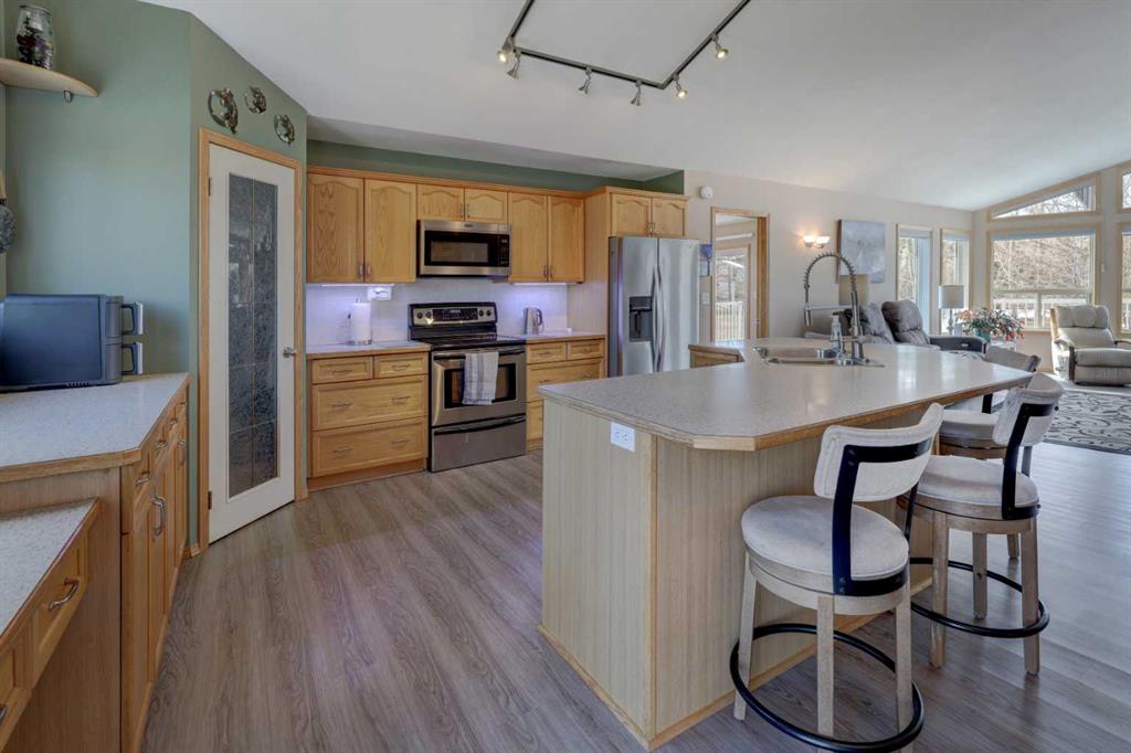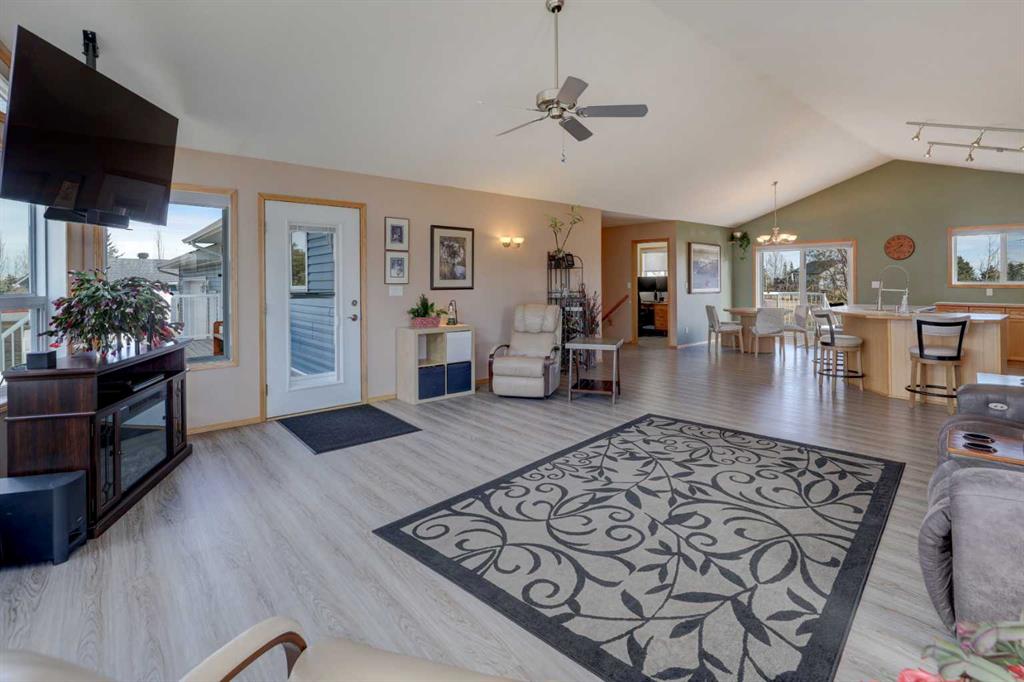 Inside, nearly 4,000 sq. ft. of air-conditioned living space blends warmth and functionality. The central kitchen, with its 3-sided island, is the heart of the home—perfectly positioned between the dining area and the sunlit living room. The primary bedroom is a relaxing retreat with a walk-in closet, 3-piece ensuite, and private patio-door access to the 64-foot front deck. Two additional bedrooms, a den, main-floor laundry, and a 4-piece bath complete the thoughtful main level, along with interior access to the oversized attached garage.