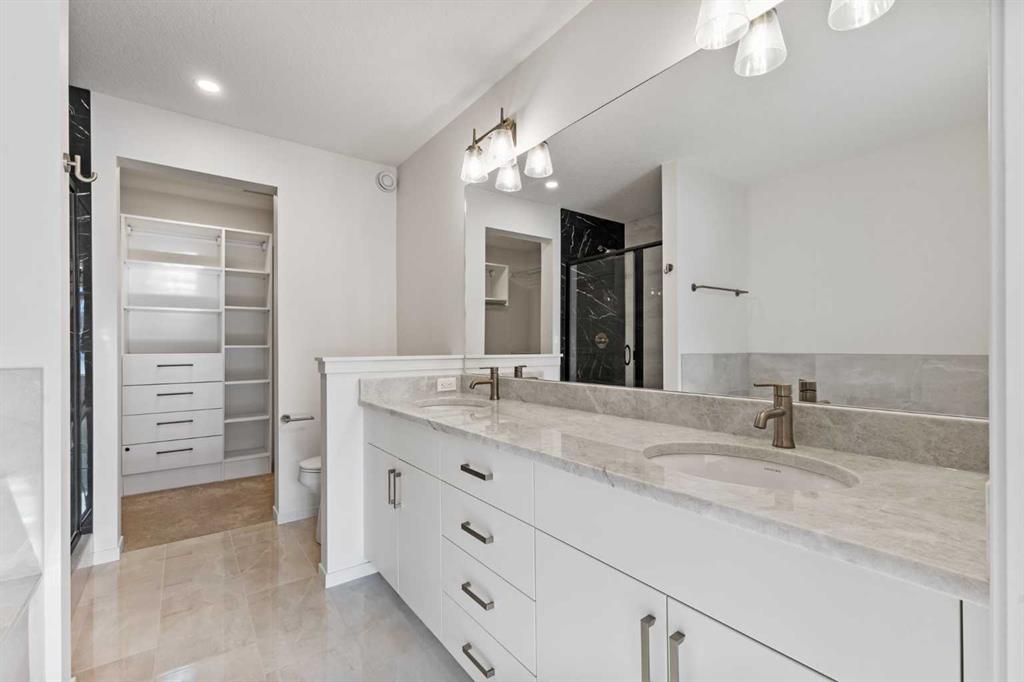 Upstairs, glass-panel railings and a bright upper hallway continue the home’s airy feel. The primary suite is spacious and luxurious, featuring a soaker tub, dual sinks, walk-in closet with built-in storage, and stylish brass fixtures atop custom quartz counters.
