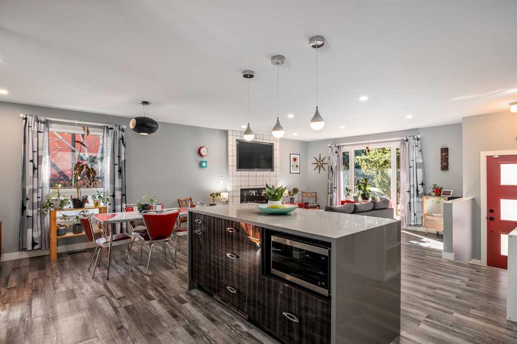 Inside, the main floor has been extensively updated while preserving its inviting mid-century feel. The fully renovated kitchen with custom cabinetry, quartz countertops and waterfall island, updated vinyl plank flooring, fresh paint and curated finishes create a bright, cohesive living space. Large triple-pane windows flood the home with natural light while enhancing energy efficiency.
