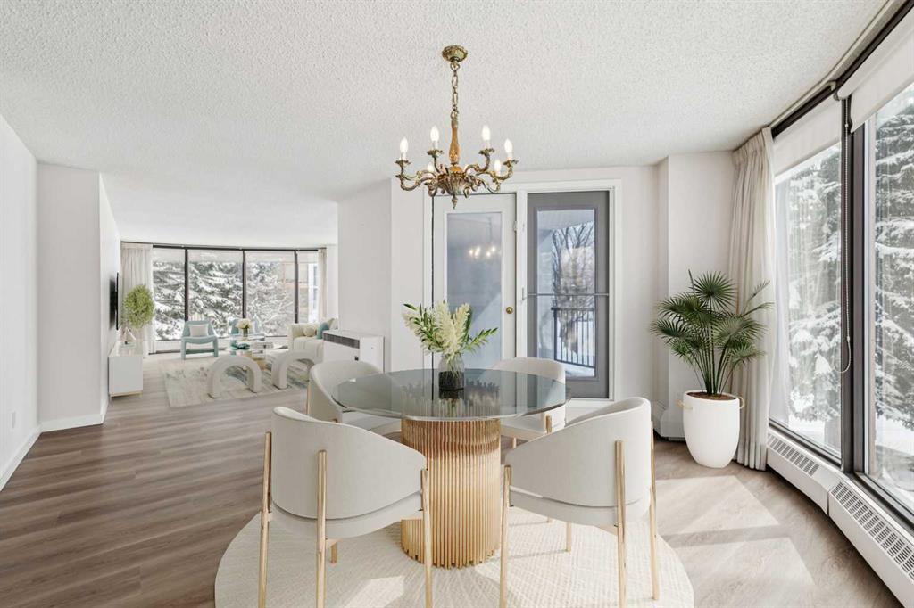A standout feature of this home is the stunning wall of floor-to-ceiling windows that wrap around the living and dining areas, filling the space with natural light and showcasing serene views of mature trees and surrounding green space.