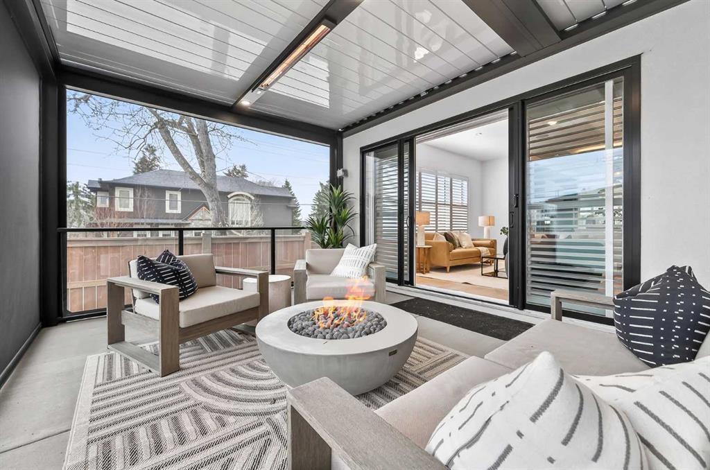 The chef-inspired kitchen is the centrepiece of the home, showcasing a remarkable 16-foot two-toned quartz island with feature lighting above. Premium stainless steel Italian appliances include a 5-burner F.lli Bertazzoni gas range, complemented by a porcelain tile backsplash and unique lower window detailing beneath the cabinetry—an uncommon and thoughtful design element that enhances natural light. The kitchen flows seamlessly into the living room, where a gas fireplace with bookmatched marble porcelain tile creates a warm and sophisticated focal point. Double sliding doors open to a truly standout outdoor retreat. A professionally installed Suncoast enclosure—valued at over $53,000—creates a year-round oasis complete with built-in electric heaters, a gas-assisted fireplace, and generous seating space. Ideal for entertaining or relaxing, this space extends your living area in every season. A spacious mudroom with built-in cabinetry and a stylish powder room complete the main level. Upstairs, hardwood flooring continues throughout, leading to an open workspace enhanced by a large skylight. The upper laundry room is well-equipped with a sink, quartz countertops, and ample cabinetry. Two spacious bedrooms and a beautifully finished full bathroom with quartz surfaces and a fully tiled tub/shower complete this level.