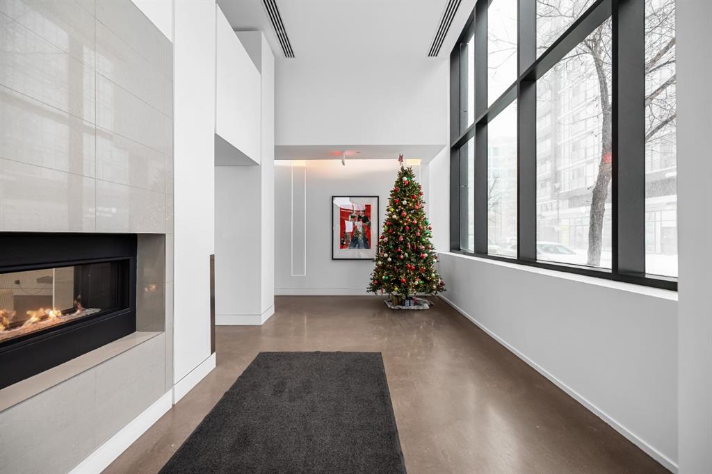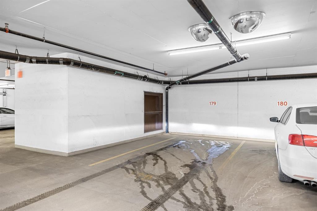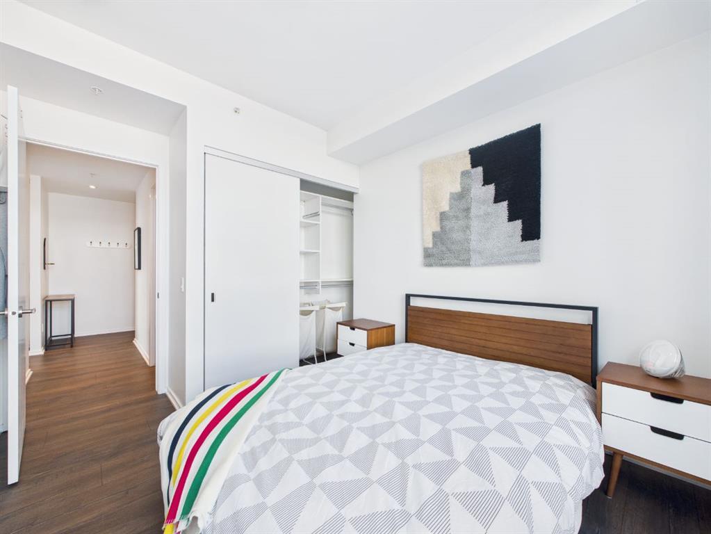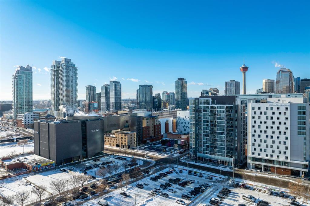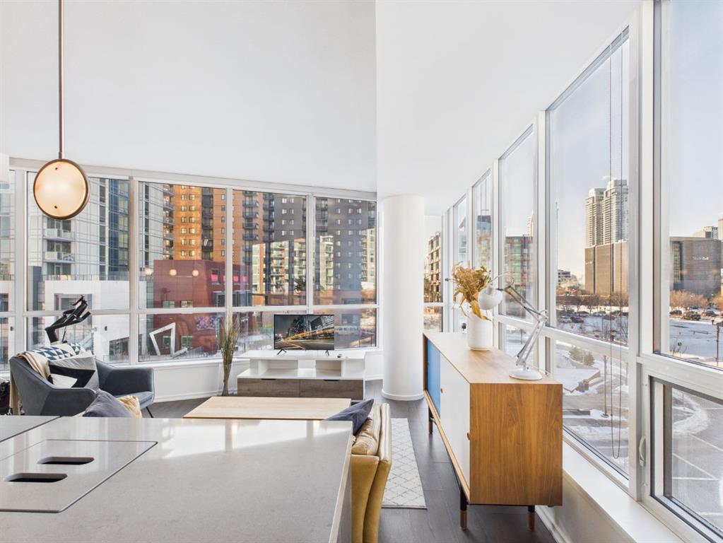 Wake up to sunlight pouring in from every angle in this third-floor 1 bedroom + den/bedroom home in the Verve, where city living meets everyday comfort. With 180-degree views stretching from the southeast all the way to the northwest, your days begin with glowing sunrises and wind down with golden evening light filtering through expansive windows. The open-concept layout is both welcoming and functional, featuring laminate flooring, quartz countertops with apple-box storage, and a modern kitchen designed for relaxed mornings and effortless entertaining. The versatile den easily functions as a second bedroom, home office, or guest retreat, adapting to your lifestyle as it evolves. Enjoy year-round comfort with air conditioning, in-suite washer and dryer, and the convenience of a storage locker and an underground titled extra-wide parking stall. Beyond your front door, the Verve offers exceptional amenities including a beautifully landscaped courtyard, a fully equipped fitness centre, and an inviting social room with cozy fireplaces. With easy access to East Village, river pathways, dining, and downtown amenities, this bright, modern home delivers the perfect blend of comfort, style, and connected urban living. Whether you are looking for inner-city living or an investment property this home is perfect!