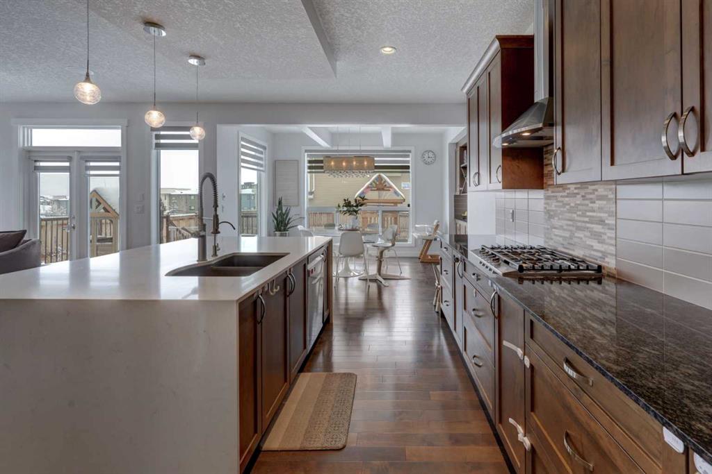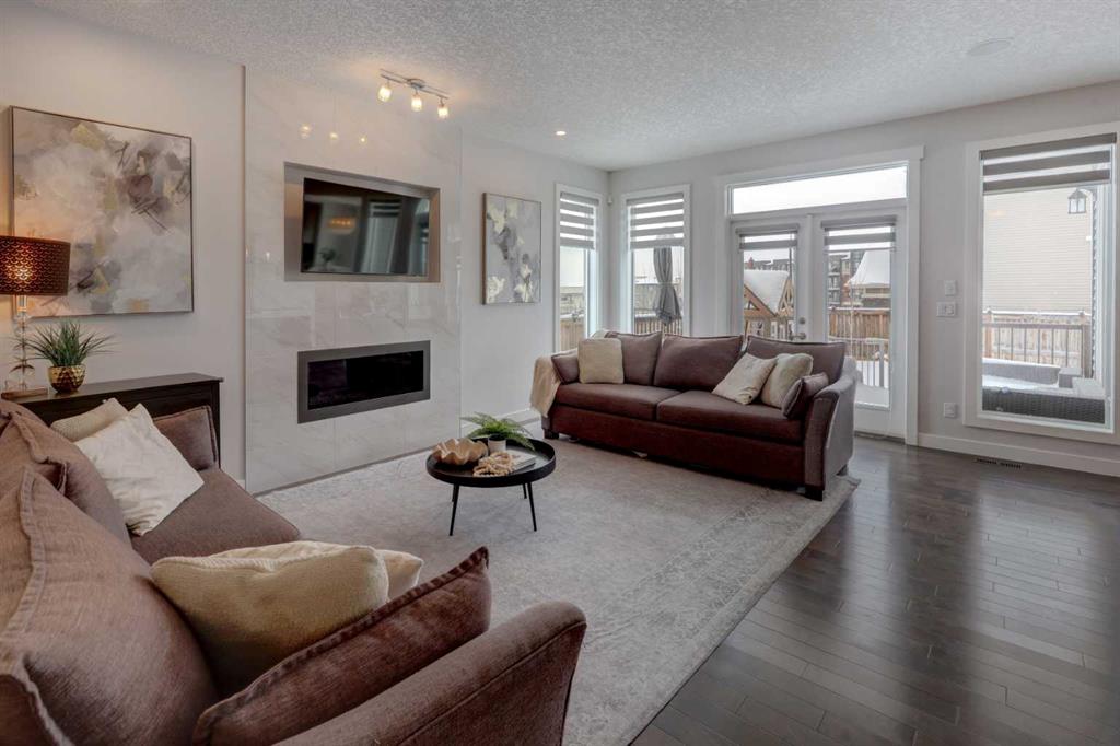 The open-concept main floor showcases rich hardwood and tile flooring, a grand front entrance, and impressive floor-to-ceiling windows that flood the space with natural light. The chef-inspired kitchen features stainless steel appliances, a gas cooktop, an oversized island (56” x 87”), and a custom-built pantry. A thoughtfully designed mudroom/laundry area, stylish 2-piece powder room, and a private den with sliding French doors complete the main level. The dining area is enhanced with a built-in coffee and wine bar, while the living room offers a striking floor-to-ceiling tiled accent wall with gas fireplace and TV.