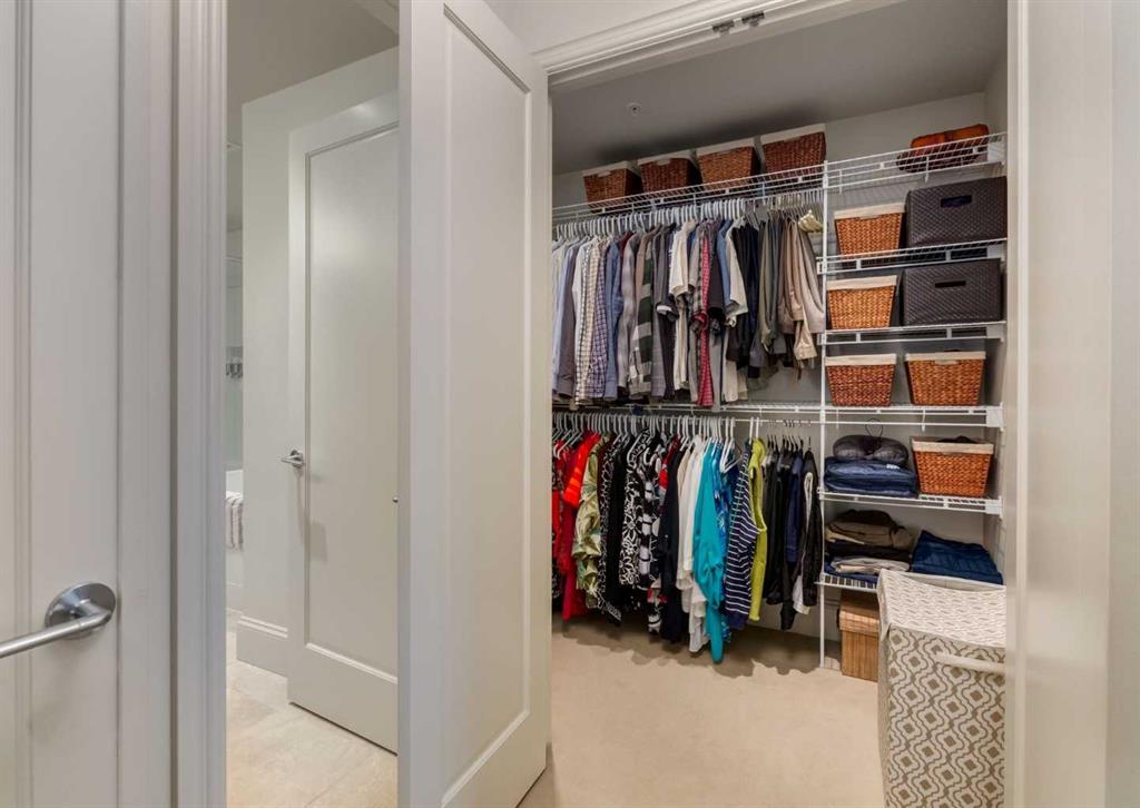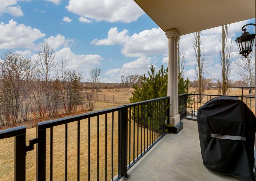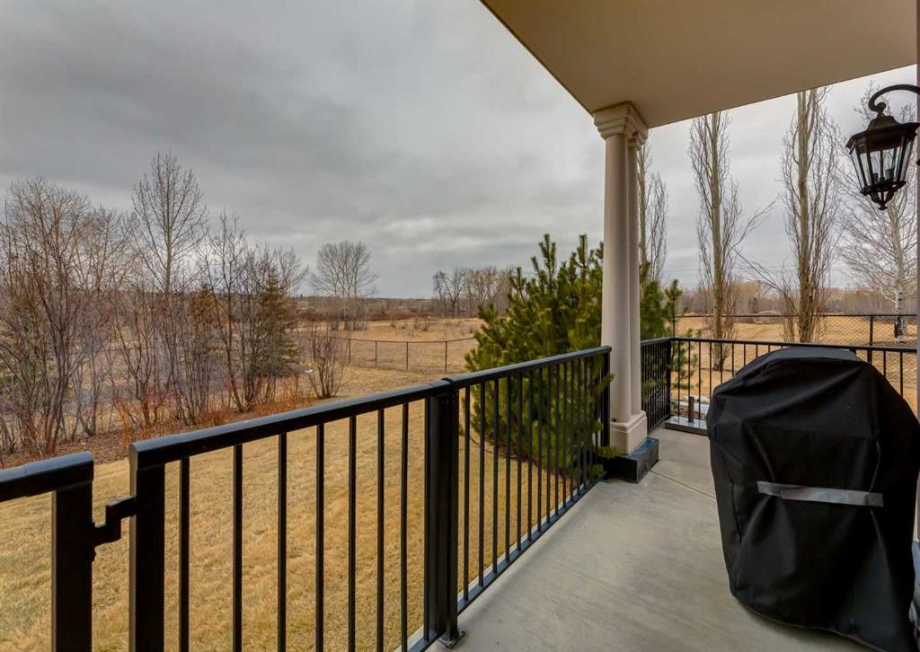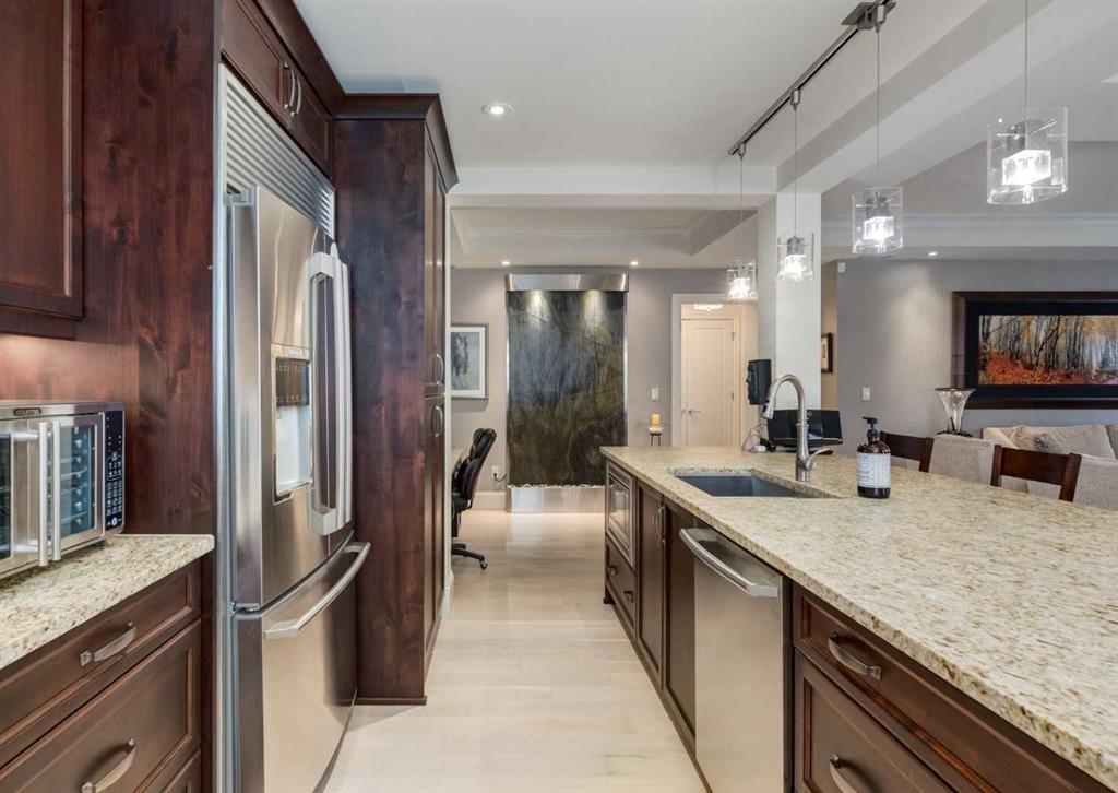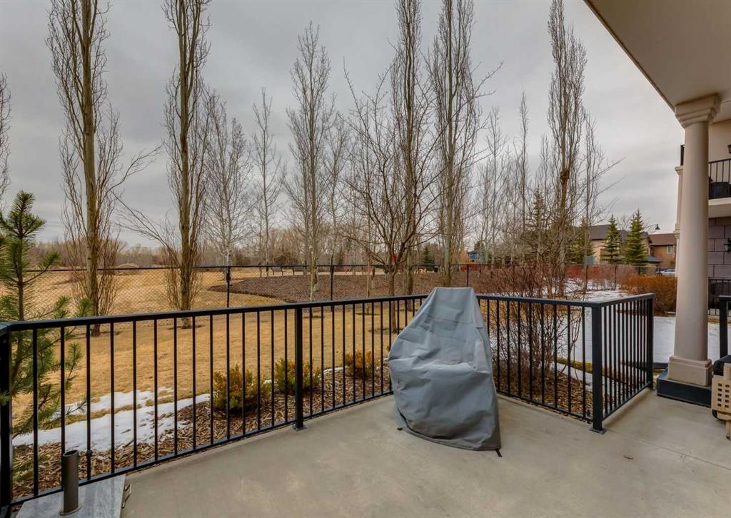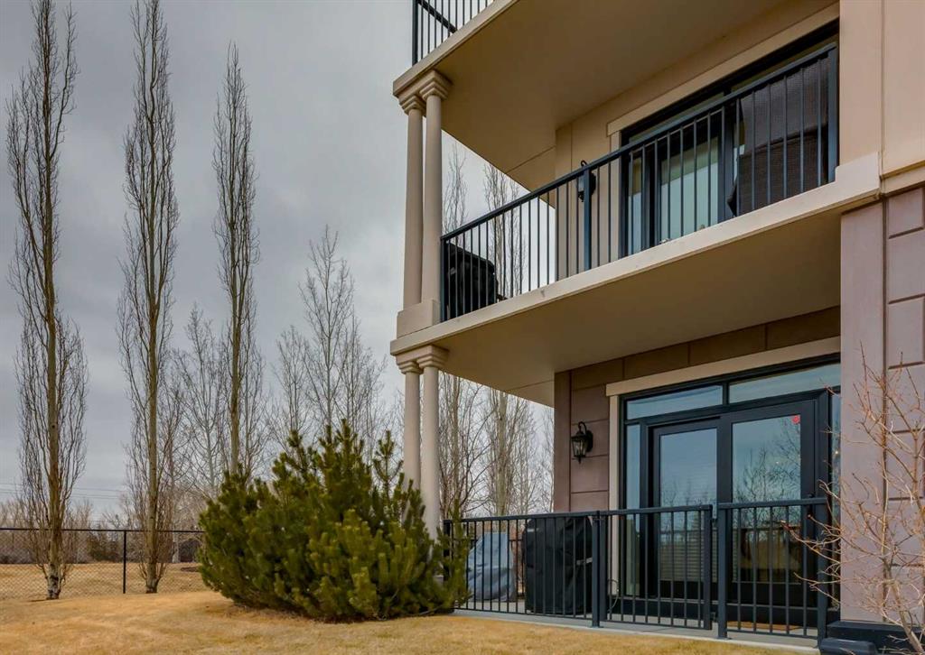 Coveted, Spectacular Corner Unit location on the main floor! Unobstructed views of the Bow River and parkland, with lots of opportunity to ride your bike, walk and enjoy the outdoors and wildlife that wander close by for your enjoyment. You will love the fabulous decor. Kitchen with plumbed-in coffee maker, gas stove, dishwasher, fridge, hood fan, microwave. Espresso color cabinetry and leathered granite countertops. Beautiful island overlooking dining and living rooms with an amazing view of the extensive yard & beyond the walking paths to the river. Breakfast bar seating for 4 with stools included. Lovely built-in desk with ample shelving. Engineered flooring (Arctic Oak). Water Feature! Custom draperies. All window blinds are motorized throughout. Bedrooms have black out drapes. Primary bedroom with 5-piece bath and heated towel bar is very spacious with 2 sinks, tub/separate shower. Walk-in closet with ample, well designed shelving. 3-piece bathroom is shared with second bedroom for complete privacy or easy for visitors as well. Lots of built-in storage. Stacking washer/dryer. Gas outlet on patio. 2 Titled Parking Stalls/P2. 1 Titled Storage. Bicycle storage included. Car wash. Pet friendly with board approval. Walk to Carburn Park. Easy access to major transportation routes, shopping, restaurants, YMCA and a lot more! Champagne is a wonderful, amazing condo complex. You are going to love it!!