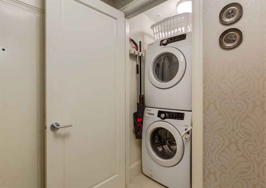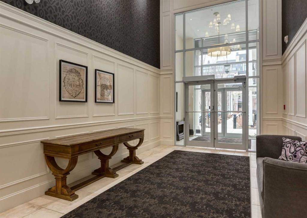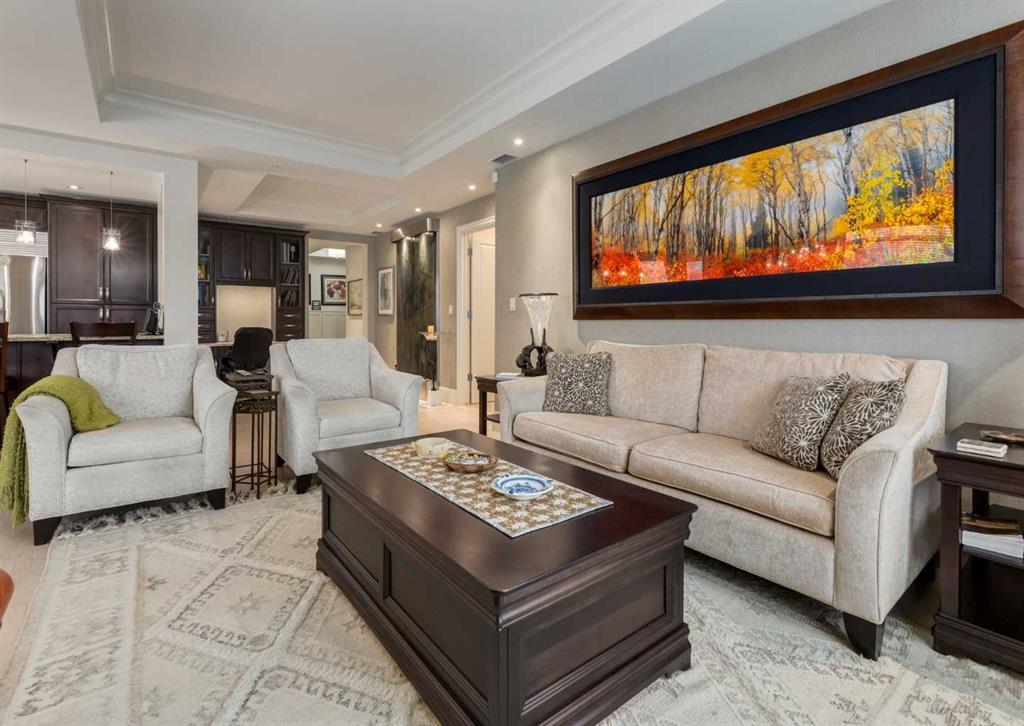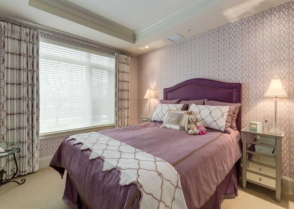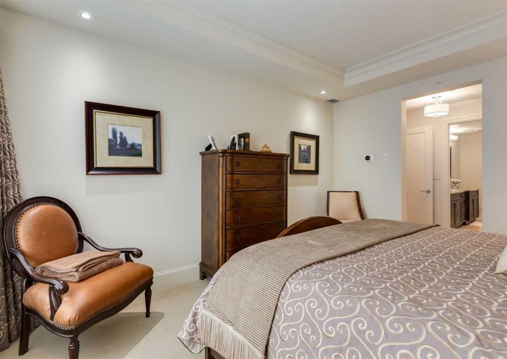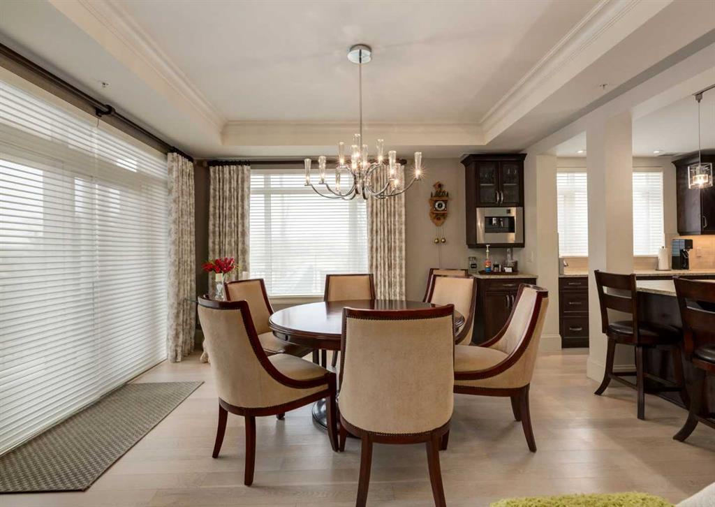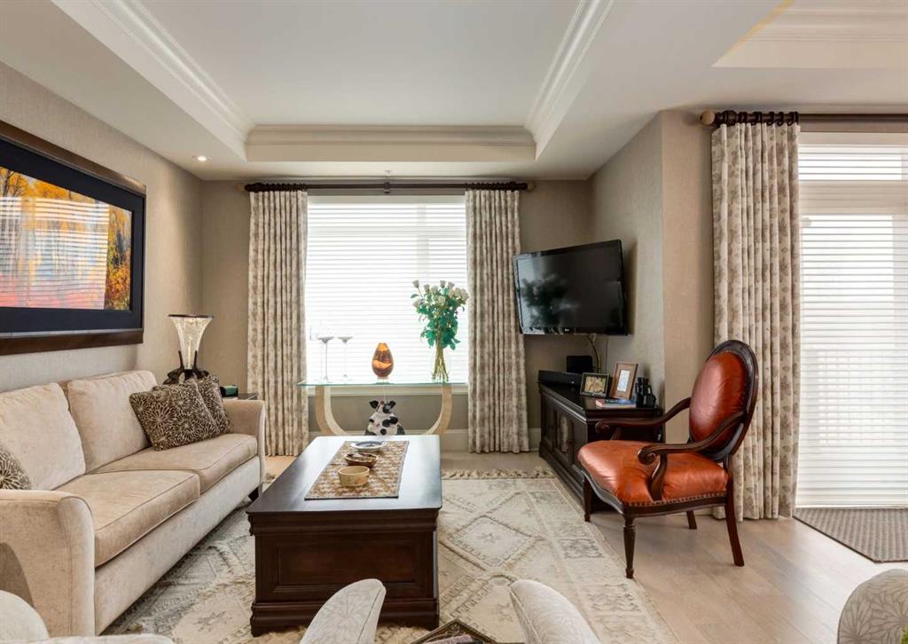 Coveted, Spectacular Corner Unit location on the main floor! Unobstructed views of the Bow River and parkland, with lots of opportunity to ride your bike, walk and enjoy the outdoors and wildlife that wander close by for your enjoyment. You will love the fabulous decor. Kitchen with plumbed-in coffee maker, gas stove, dishwasher, fridge, hood fan, microwave. Espresso color cabinetry and leathered granite countertops. Beautiful island overlooking dining and living rooms with an amazing view of the extensive yard & beyond the walking paths to the river. Breakfast bar seating for 4 with stools included. Lovely built-in desk with ample shelving. Engineered flooring (Arctic Oak). Water Feature! Custom draperies. All window blinds are motorized throughout. Bedrooms have black out drapes. Primary bedroom with 5-piece bath and heated towel bar is very spacious with 2 sinks, tub/separate shower. Walk-in closet with ample, well designed shelving. 3-piece bathroom is shared with second bedroom for complete privacy or easy for visitors as well. Lots of built-in storage. Stacking washer/dryer. Gas outlet on patio. 2 Titled Parking Stalls/P2. 1 Titled Storage. Bicycle storage included. Car wash. Pet friendly with board approval. Walk to Carburn Park. Easy access to major transportation routes, shopping, restaurants, YMCA and a lot more! Champagne is a wonderful, amazing condo complex. You are going to love it!!