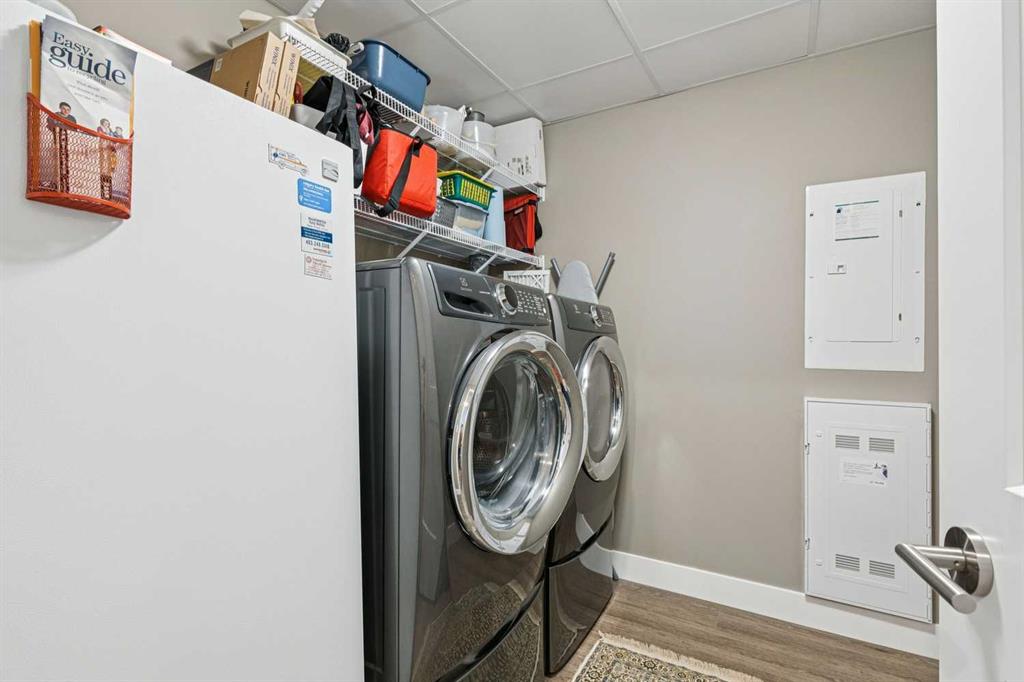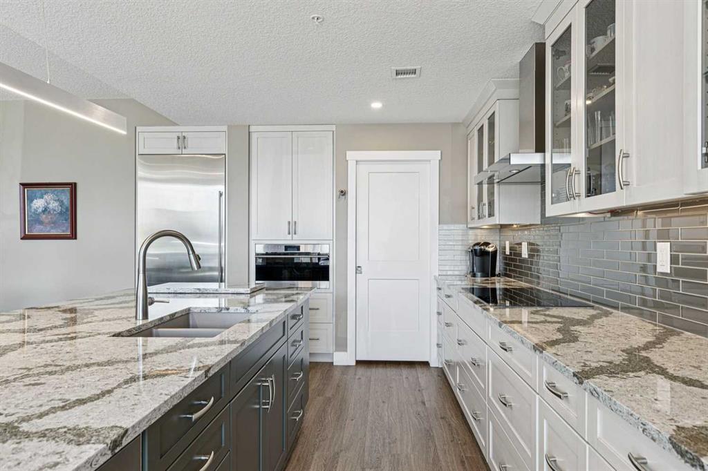 Experience 1,792 sq. ft. of Refined Single level living in this beautifully designed 2 Bedroom + Den residence Located in The Views, one of Calgary’s most coveted concrete and steel buildings on the prestigious west side. From the moment you enter, the open concept floor plan immediately impresses, offering a seamless connection between the Kitchen, Living, & Dining areas-perfect for entertaining. Soaring 9 ft ceilings, Luxury vinyl flooring, and expansive South facing floor to ceiling Windows bathe the home in natural light. The Chef inspired kitchen features a massive Island, Quartz countertops, Wolf induction cooktop & steam oven, Sub Zero Refrigerator, an Asko dishwasher & a generous Walk in pantry. The primary retreat features an ensuite with double sinks, an oversized shower, a private water closet, walk in closet and exceptional storage. There is also a second bedroom with walk in closet, a 4 pce Main Bathroom, & Laundry room with additional storage. The peaceful den provides a versatile space perfect for work, reading, or quiet relaxation. Enjoy the beautiful evening sunsets as you unwind on your balcony-outfitted with a gas hookup for effortless BBQs. Additional features include two underground parking stalls & a private storage locker in the heated parkade. The Views is renowned for its outstanding management and meticulous upkeep. Residents enjoy premium amenities including a fitness centre with infrared sauna, golf simulator, owners’ lounge, stylish lounge areas, secure bike storage, & an outdoor terrace with BBQs, fireplace & direct pathway access. Condo fees include heat, water, sewer, central air, exterior maintenance, landscaping, snow removal, & reserve fund contributions. Each home features individually controlled heating and cooling for year round comfort. This is more than a home—it’s a lifestyle defined by luxury, convenience, and community.