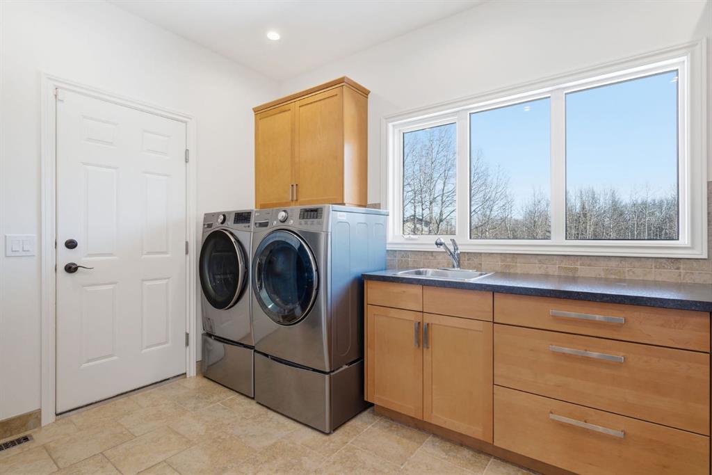 Inside, the home is bright in a way that changes the whole experience of acreage living. Windows in nearly every direction keep the outdoors present, refinished African walnut hardwood brings warmth underfoot, and the more traditional layout gives the home a sense of comfort and structure that is becoming harder to find. The rebuilt southwest-facing deck is a major part of this acreage’s way of living. Engineered with substantial beams and finished with heavy-weight UV-stabilized vinyl decking, it is a high-end outdoor space built to be used and enjoyed. Accordion doors off the living room open fully to the deck, allowing the whole main floor to breathe.