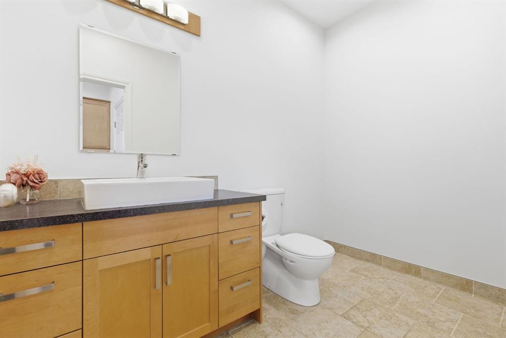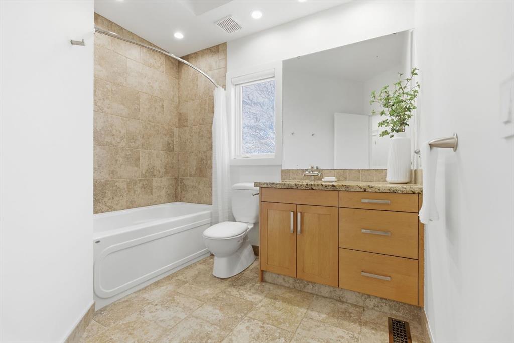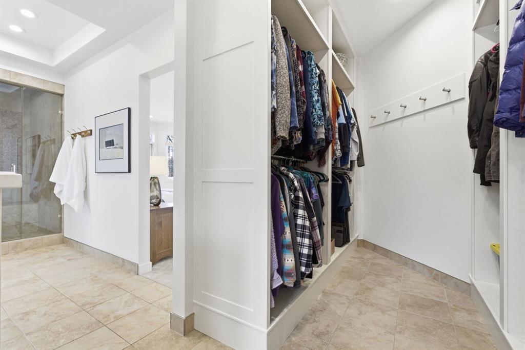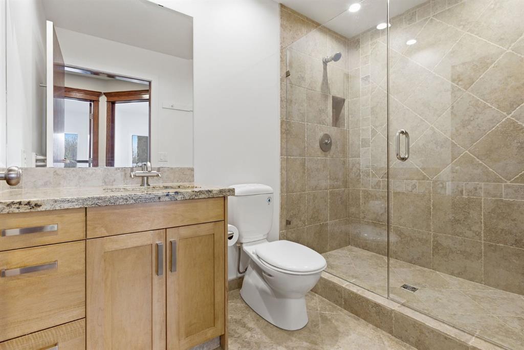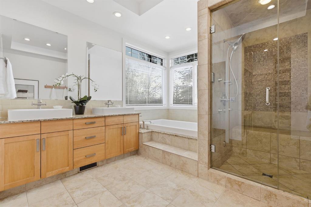 The main level is both comfortable and well planned, with a separate formal dining room, a bright kitchen, main floor laundry, and two bedrooms positioned away from the main living areas. The primary is tucked into a quieter corner of the home, creating a greater sense of privacy, while an additional main-floor bedroom offers flexibility for guests or office space. Three bathrooms on the main floor add to the ease of daily living, and the primary ensuite brings another layer of comfort with heated tile flooring, an air jet soaker tub, and a steam shower.