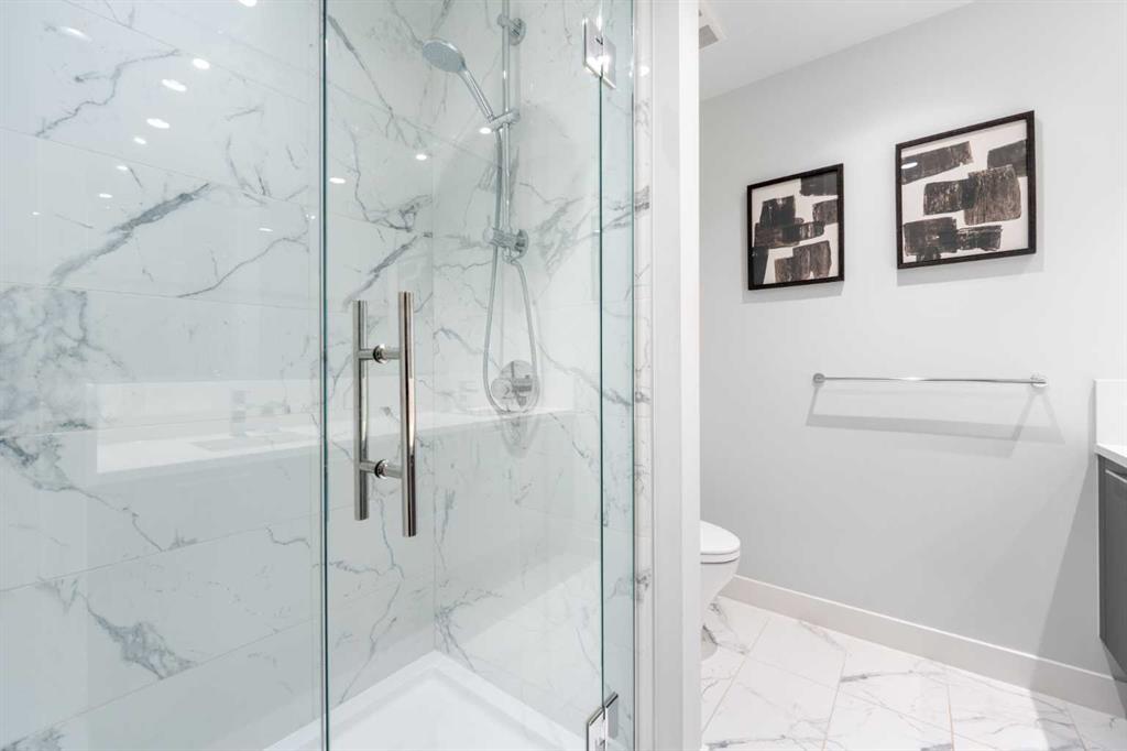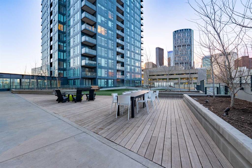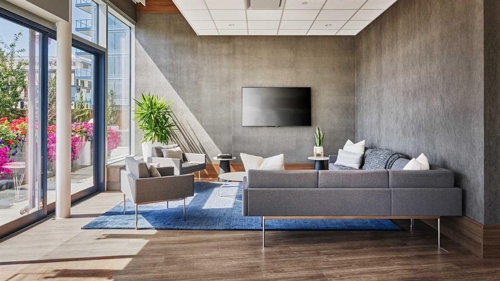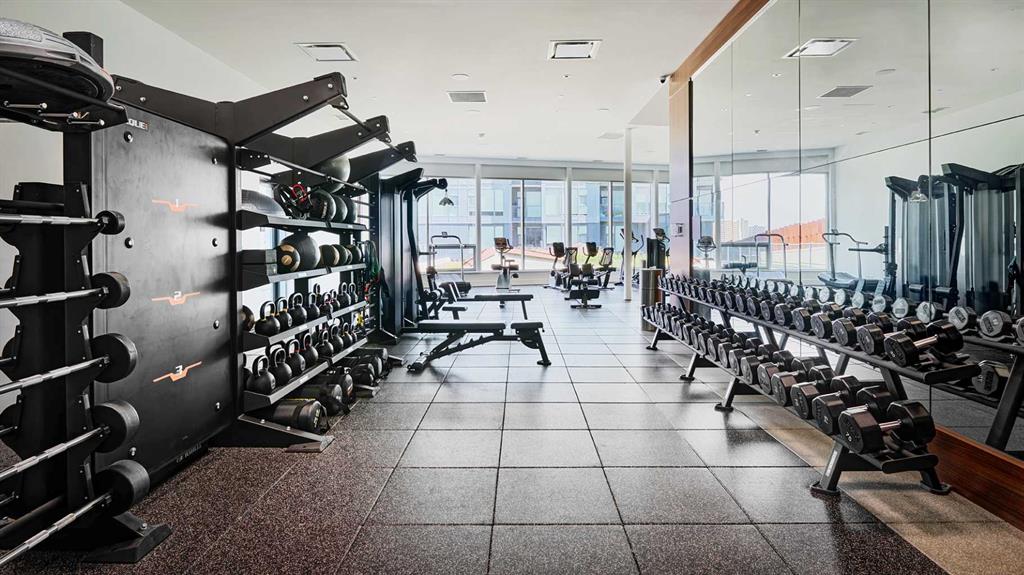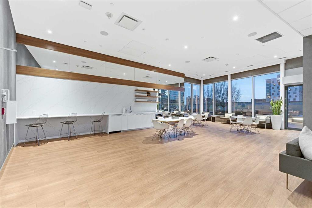 Arris offers world-class, resort-style amenities — widely regarded as the best in any Calgary condominium. The entire second floor is dedicated to resident amenities including an indoor swimming pool, hot tub, sauna, steam room, commercial-grade fitness centre with a dedicated spin and yoga studio, social lounge with bar counter and kitchenette, and a party room opening to an outdoor terrace. A rooftop turf dog park with city views and multiple outdoor gathering areas with fire features and seating complete the package.