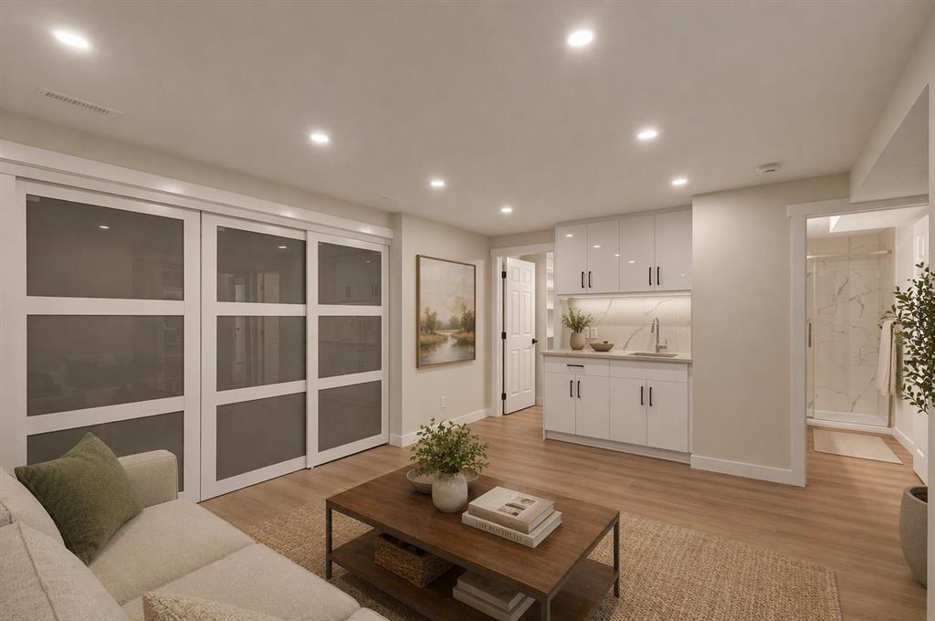 The newly finished lower level is an impressive extension of the home, designed with both function and elegance in mind. Featuring a guest bedroom, a sleek full bathroom, and a custom designer walk-in closet, this space is equally suited for family living or private accommodation.