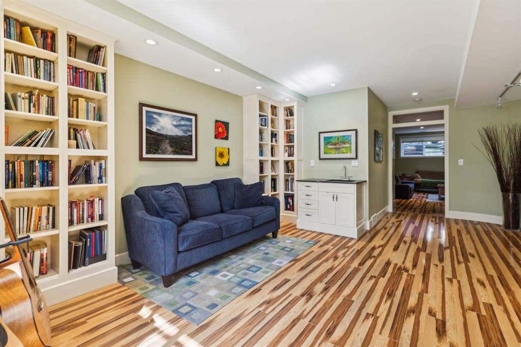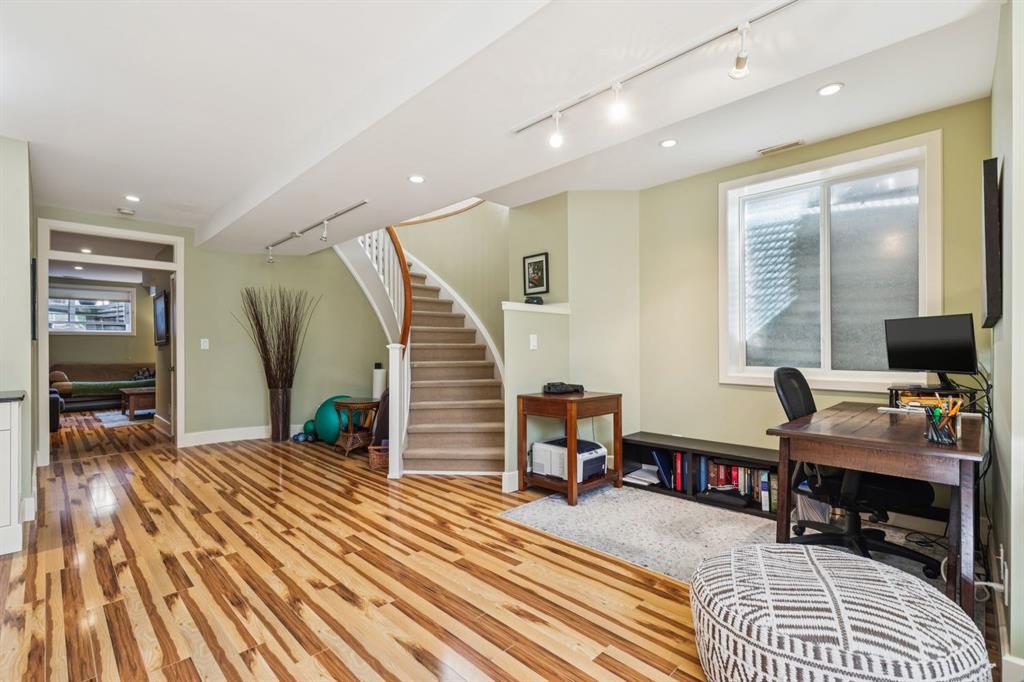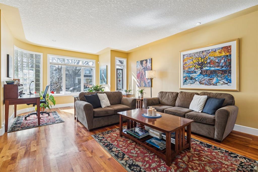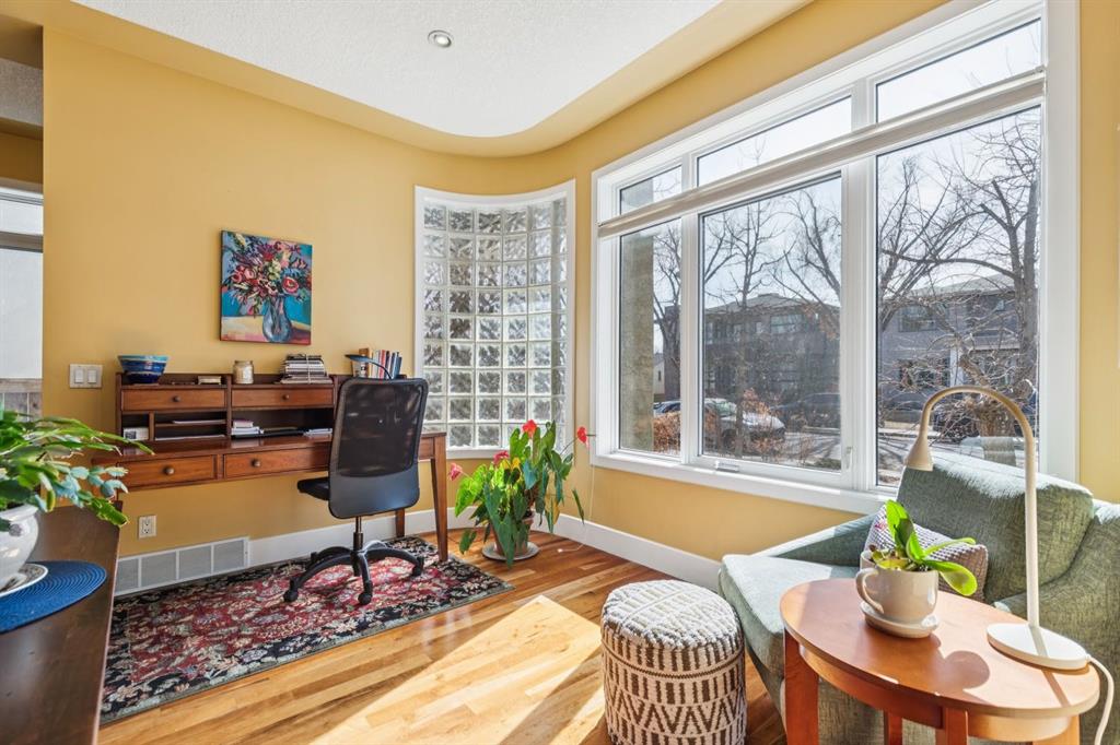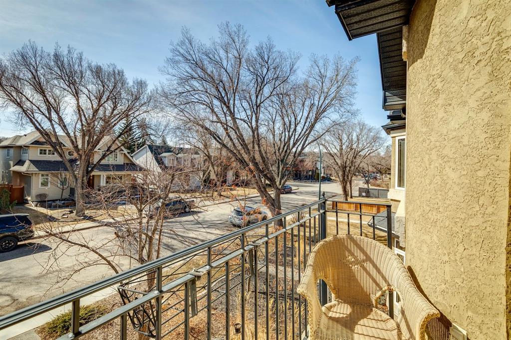 Welcome to this beautifully appointed South facing home in the highly sought after community of West Hillhurst, where inner city living meets nature and convenience. Perfectly situated just steps from the Karl Baker Off-Leash Dog Park, Helicopter Park, the scenic Bow River pathway system, and Foothills Hospital, this home also offers quick access to trendy Kensington, exceptional dining, and Calgary’s vibrant downtown core. As you walk up the beautifully landscaped front, you’ll notice a charming outdoor sitting area creating an inviting space to relax and greet passing neighbours. Inside, the main floor showcases rich hardwood flooring and a thoughtfully designed open concept layout. A bright front den/living room features a stunning two-way gas fireplace that seamlessly connects to the dining area and kitchen, ideal for both everyday living and entertaining. The kitchen is a culinary delight, complete with a central island, raised breakfast bar, prep sink, granite countertops, and an abundance of white shaker cabinetry, including elegant glass front display cabinets. Superior appliances include a gas cooktop and built-in oven. A functional mudroom leads to a convenient 2pc bathroom and provides access to the rear patio and double detached garage. A graceful curved staircase leads to the upper level, where vaulted ceilings and a skylight create an airy, light filled ambiance. This level offers three generously sized bedrooms, a full bathroom, and convenient stacked laundry. The spacious primary retreat is a true highlight, featuring a private front balcony where you can enjoy morning coffee or unwinding with a book, along with room for a sitting area. The luxurious 5pc ensuite includes a soaker tub, separate shower, and a custom walk-in closet. The fully developed lower level offers even more living space, with durable laminate flooring, a large recreation room with built-in bookshelves, a bar area with sink, and oversized windows that bring in plenty of natural light. A dedicated media room with a full wall of storage and a 3pc bathroom completes this level. Step outside to the rear patio, an ideal setting to host friends and family or simply relax and enjoy your own private oasis. This exceptional home combines style, comfort, and an unbeatable location making it perfect for professionals, families, and anyone looking to experience the best of inner city Calgary living.
