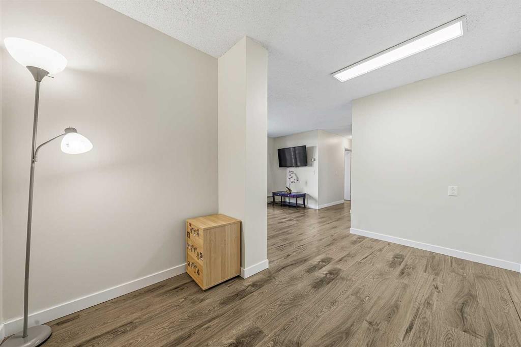 The beautifully updated kitchen features stainless steel appliances, sleek glossy white cabinetry, quartz countertops, and ceramic tile finishes. Durable laminate flooring with 3-inch baseboards runs through the main living areas and bedrooms, while neutral tones create a clean, modern feel throughout.