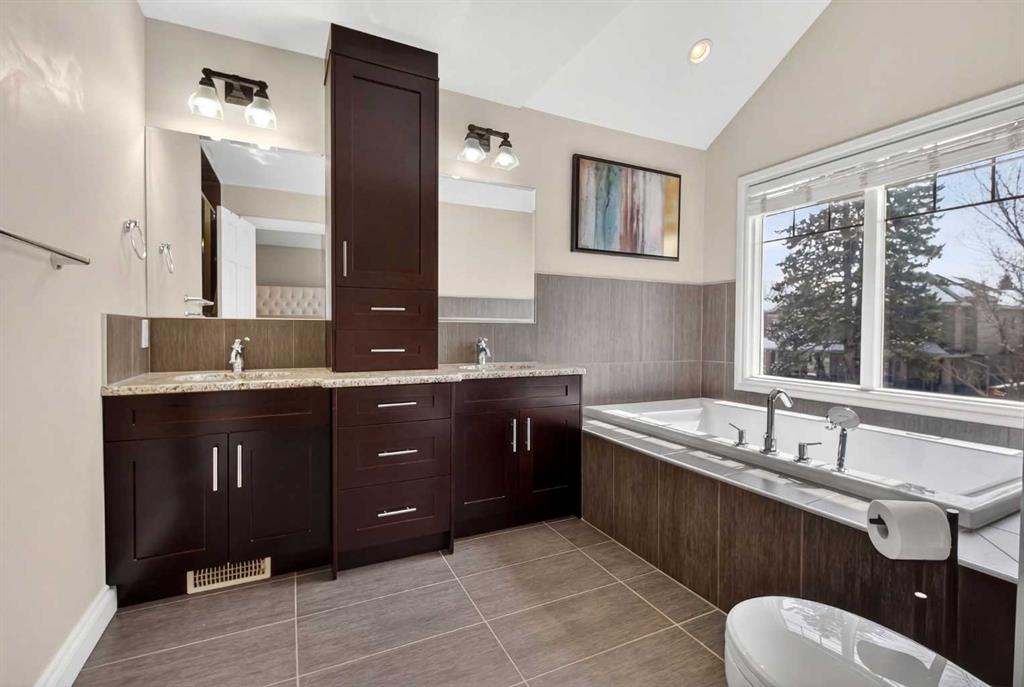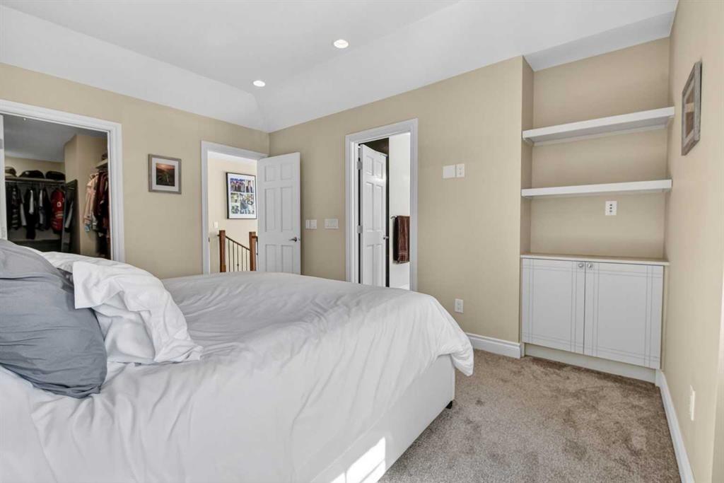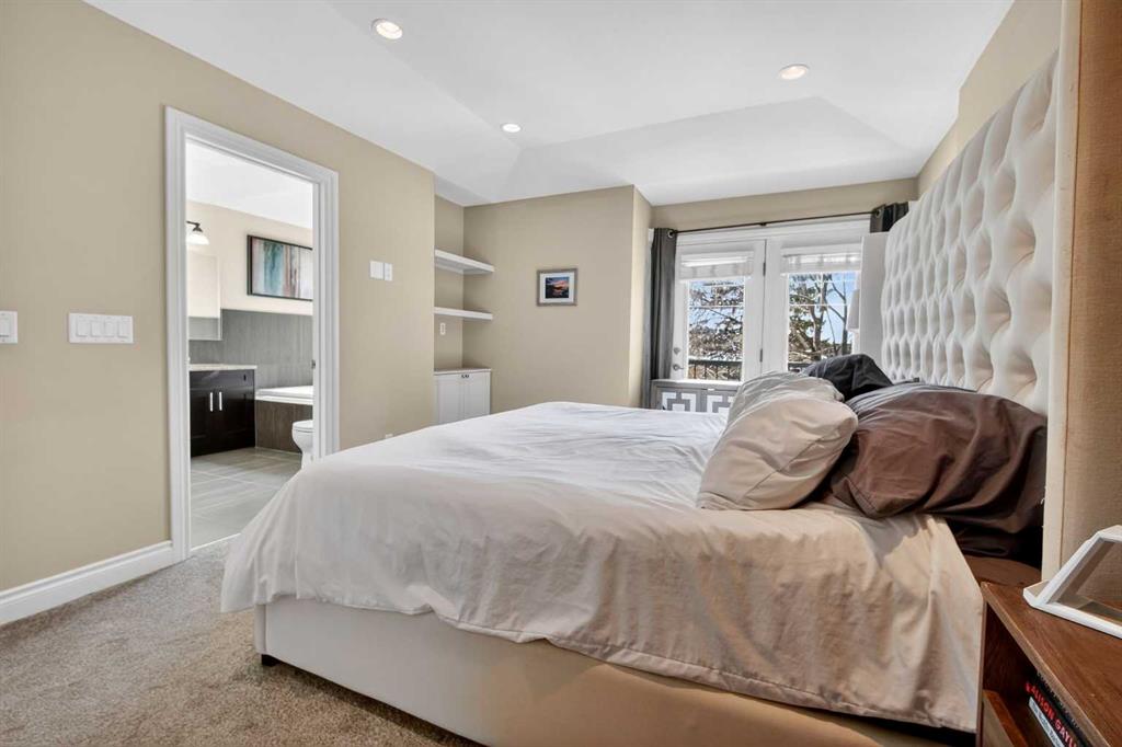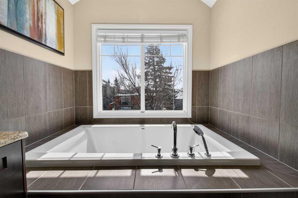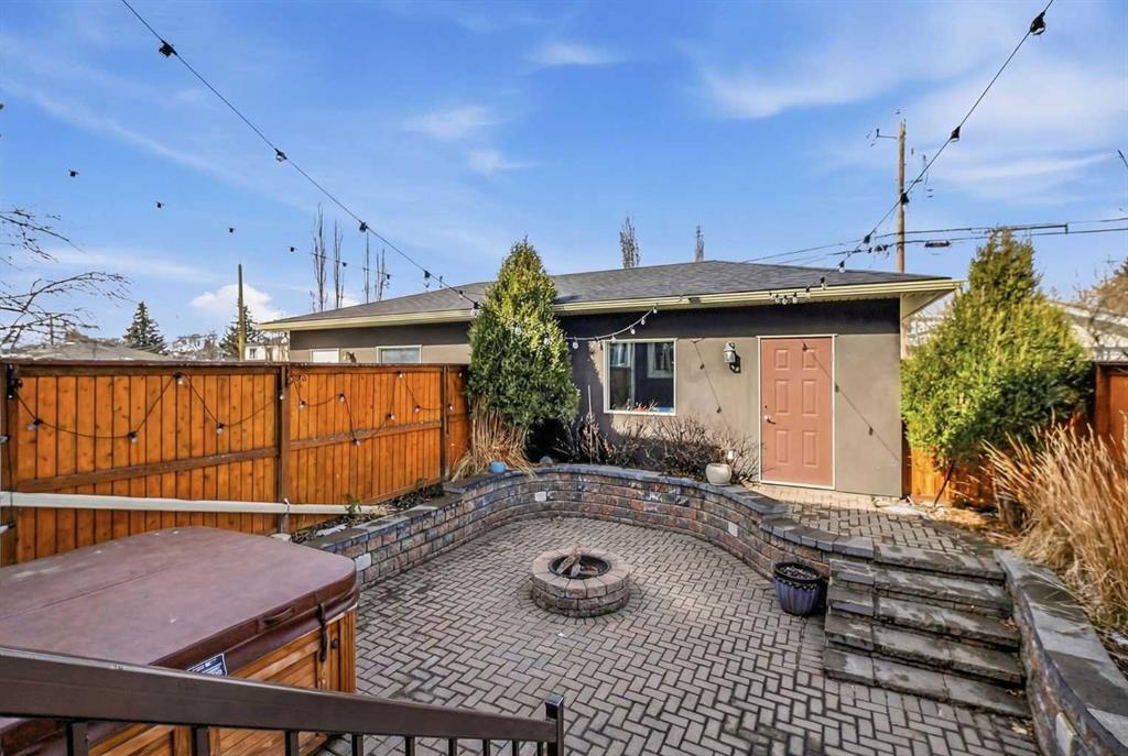 Beautifully designed semi-detached home in Capitol Hill, just minutes to SAIT, Confederation Park, transit, and walking distance to the downtown core. Eye-catching curb appeal with stone, stucco, and cedar, plus a sunny south-facing front porch. The solid wood front door with a 3-point locking system opens to a bright main floor featuring a striking open spiral staircase and a full wall of windows. The open-concept layout is ideal for entertaining, with a spacious kitchen offering a large granite island, premium Jenn-Air appliances including a 6-burner gas range and wall oven, and seamless flow into the living area with a stone gas fireplace. Solid wood rear doors lead to the backyard. The sunken backyard offers added privacy and is beautifully landscaped with patio pavers, a natural gas fire pit, and a hot tub, creating an ideal outdoor space. Upstairs features 8-foot ceilings throughout, a generous primary suite with Juliet doors, built-in storage, and a massive walk-in closet, along with two additional bedrooms, a full bath, and upper laundry. The fully developed basement includes a fourth bedroom, full bathroom, and a large flexible living space.