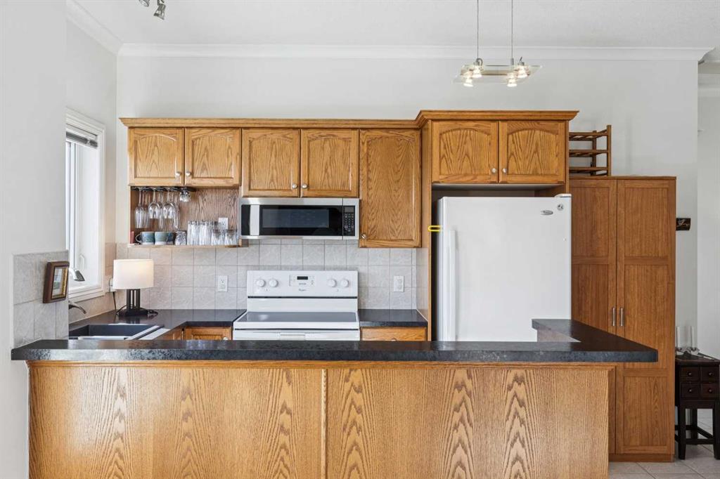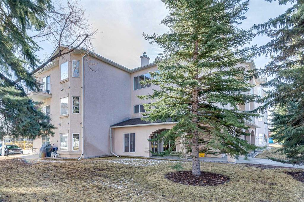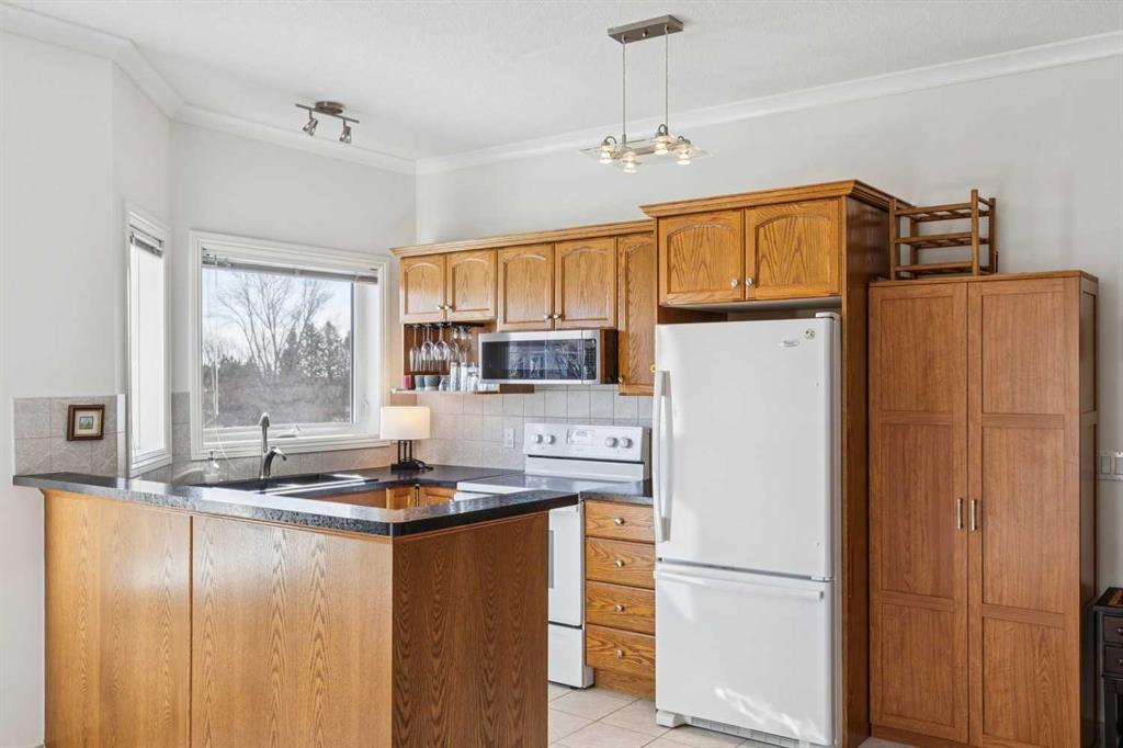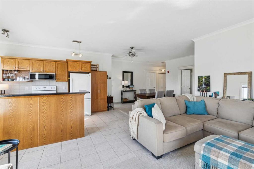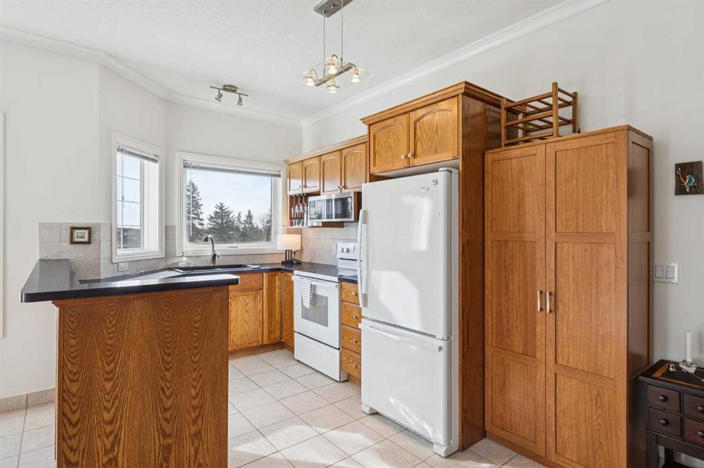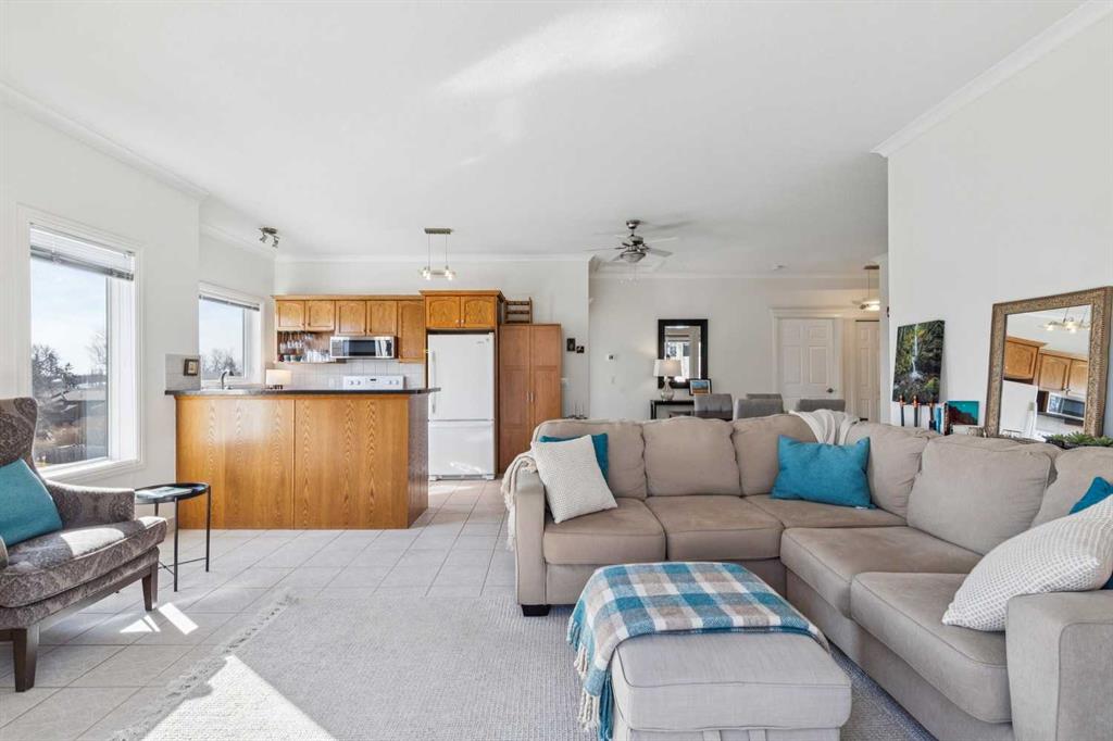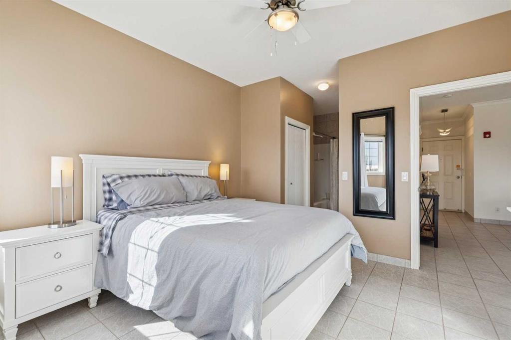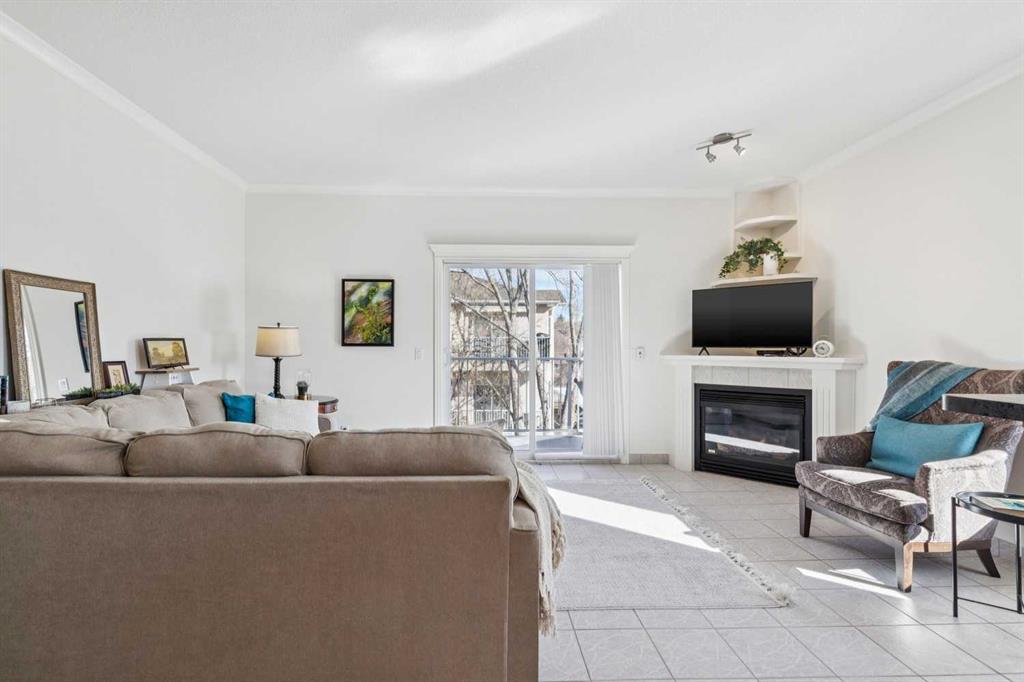 Welcome to this beautifully maintained 2-bedroom, 2-bathroom top-floor corner unit, offering one of the largest floor plans in the building. This bright and inviting home features 9-foot ceilings, elegant crown and cornice mouldings, and a cozy corner fireplace that anchors the living space. The thoughtful layout is complemented by durable tile flooring throughout, making it both stylish and highly functional. Enjoy year-round comfort with in-floor heating, and step outside to your spacious private deck overlooking a mature, treed green space. A perfect spot to relax or entertain. The building itself is exceptionally well cared for and self-managed, offering peace of mind and pride of ownership throughout. Additional features include: Elevator access, oversized doorways for enhanced accessibility, covered rear parking, on-site visitor parking, and a large on-site secured storage unit. Located just steps from historic downtown, you’ll love being close to schools, local coffee shops, boutique shopping, and scenic river pathways. Immaculate, move-in ready, and offering incredible value, this is one you don’t want to miss.