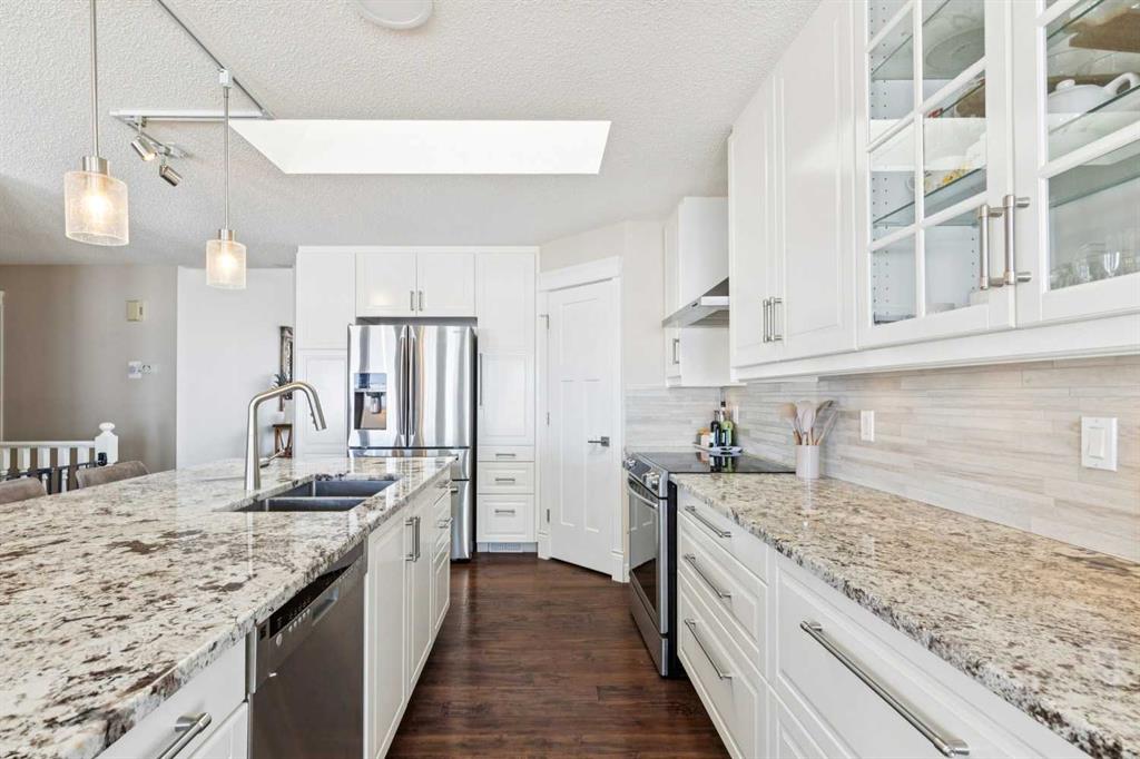 The kitchen showcases granite countertops, smooth white cabinetry, stainless steel appliances, a skylight, and large windows that fill the space with natural light. Step out onto the large balcony and take in the PANORAMIC MOUNTAIN VIEWS, perfect for relaxing or entertaining.