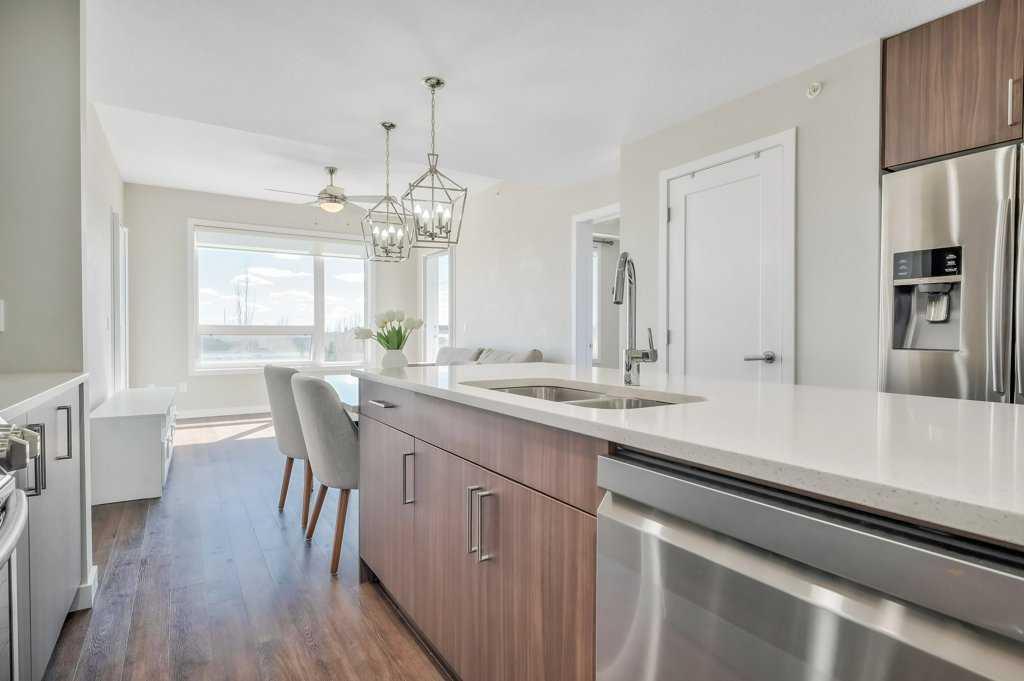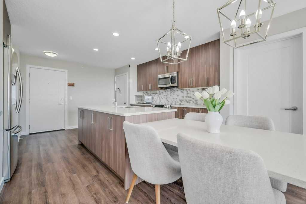 Step inside to discover an open floor plan accentuated by high-end laminate flooring that adds a touch of elegance to the living areas. The kitchen is a culinary dream featuring rich, dark cabinetry paired with light-coloured countertops and a sizable island that seamlessly incorporates a built-in quartz dining bar – perfect for serving up morning pancakes or evening cocktails.