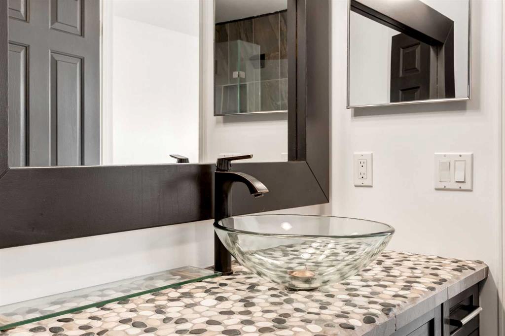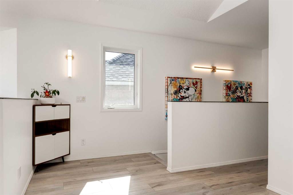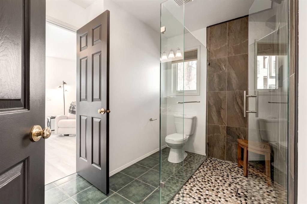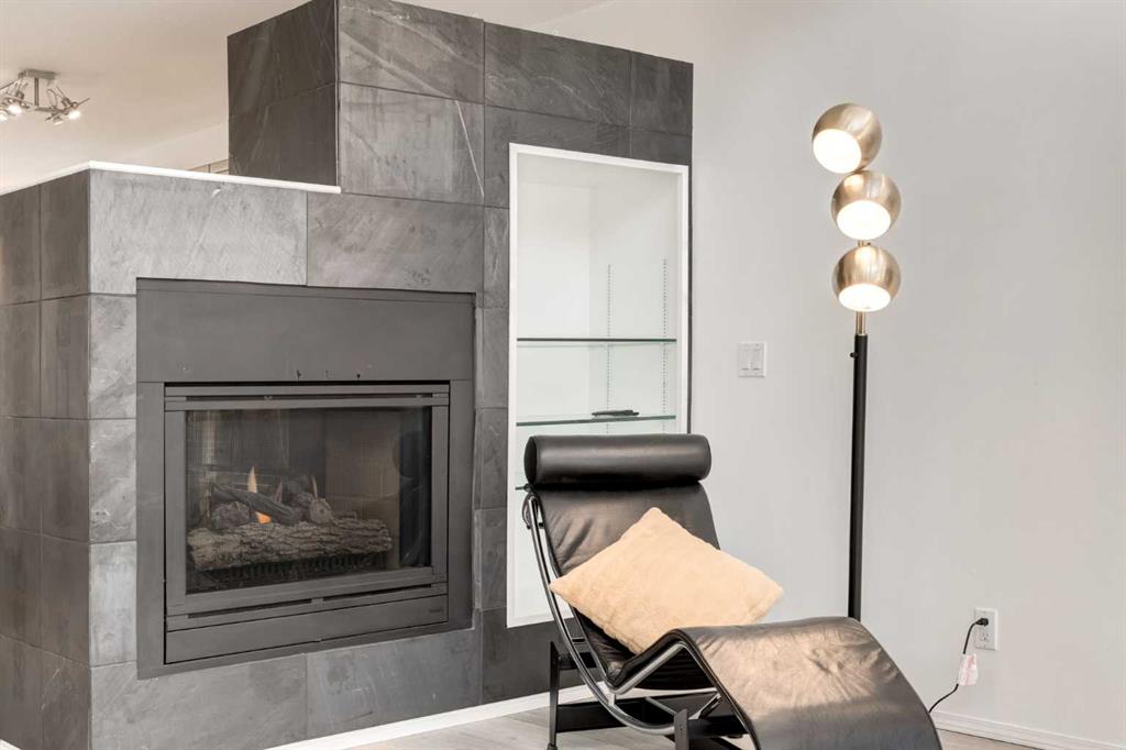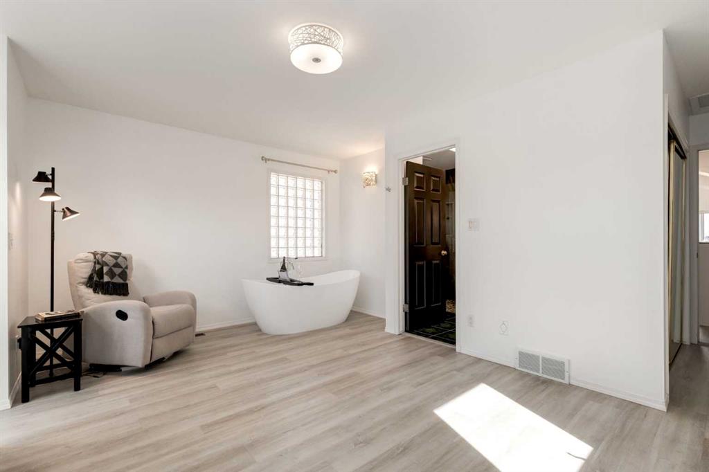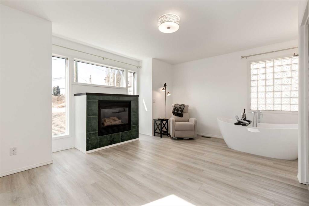Upstairs, a lofted flex space overlooks the living room and is complemented by skylights. Two bedrooms complete this level, including a primary retreat with a fireplace, cheater ensuite with glass shower, and a statement vessel-style bathtub positioned within the bedroom for a spa-like atmosphere.