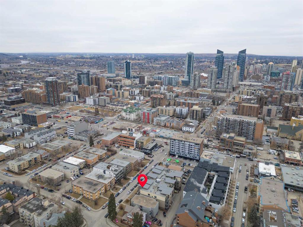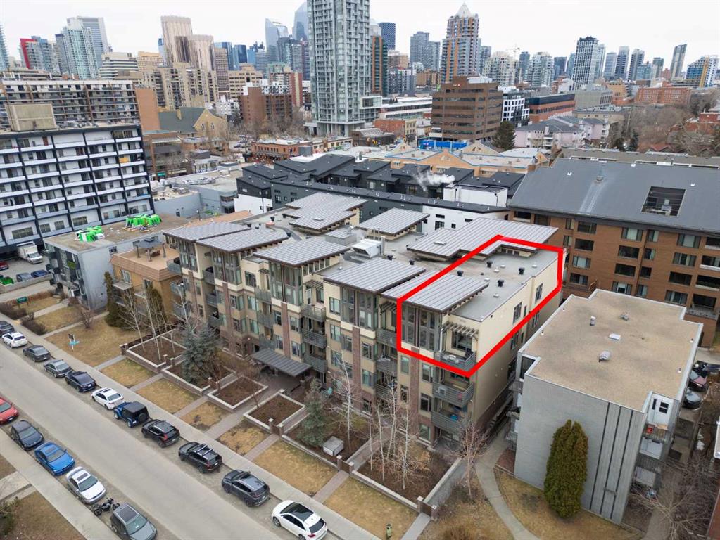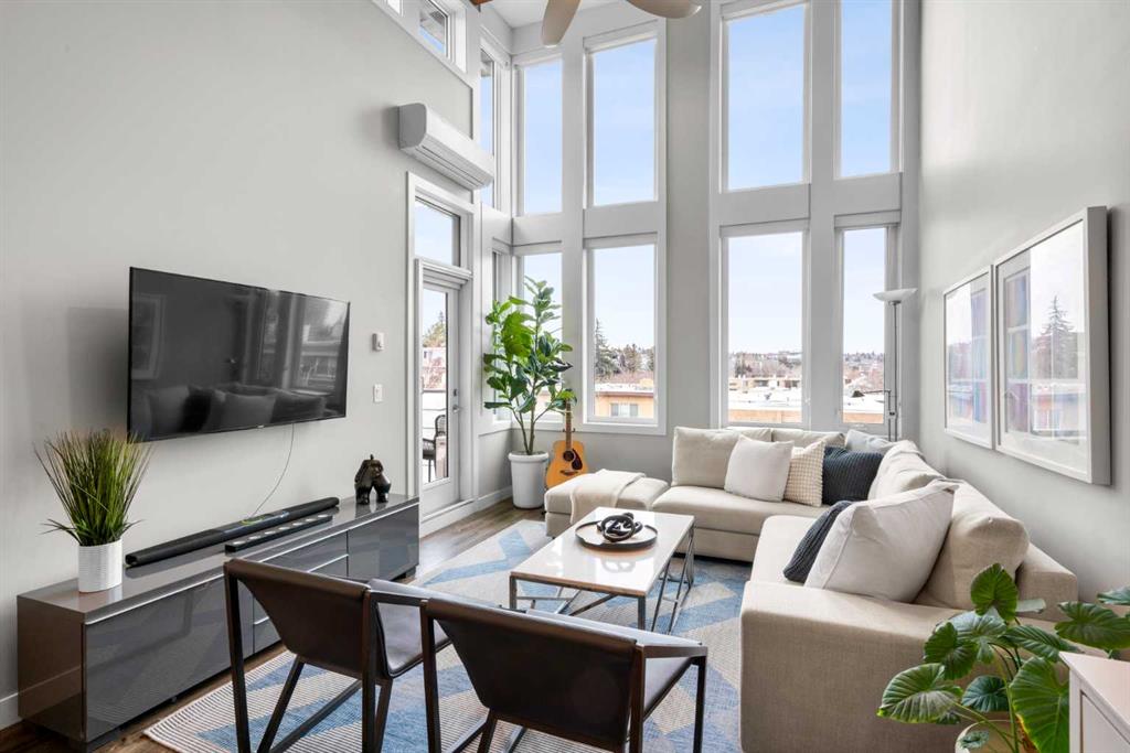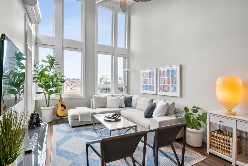 Welcome to one of the most desirable residences in the building, an exceptional two-bedroom PENTHOUSE SW corner unit in Lower Mount Royal just steps from vibrant 17th Avenue. Privately positioned on the top floor, this home enjoys premium west exposure with dramatic 15+ ft vaulted ceilings and floor-to-ceiling windows that fill the space with natural light.