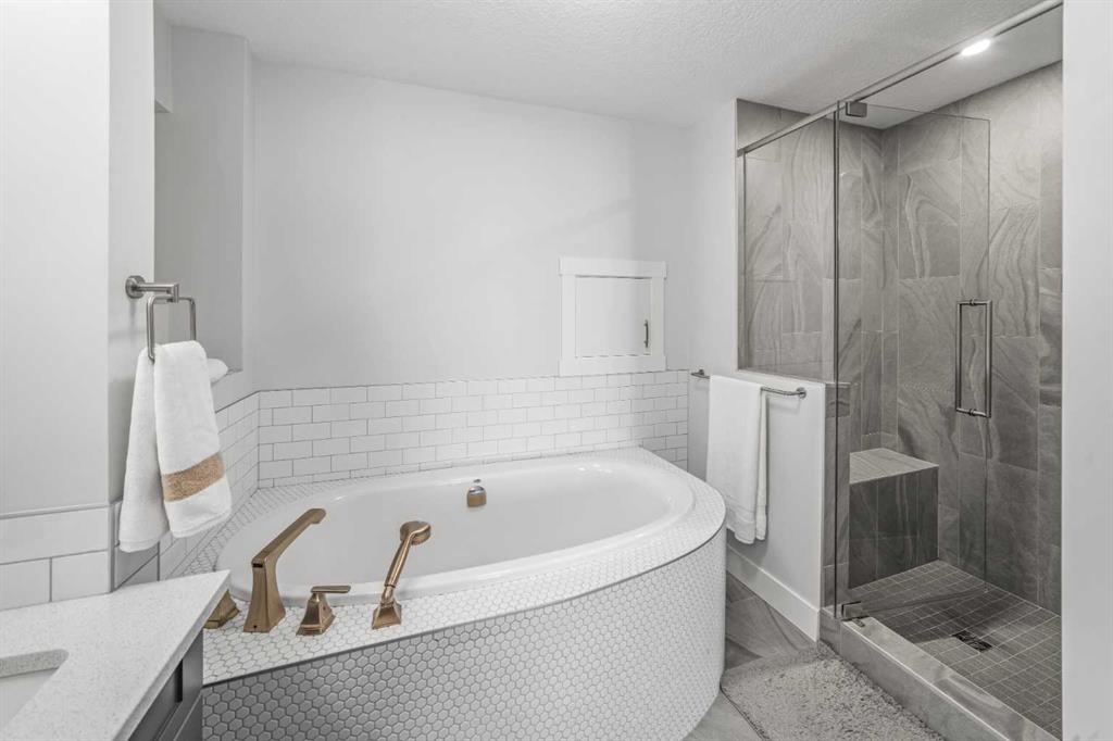 The primary suite is a true retreat, anchored by a large window capturing stunning views. The spa-inspired ensuite offers a soaker tub, a walk-in shower with an incorporated bench, a double vanity, and custom built-ins. A convenient pass-through panel provides direct access to the adjacent laundry room, complete with a sink and additional storage.