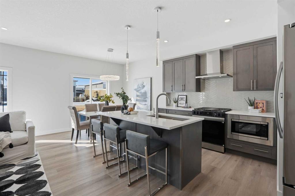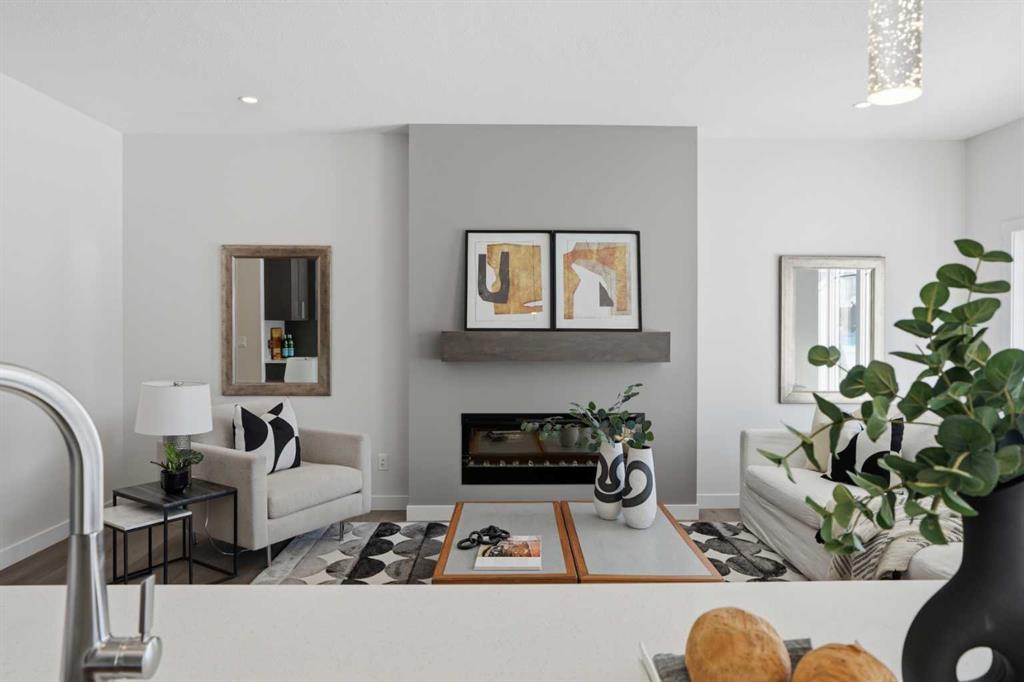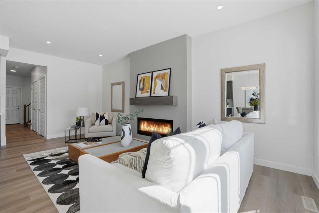 The main level features a private office and a beautifully appointed 3-piece bath, ideal for guests or working from home. At the heart of the home is a chef-inspired kitchen, complete with sparkling quartz countertops, full-height upper cabinetry, premium stainless steel appliances, a generous island with bar seating, and a walk-in pantry—perfect for both everyday living and entertaining. The adjoining living area is anchored by a sleek electric fireplace and enhanced by expansive windows that flood the space with natural light, complemented by modern recessed lighting.