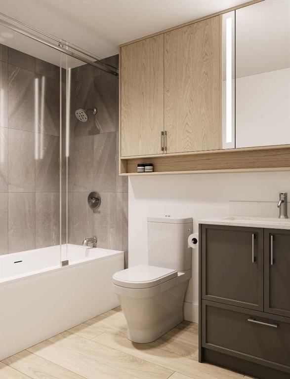 The sleek kitchen showcases quartz countertops, full-height cabinetry, under-mount sinks, and a central island with pendant lighting. Energy-efficient stainless-steel appliances and smart-controlled stacked laundry provide both convenience and modern efficiency. Retreat to the well-appointed bedroom complete with a generous walk-in closet, while the elegant bathroom features clean modern detailing, quartz surfaces, and timeless fixtures. Durable luxury vinyl plank flooring flows throughout, complemented by curated interior palettes and contemporary ceiling finishes. Enjoy outdoor relaxation on your private balcony. Built with quality construction standards including triple-pane windows, engineered floor systems, and enhanced soundproofing, this home offers comfort, quiet, and energy efficiency.