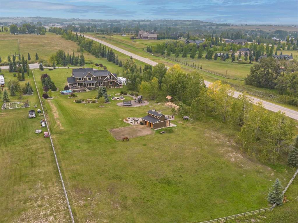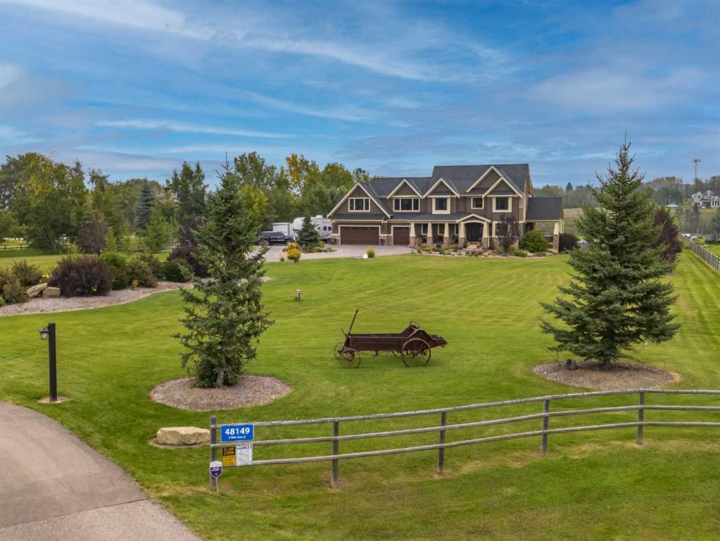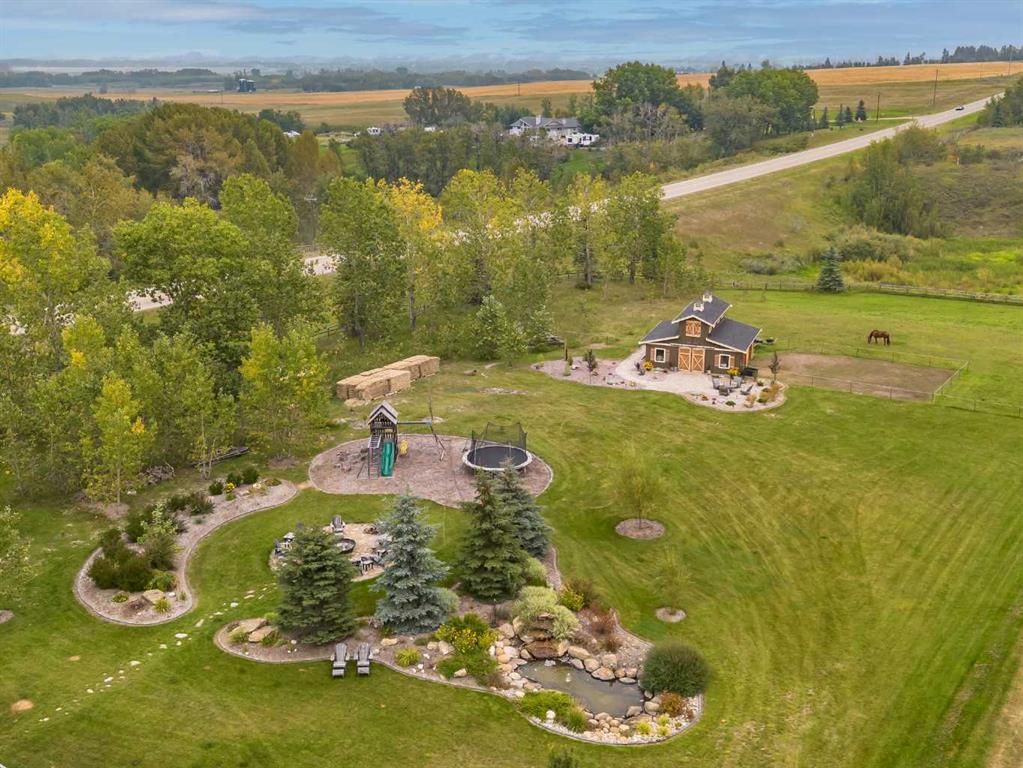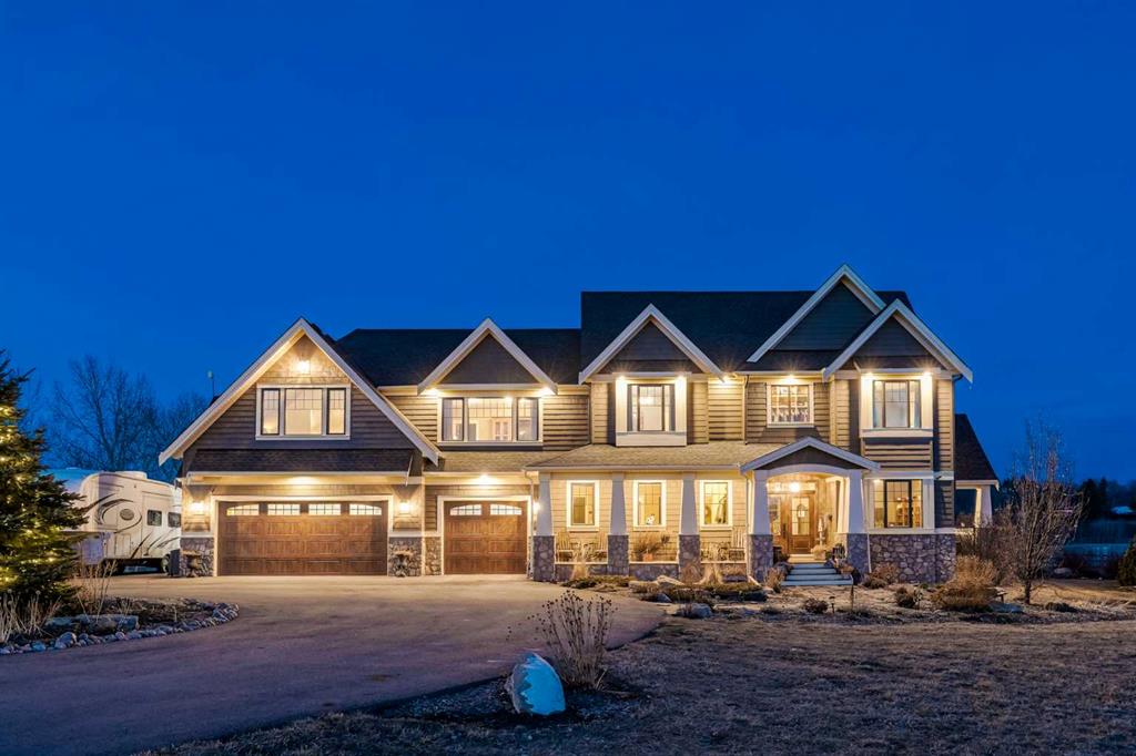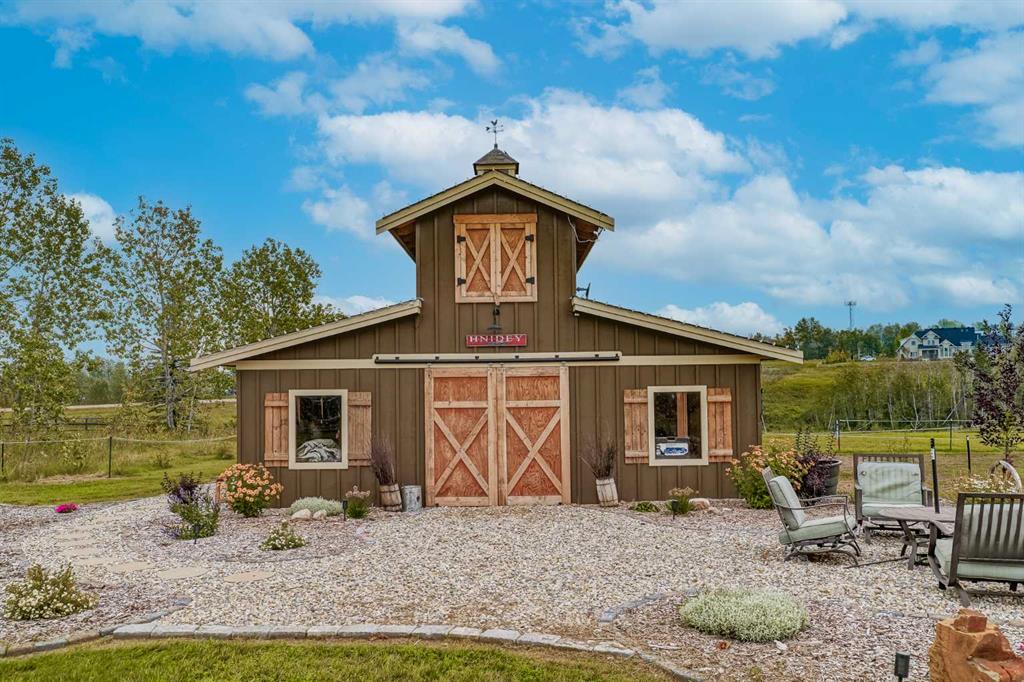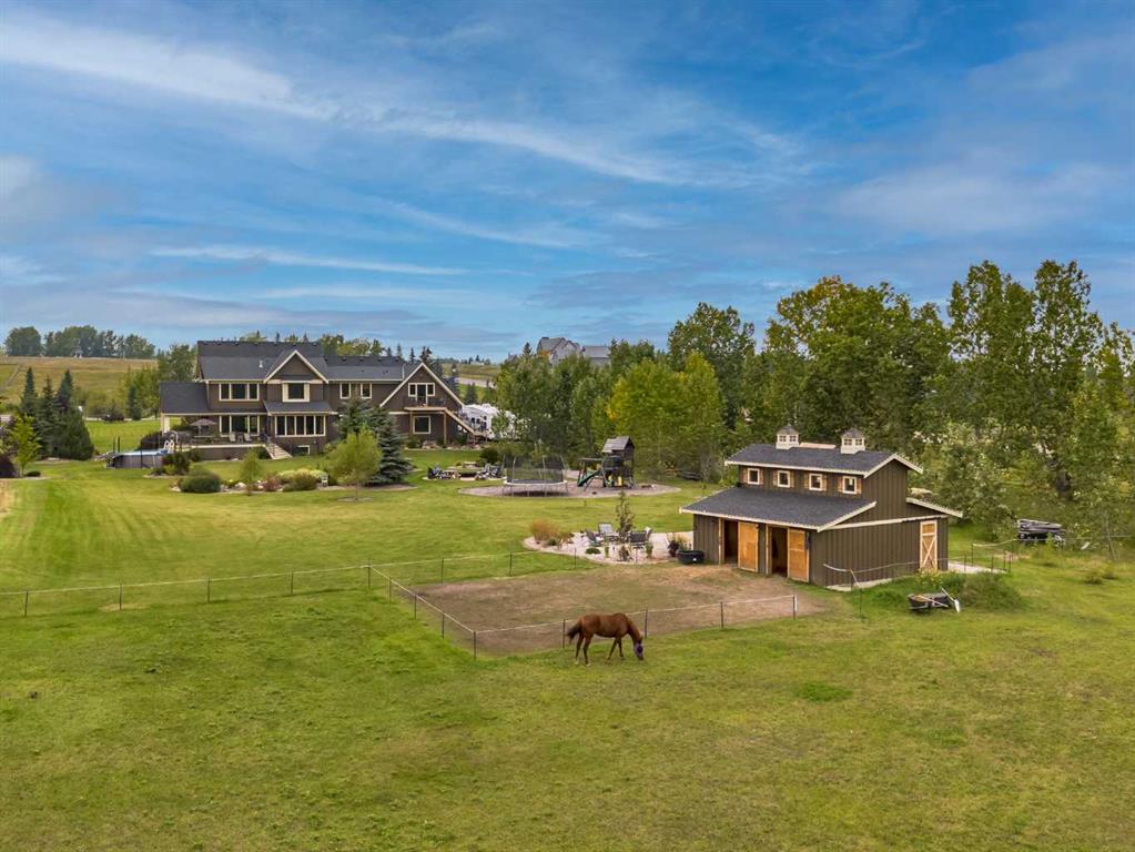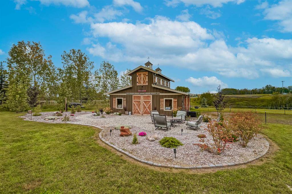 From the moment you drive up, there’s an immediate sense that this property is something special—set on 4.26 beautifully developed acres, it offers both presence and a quiet, understated grandeur. The home’s exterior showcases shingle-style siding crafted from high-quality compressed wood, complemented by extensive board and batten detailing and steep gables, creating a timeless architectural look carried consistently through the 5,589 sqft home and extended across the outbuildings. Expansive windows throughout invite natural light and capture views in every direction, while the interior offers a sense of comfort and ease felt the moment you walk through the door. At the heart of the home is a beautifully designed kitchen with hand-painted raised panel cabinetry, marble and granite surfaces, a statement double fridge/freezer, and a 48” dual fuel range. A walk-in pantry with a bar fridge and copper sink offers additional prep space, while custom reclaimed wood shelving adds warmth and character. Rare oiled wide-plank hardwood, travertine, and copper fixtures are featured consistently across the home. The main living areas extend seamlessly to a covered outdoor space with a vaulted wood ceiling and a double-sided fireplace, enhancing both indoor and outdoor ambiance. A custom open staircase connects all levels, leading to an upper level with dual primary walk-in closets connected directly to the laundry room for a practical circular flow. An attached nanny suite offers flexibility with a private entrance, deck, full bathroom, and bar area—ideal for guests or extended family. The grounds feature extensive custom stonework, cobblestone pathways, and mature landscaping surrounding a tranquil pond. Raised garden beds, a fully enclosed vegetable garden, and an insulated, powered chicken coop match the main home’s aesthetic. Irrigation and power are distributed across the entire property for easy maintenance. Perfectly suited for horse owners, the setup includes a barn with a landscaped patio, a dedicated recreation/pool table space, matching horse shelters, and additional fenced livestock areas. The oversized 1,500 sqft heated garage includes built-in cabinetry, extensive paved parking, and RV parking with full power hookup. Built for long-term performance, the home includes a triple furnace system for zoned heating, dual AC, boiler-based in-floor heat in the basement, and year-round water access in the garage. Every structure has been designed to complement the home, creating a cohesive and well-executed acreage where nothing feels out of place. This is more than a home; it’s a place to live well, gather often, and enjoy every season.