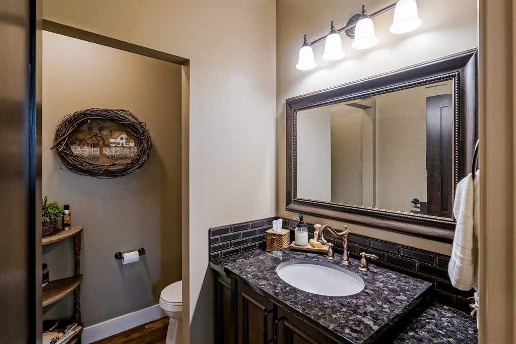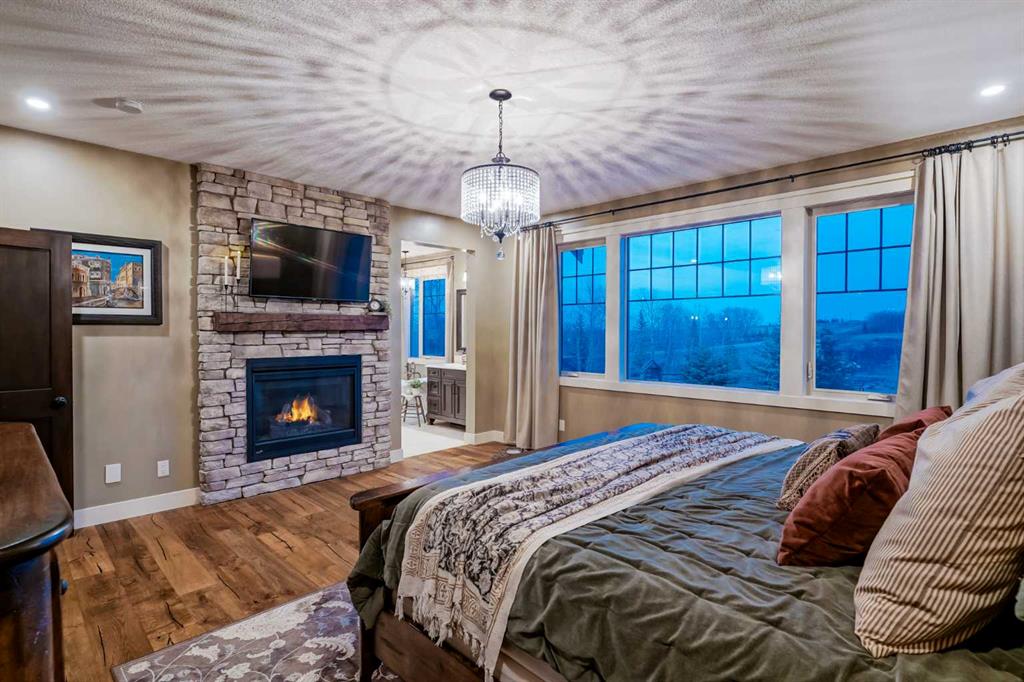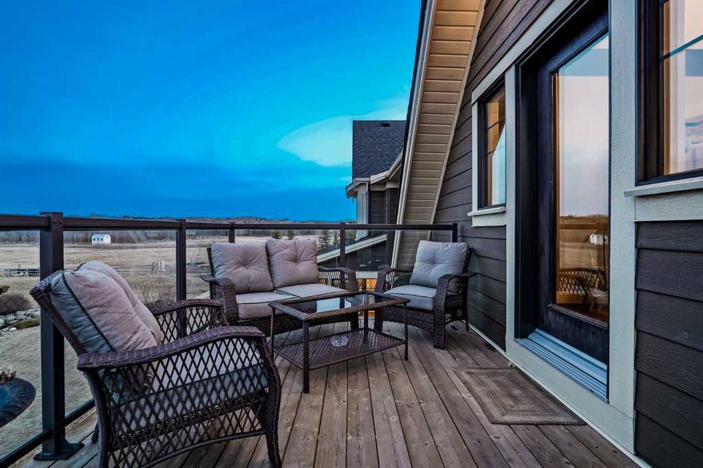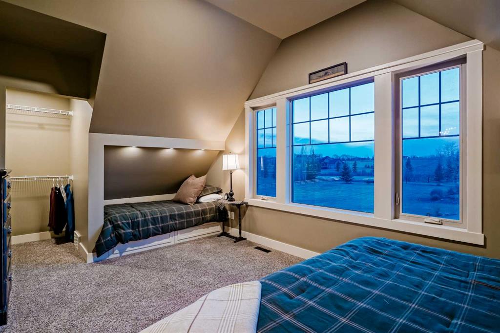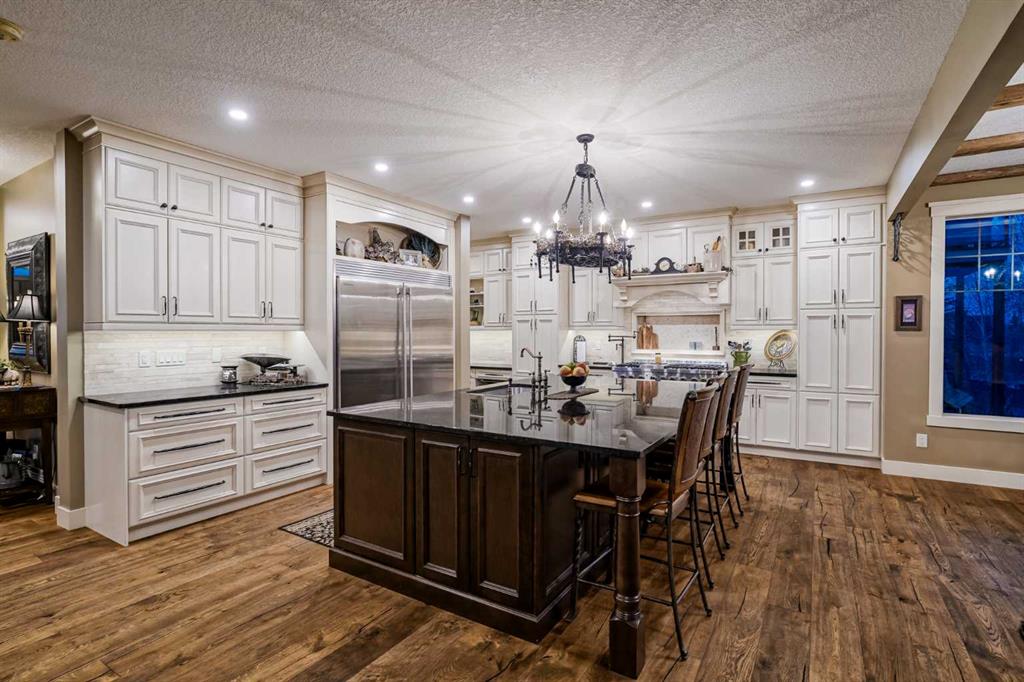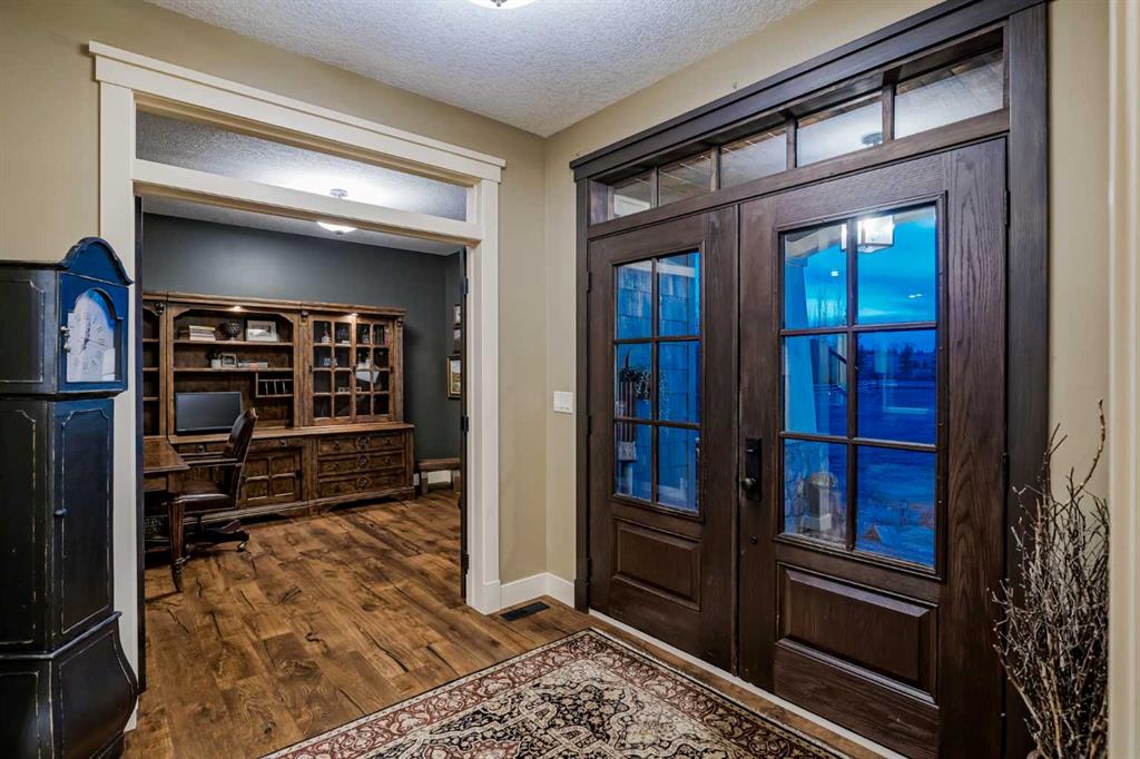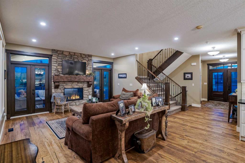 From the moment you drive up, there’s an immediate sense that this property is something special—set on 4.26 beautifully developed acres, it offers both presence and a quiet, understated grandeur. The home’s exterior showcases shingle-style siding crafted from high-quality compressed wood, complemented by extensive board and batten detailing and steep gables, creating a timeless architectural look carried consistently through the 5,589 sqft home and extended across the outbuildings. Expansive windows throughout invite natural light and capture views in every direction, while the interior offers a sense of comfort and ease felt the moment you walk through the door. At the heart of the home is a beautifully designed kitchen with hand-painted raised panel cabinetry, marble and granite surfaces, a statement double fridge/freezer, and a 48” dual fuel range. A walk-in pantry with a bar fridge and copper sink offers additional prep space, while custom reclaimed wood shelving adds warmth and character. Rare oiled wide-plank hardwood, travertine, and copper fixtures are featured consistently across the home. The main living areas extend seamlessly to a covered outdoor space with a vaulted wood ceiling and a double-sided fireplace, enhancing both indoor and outdoor ambiance. A custom open staircase connects all levels, leading to an upper level with dual primary walk-in closets connected directly to the laundry room for a practical circular flow. An attached nanny suite offers flexibility with a private entrance, deck, full bathroom, and bar area—ideal for guests or extended family. The grounds feature extensive custom stonework, cobblestone pathways, and mature landscaping surrounding a tranquil pond. Raised garden beds, a fully enclosed vegetable garden, and an insulated, powered chicken coop match the main home’s aesthetic. Irrigation and power are distributed across the entire property for easy maintenance. Perfectly suited for horse owners, the setup includes a barn with a landscaped patio, a dedicated recreation/pool table space, matching horse shelters, and additional fenced livestock areas. The oversized 1,500 sqft heated garage includes built-in cabinetry, extensive paved parking, and RV parking with full power hookup. Built for long-term performance, the home includes a triple furnace system for zoned heating, dual AC, boiler-based in-floor heat in the basement, and year-round water access in the garage. Every structure has been designed to complement the home, creating a cohesive and well-executed acreage where nothing feels out of place. This is more than a home; it’s a place to live well, gather often, and enjoy every season.