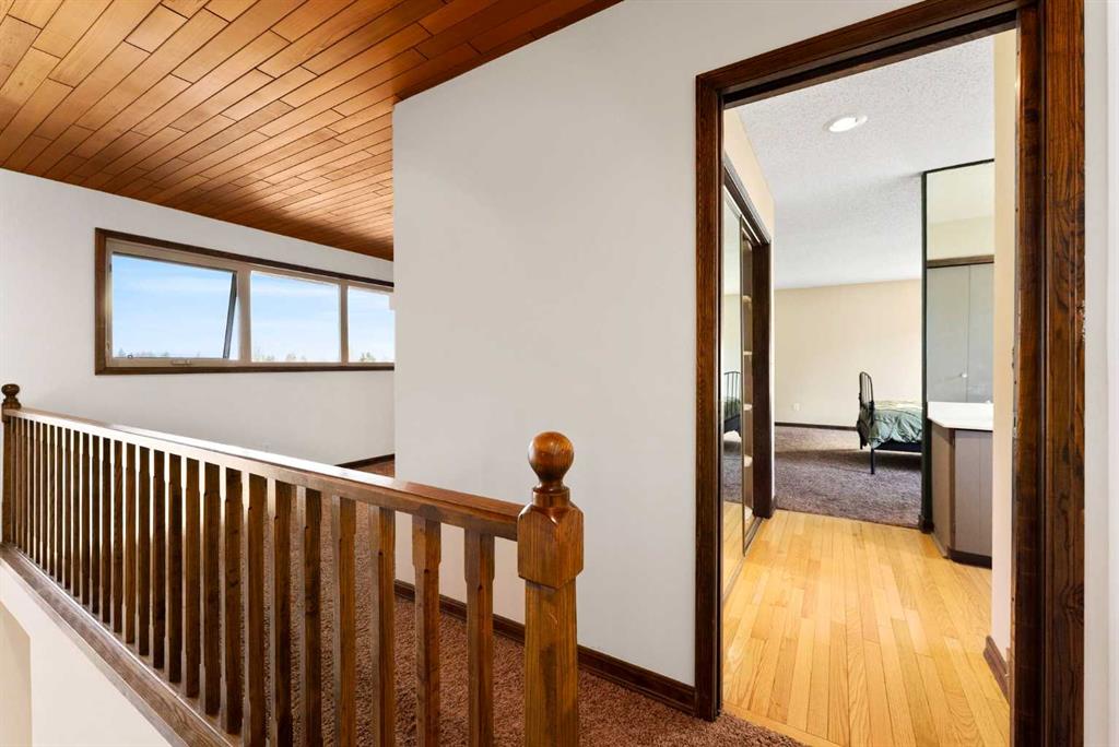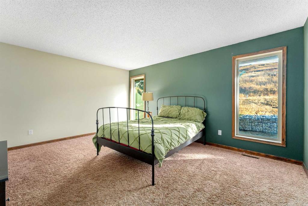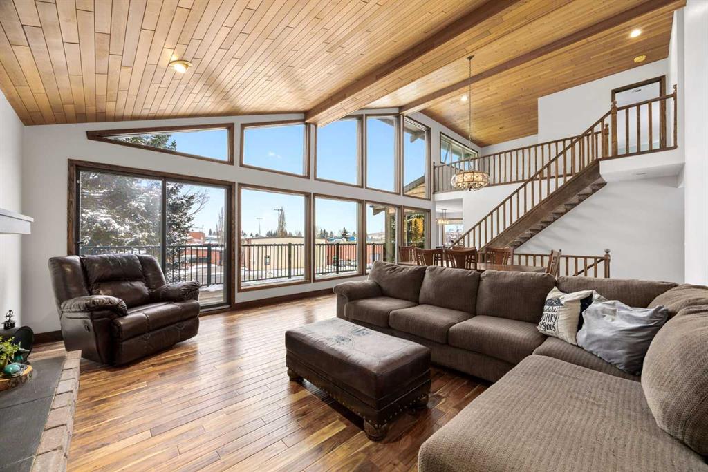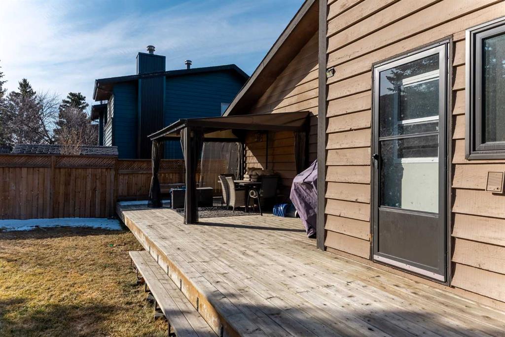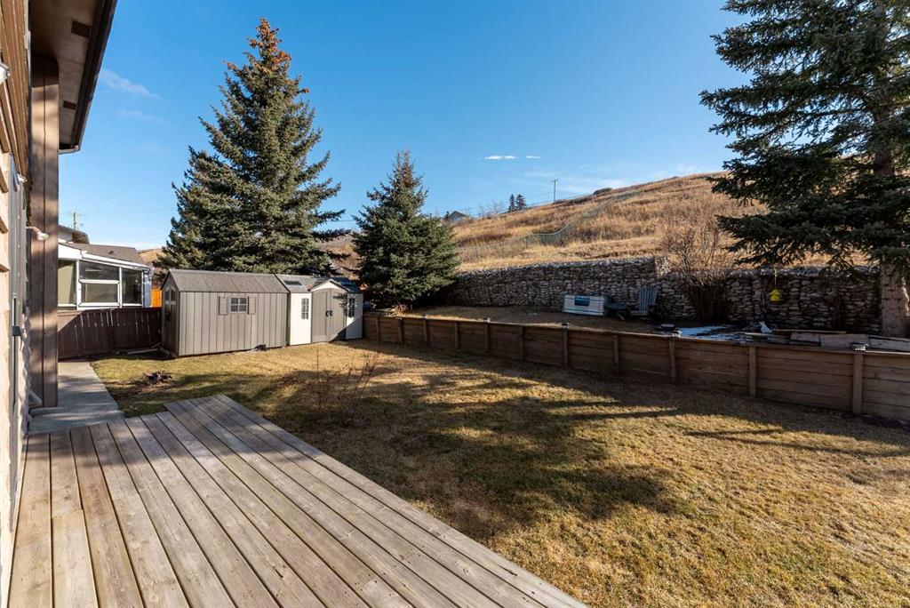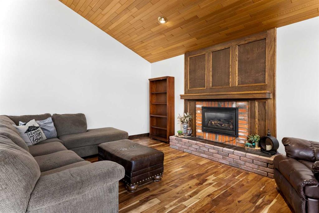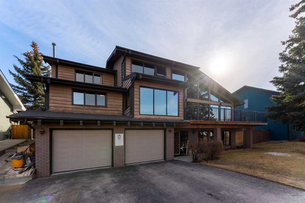 Set on a spacious 0.40-acre lot directly across from Cochrane’s tri-school site and indoor arena. This home is perfectly positioned for families; kids can walk to everything. Unique 1.5-storey reverse walkout offers 3 bedrooms and 2.5 bathrooms, combining comfort with a distinctive layout. The main entry welcomes you with a large, bright family room showcasing new luxury vinyl plank flooring and a cozy gas insert brick fireplace. Additional features include rough-in plumbing for a future wet bar, a convenient half bath with laundry, and direct access to the oversized 23' x 23' double attached heated garage, complete with durable epoxy floors. Upstairs, the main level showcases a spacious living and dining area with vaulted wood ceilings, a second gas fireplace, and a wall of tinted front windows plus sliding doors leading to the newly refurbished, wrap-around deck. Perfect for relaxing, entertaining, and taking in the surrounding mountain views. The kitchen is well-appointed with stainless steel appliances, granite countertops, under-mount lighting, an island, and a cozy breakfast nook with access to the deck, complete with gas line for BBQ. This level also includes two generously sized bedrooms, one featuring a Murphy bed, and a 5-piece bathroom with washer and dryer. A rear exit leads to a beautifully landscaped yard complete with patio, gazebo, and two storage sheds. The upper loft overlooks the main living space and is ideal for a home office, gym, or reading area. Adjacent is the primary suite, offering a walk-in closet, 4-piece ensuite, and lovely front and rear views of the property. Additional highlights include fresh paint and carpet, paved driveway with space for four vehicles, mature trees, and well-maintained landscaping. If you're looking for a home with character, space, and an unbeatable location, this is it. Quick possession available.