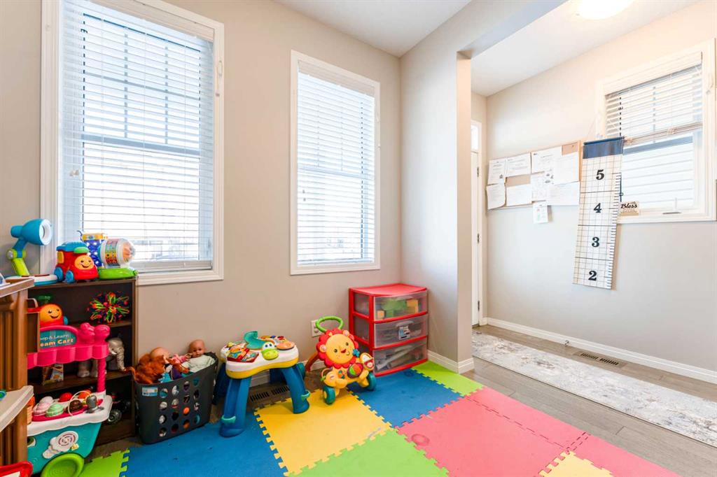 From the moment you step inside, you’re greeted by 9-foot ceilings, rich hardwood flooring, and an inviting open-concept layout that creates a bright and airy atmosphere. The upgraded kitchen cabinetry anchors the main floor, offering both elegance and practicality for cooking and entertaining. This level also features a dedicated home office-currently used as a Dayhome play area, a spacious living room, a well-defined dining area, and a convenient 2-piece bath—ideal for modern family living and remote work flexibility.