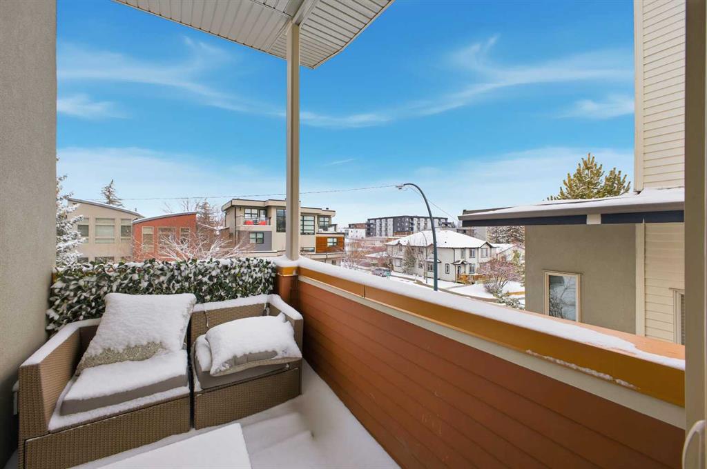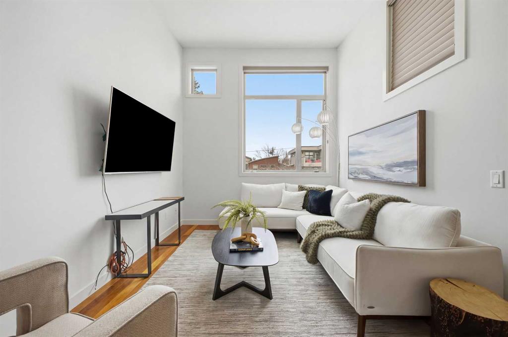 Welcome to this stylish and thoughtfully designed split-level end-unit townhome facing the street. Offering over 1,200 square feet of living space. This modern home features a functional layout ideal for both everyday living and entertaining, with freshly painted walls and beautiful hardwood flooring throughout. The main floor welcomes you with a bright foyer leading into a spacious dining area adjacent to the kitchen, complete with ample cabinetry, generous counter space, and a convenient breakfast bar. A two-piece bathroom completes this level. On the second floor, enjoy a large and inviting living room with access to a private balcony—perfect for relaxing or hosting guests. The separation from the kitchen level creates a unique open-yet-private feel throughout the home. The third floor is dedicated to the primary retreat, featuring a generously sized bedroom, a full four-piece bathroom, and convenient in-suite laundry. The top floor adds exceptional versatility with a spacious office and walk-in closet, ideal for a home workspace, guest area, or flex room. One underground parking stall is also included with this unit. With its multi-level design and modern flow, this home offers the perfect balance of functionality and contemporary style—ideal for professionals, couples, or investors.