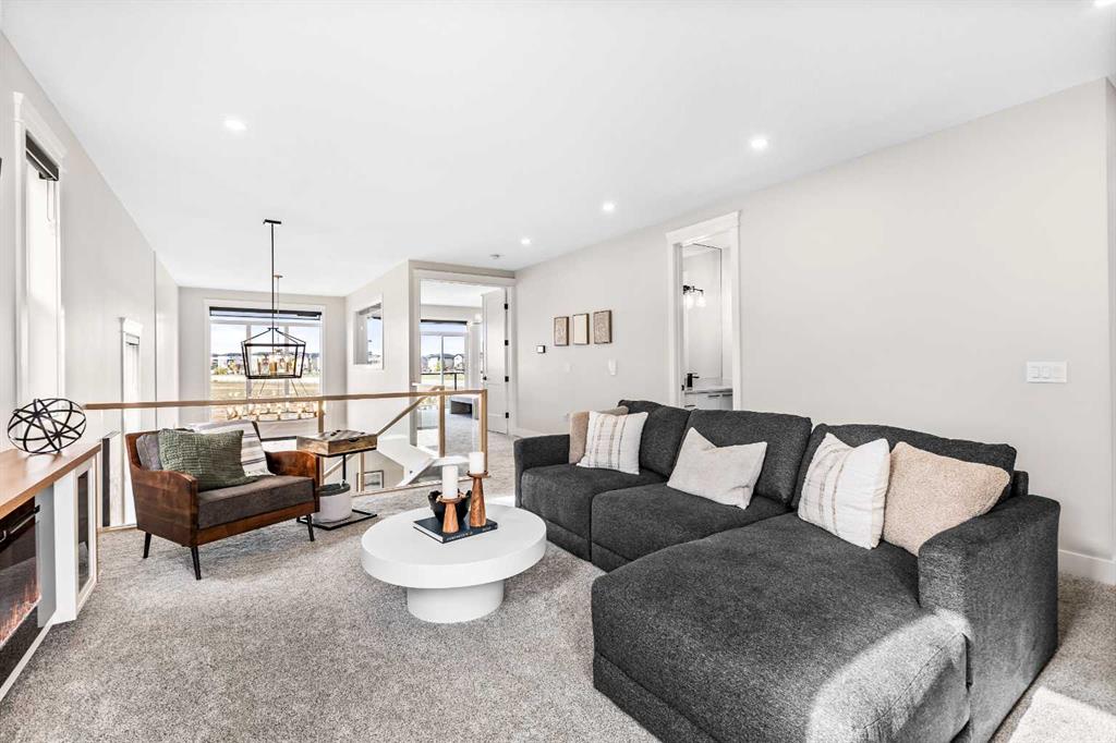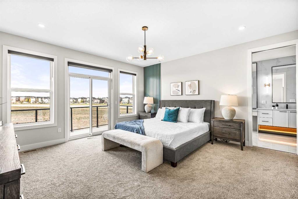 The open-to-above family room is designed to impress, showcasing a natural gas fireplace and a striking staircase with glass railings and motion-sensor lighting. Upstairs, you’ll find a spacious bonus room with a fireplace, a convenient laundry room with sink, and a luxurious primary suite complete with a 6-piece ensuite and private balcony. Two additional bedrooms share a Jack and Jill bathroom, while a fourth bedroom is paired with a separate full bath.