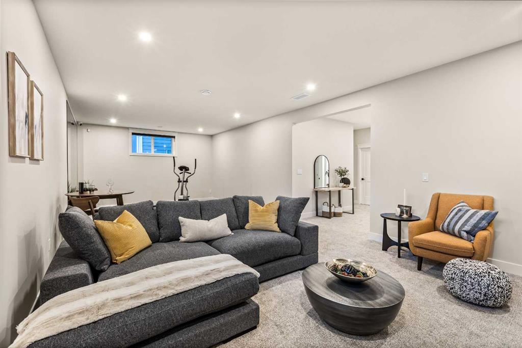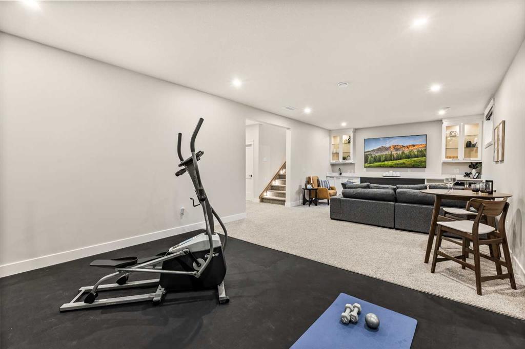 The fully finished basement includes a separate side entrance, a large recreation room with fireplace, a gym area, wet bar, two bedrooms, and a full bathroom. Completing the home is a triple-car garage, an extended exposed aggregate driveway, and a glass-railed deck—perfectly blending style, space, and functionality.
