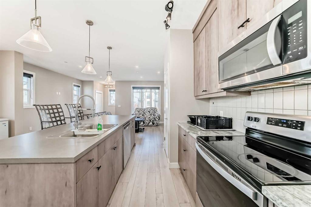 Step inside to a bright, east-facing open-concept main floor, where large windows fill the space with beautiful natural morning light. The inviting living area seamlessly connects to the upgraded modern kitchen featuring a large kitchen island, sleek cabinetry, ample counter space, and a spacious dining area—perfect for everyday living and entertaining.